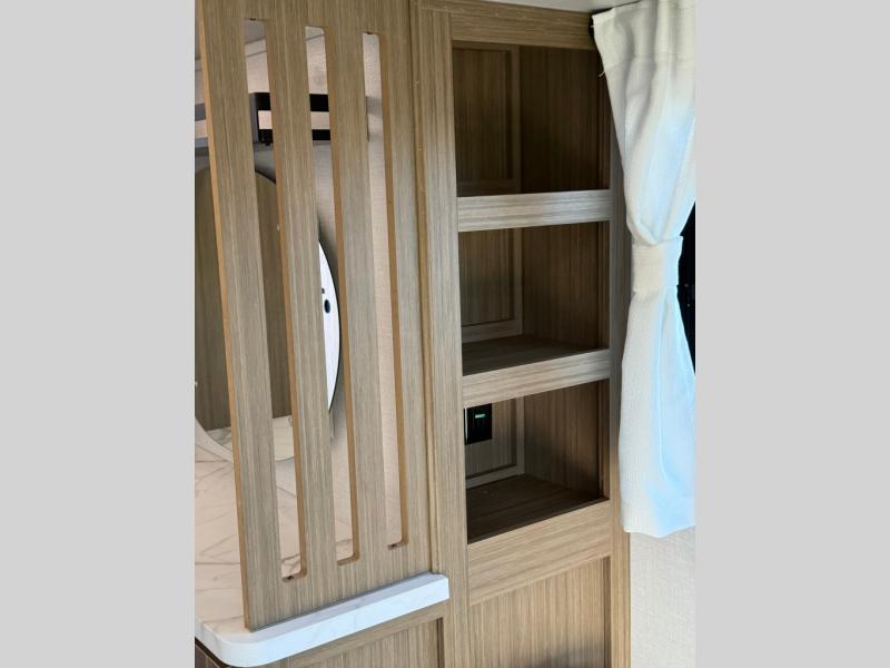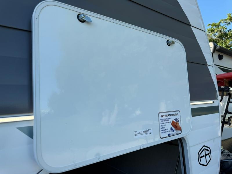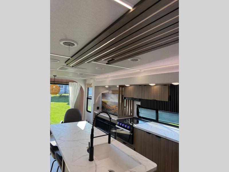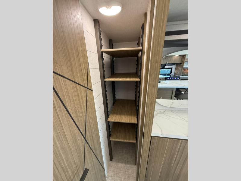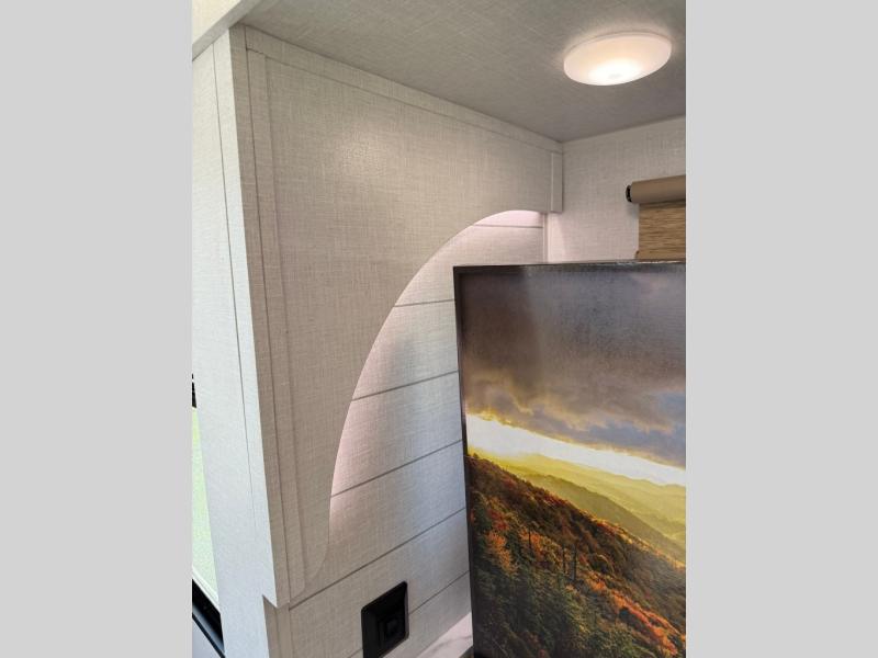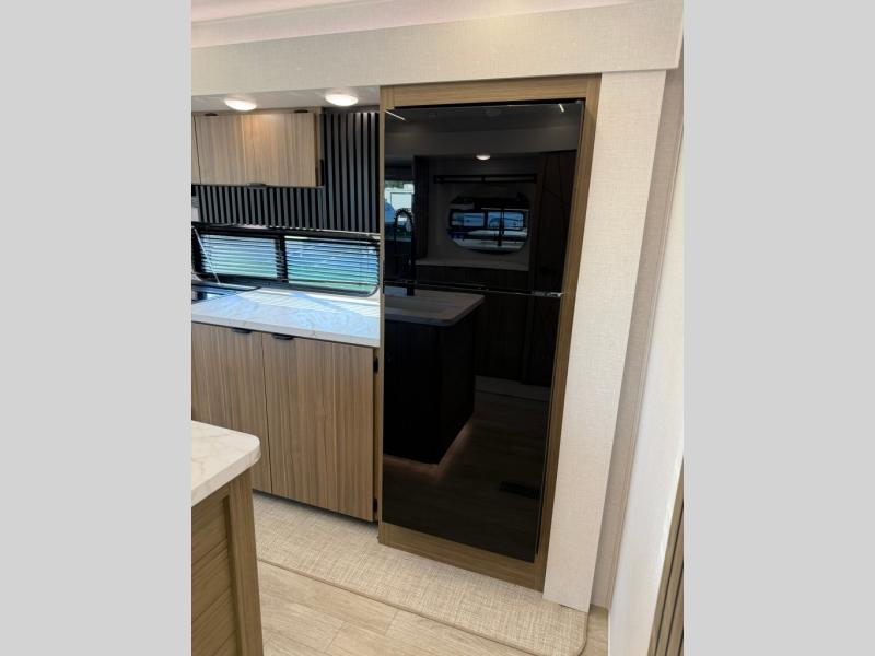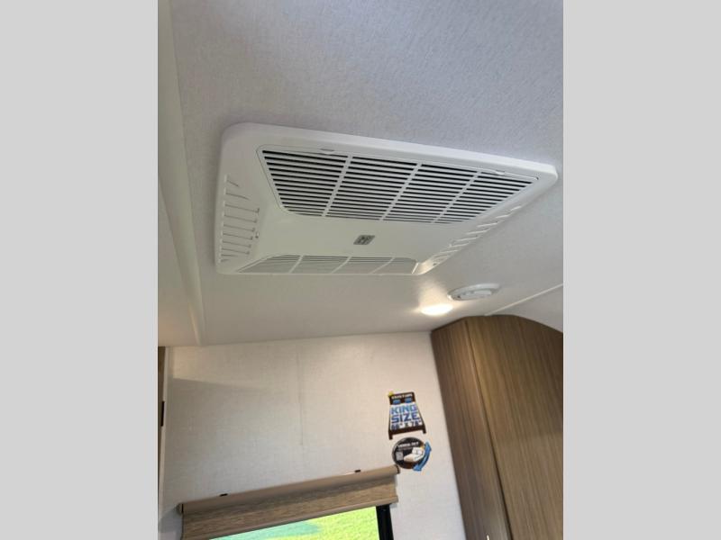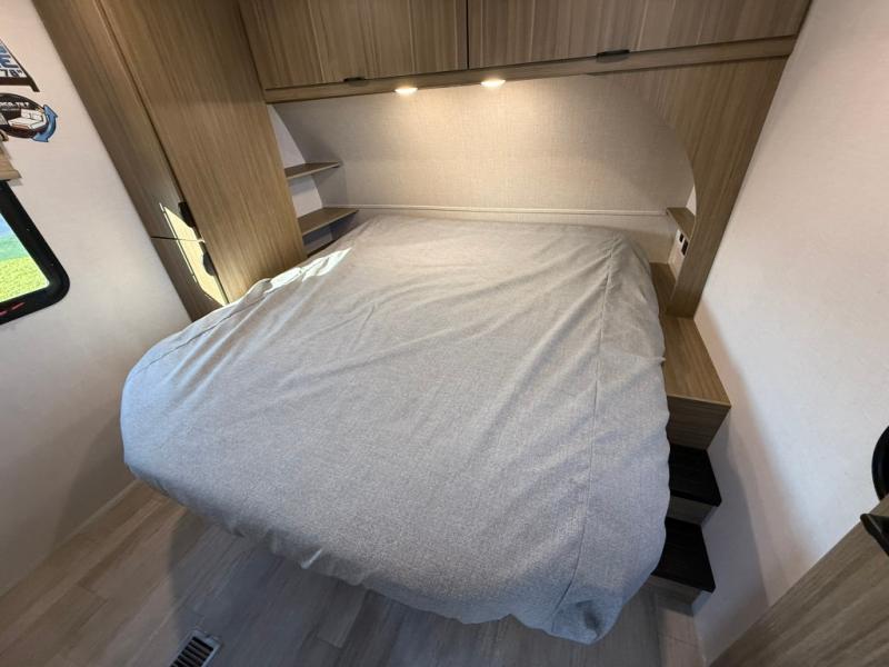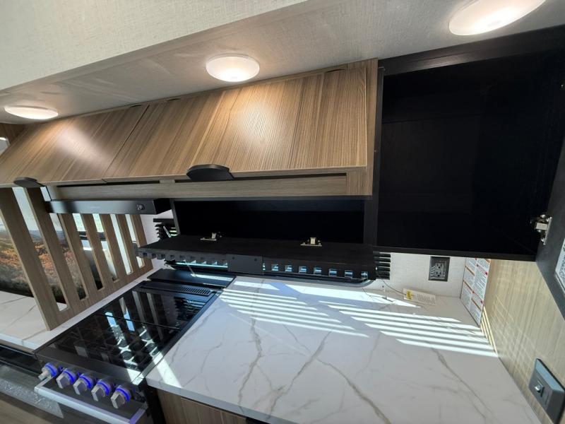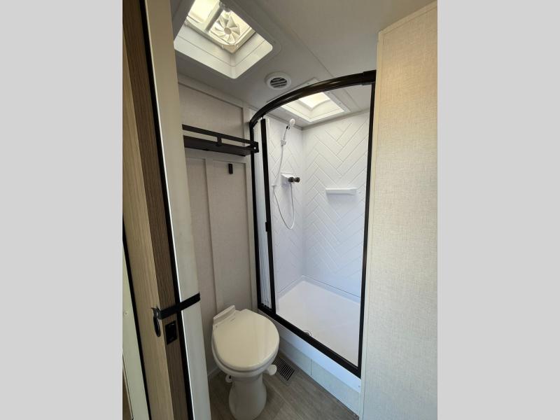 Find your zen int this spacious travel trailer for four! Once you've unloaded your gear, you can head inside to make lunch at the kitchen island with four chairs. An 80" trundle sofa provides additional seating space plus sleeping space for guests. You will love the rear custom recliners that are conveniently located next to the fireplace. The full bath is located towards the front next to the private bedroom so you can easily use the restroom at night, and you're sure to get a great night's rest on the custom king bed with Versa Tilt. This unit also includes washer and dryer prep, giving you the option to add these appliances.