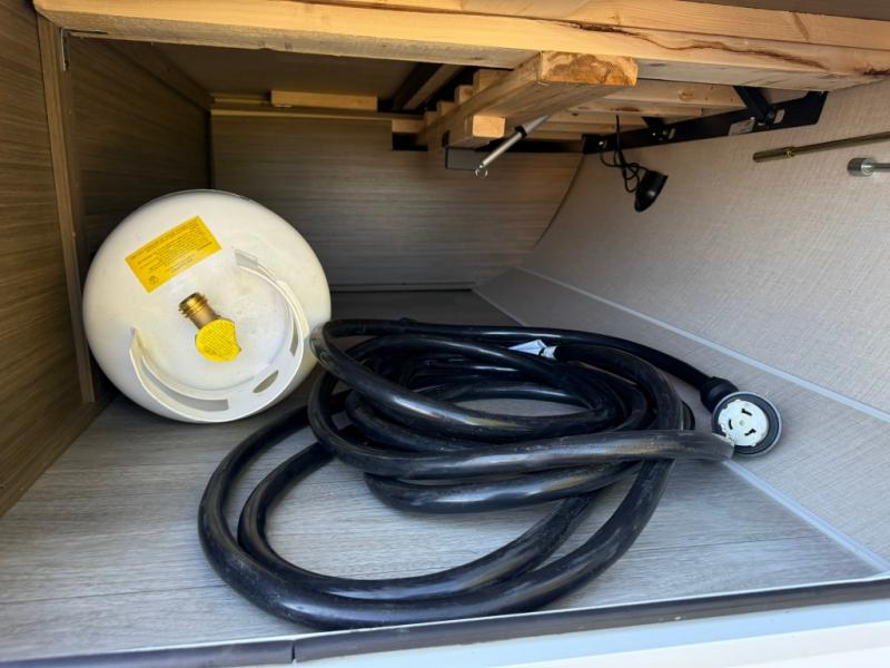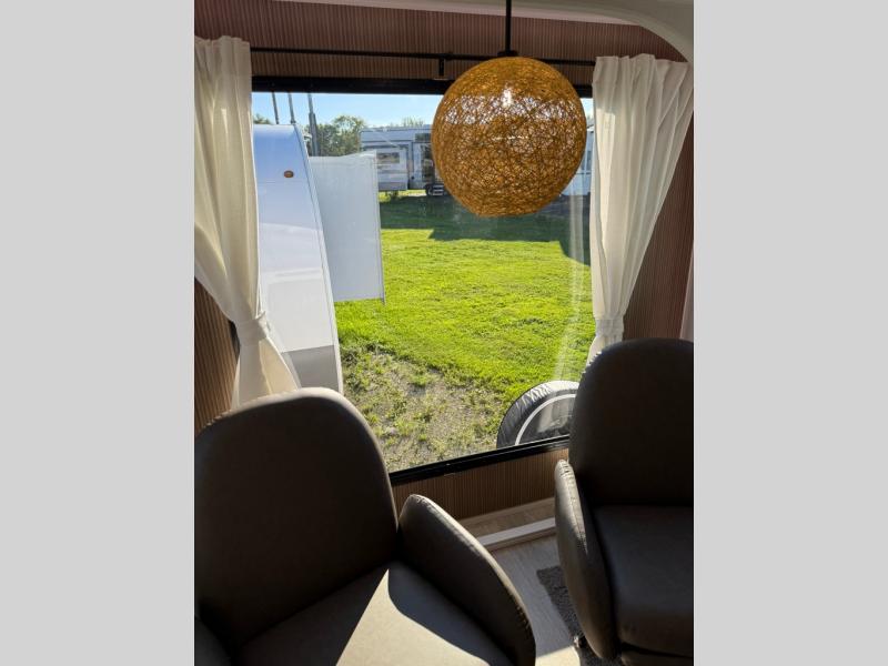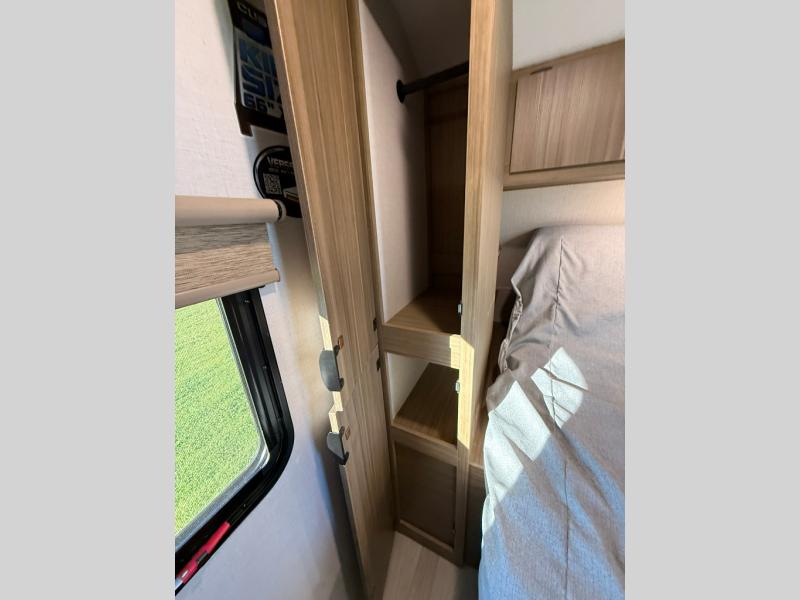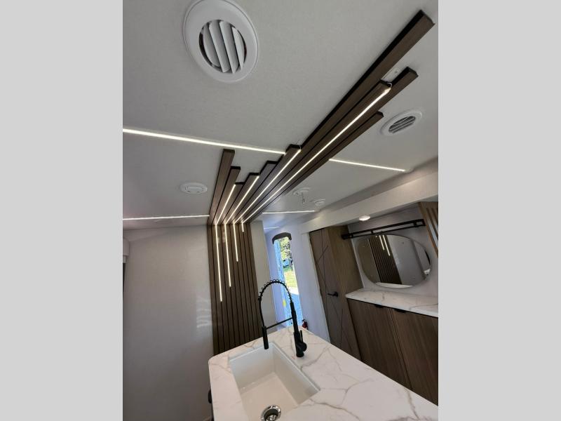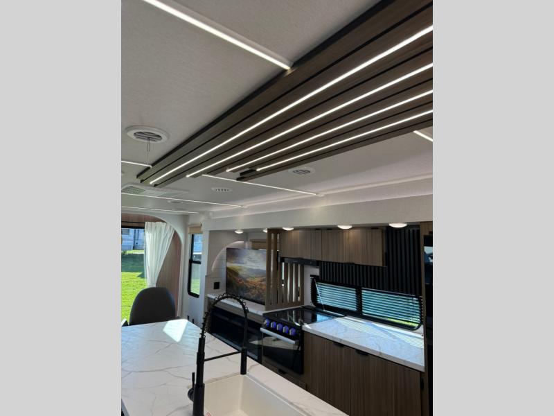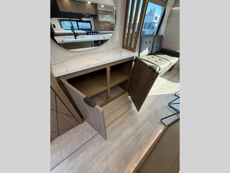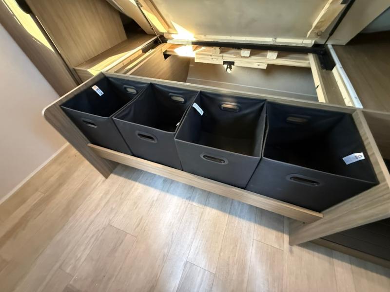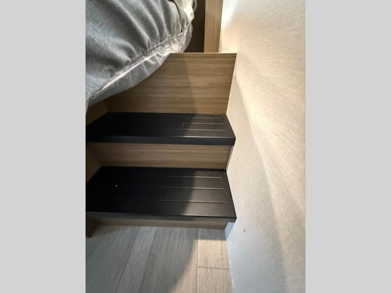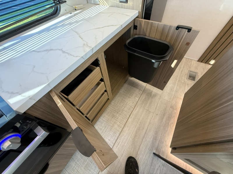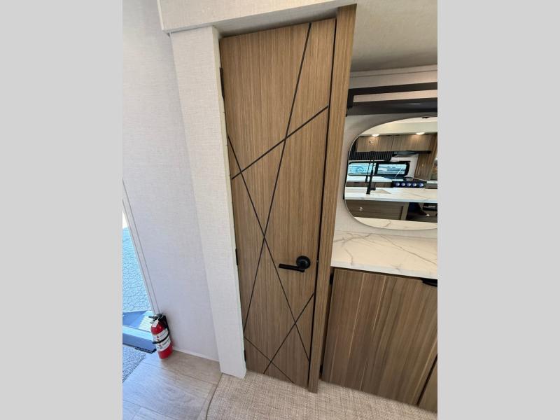 Find your zen int this spacious travel trailer for four! Once you've unloaded your gear, you can head inside to make lunch at the kitchen island with four chairs. An 80" trundle sofa provides additional seating space plus sleeping space for guests. You will love the rear custom recliners that are conveniently located next to the fireplace. The full bath is located towards the front next to the private bedroom so you can easily use the restroom at night, and you're sure to get a great night's rest on the custom king bed with Versa Tilt. This unit also includes washer and dryer prep, giving you the option to add these appliances.