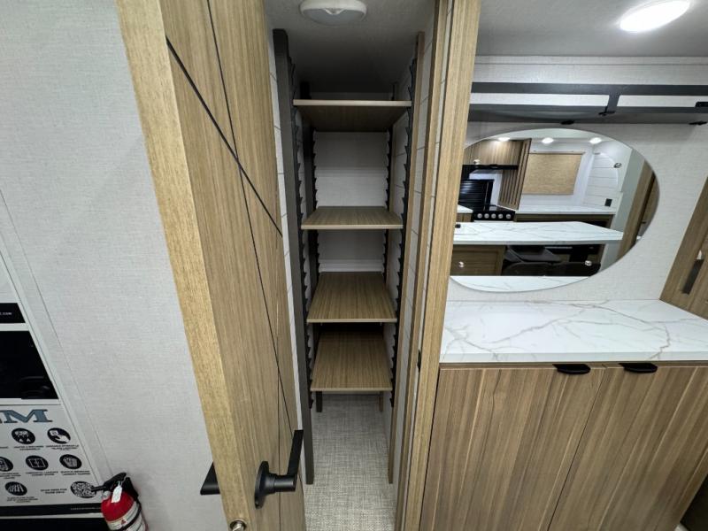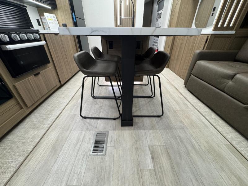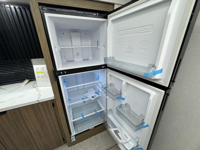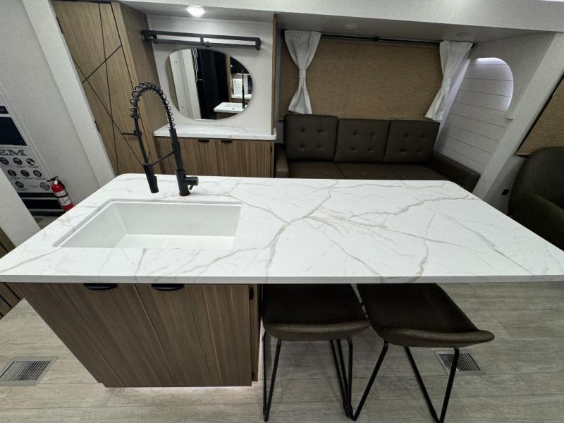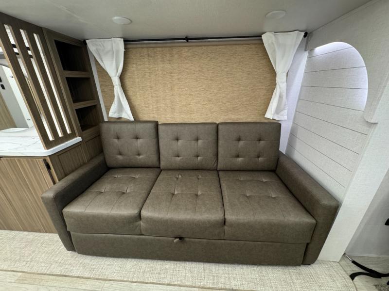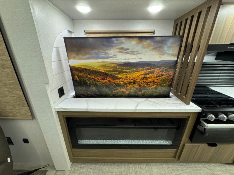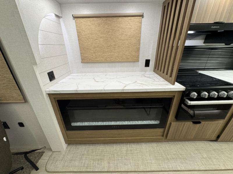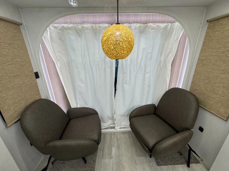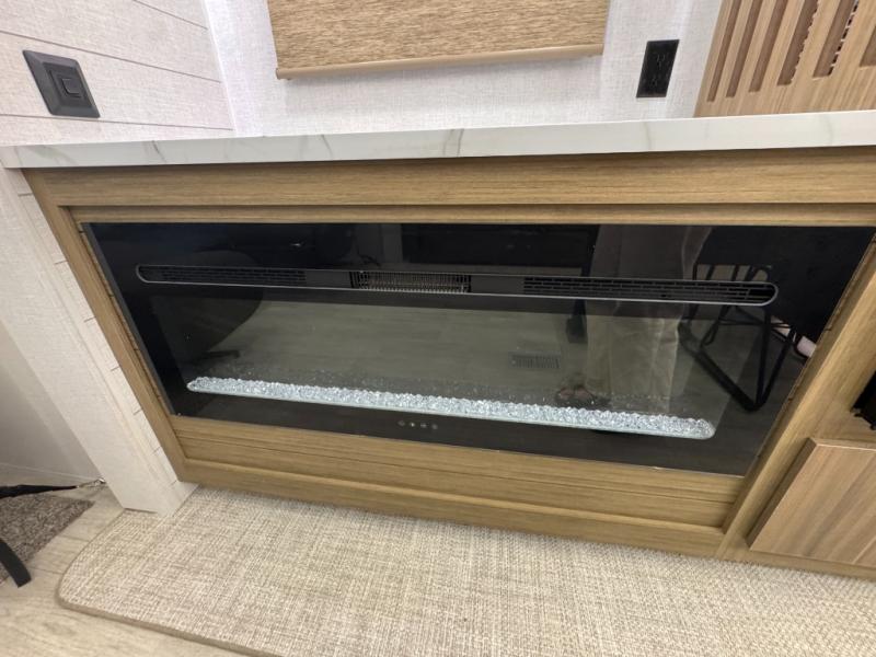 Find your zen int this spacious travel trailer for four! Once you've unloaded your gear, you can head inside to make lunch at the kitchen island with four chairs. An 80" trundle sofa provides additional seating space plus sleeping space for guests. You will love the rear custom recliners that are conveniently located next to the fireplace. The full bath is located towards the front next to the private bedroom so you can easily use the restroom at night, and you're sure to get a great night's rest on the custom king bed with Versa Tilt. This unit also includes washer and dryer prep, giving you the option to add these appliances.