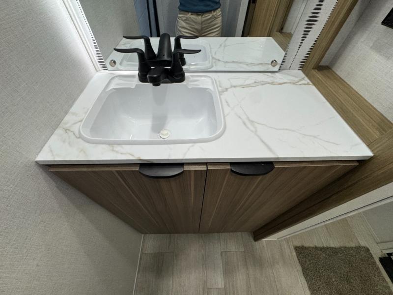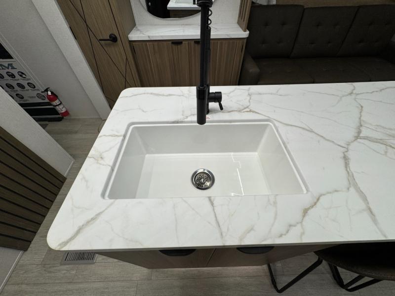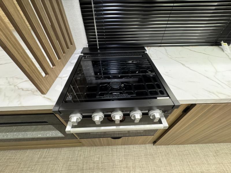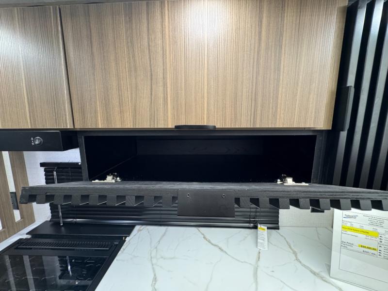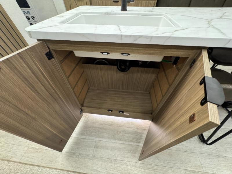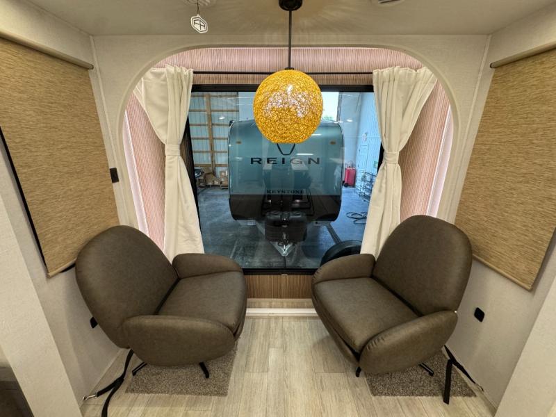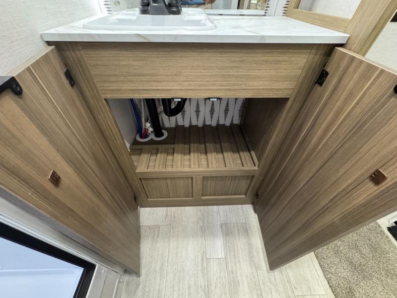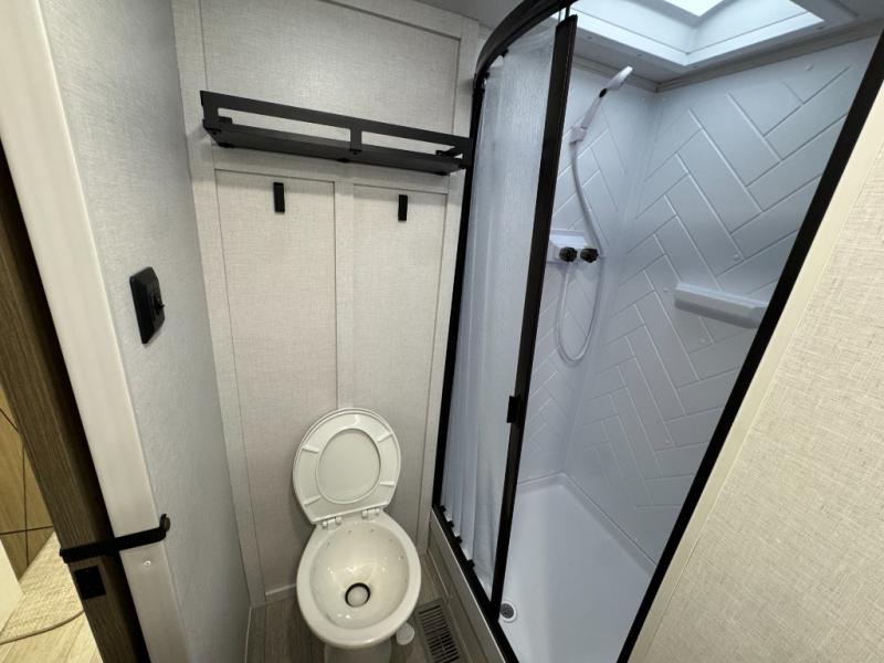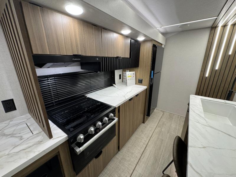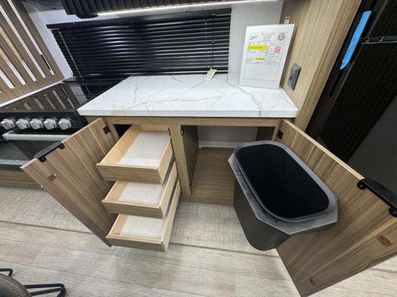 Find your zen int this spacious travel trailer for four! Once you've unloaded your gear, you can head inside to make lunch at the kitchen island with four chairs. An 80" trundle sofa provides additional seating space plus sleeping space for guests. You will love the rear custom recliners that are conveniently located next to the fireplace. The full bath is located towards the front next to the private bedroom so you can easily use the restroom at night, and you're sure to get a great night's rest on the custom king bed with Versa Tilt. This unit also includes washer and dryer prep, giving you the option to add these appliances.