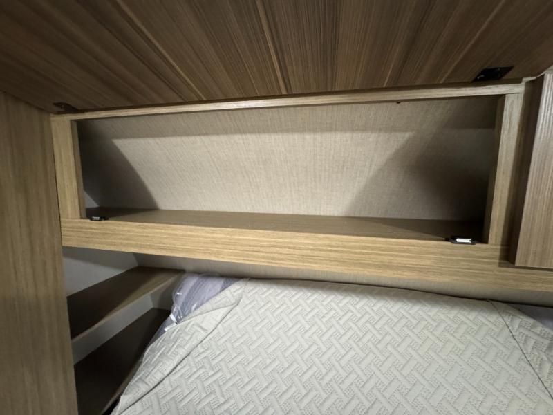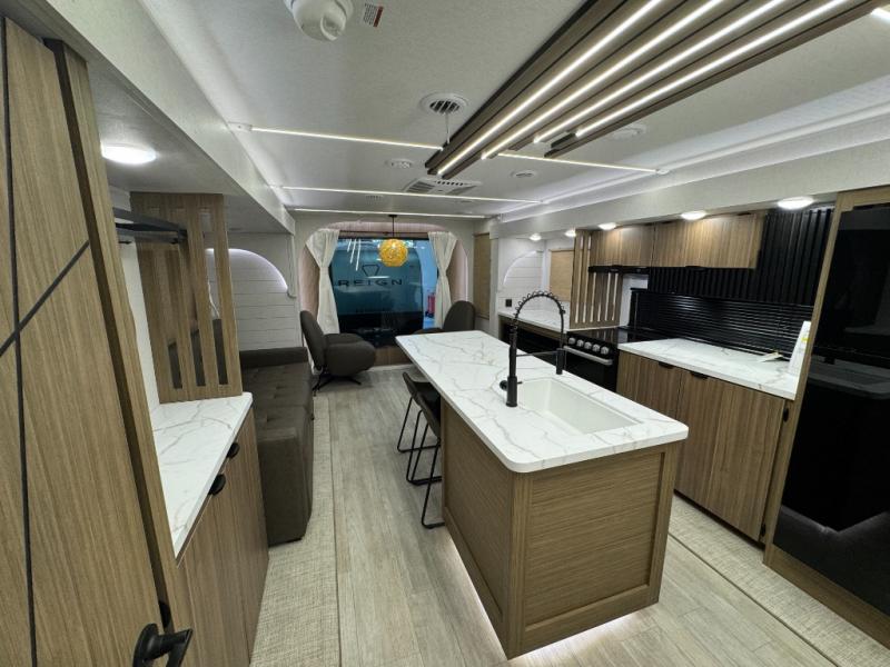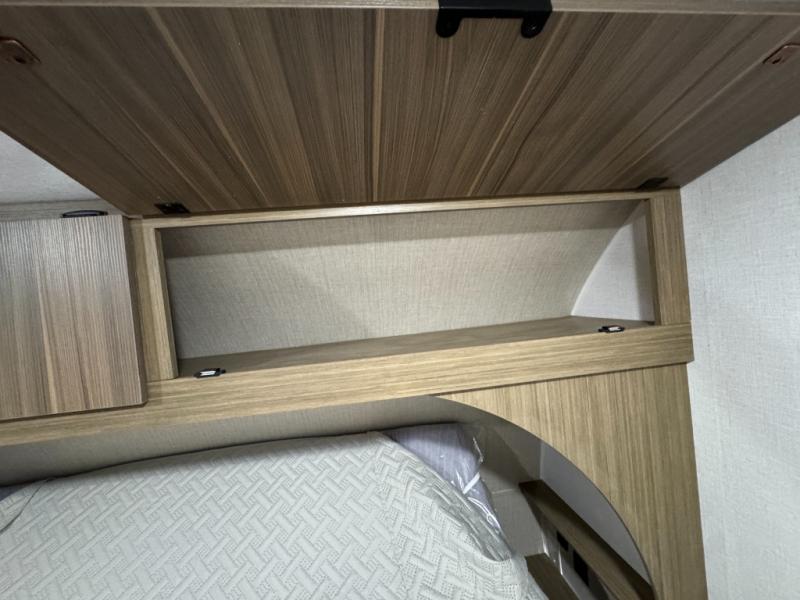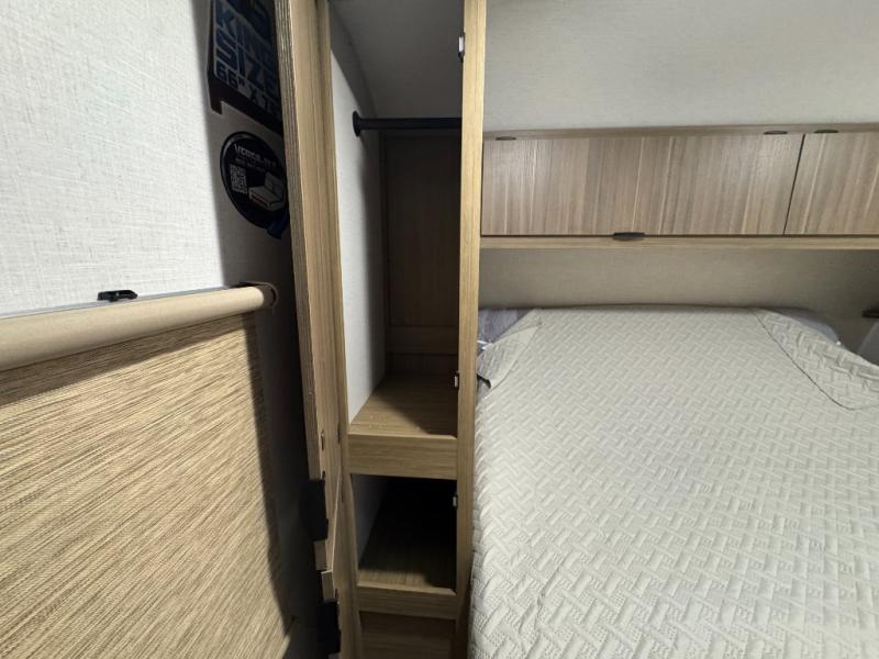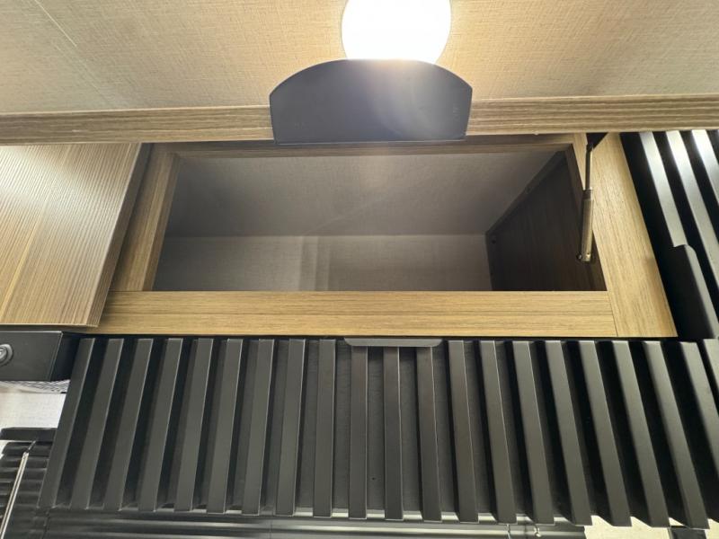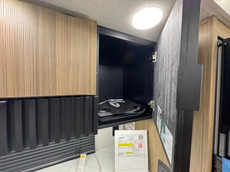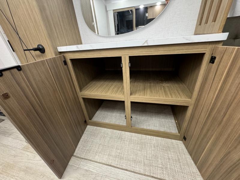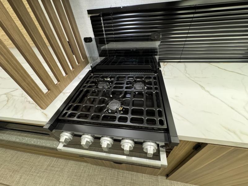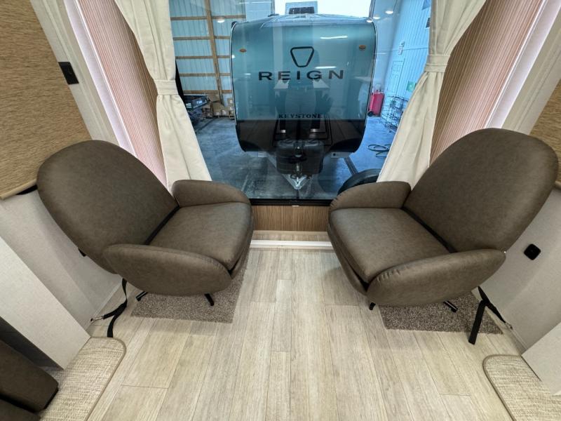 Find your zen int this spacious travel trailer for four! Once you've unloaded your gear, you can head inside to make lunch at the kitchen island with four chairs. An 80" trundle sofa provides additional seating space plus sleeping space for guests. You will love the rear custom recliners that are conveniently located next to the fireplace. The full bath is located towards the front next to the private bedroom so you can easily use the restroom at night, and you're sure to get a great night's rest on the custom king bed with Versa Tilt. This unit also includes washer and dryer prep, giving you the option to add these appliances.