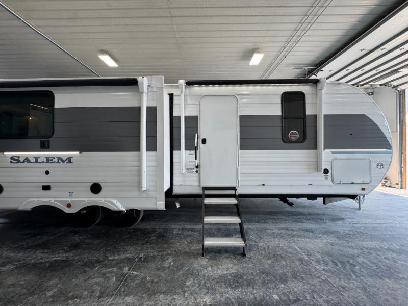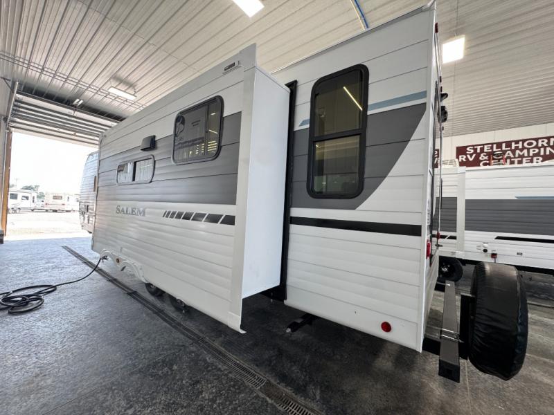 The Salem travel trailers are packed with hassle-free camping amenities and there are a variety of floorplans to choose from. The heated and enclosed Accessibelly will help protect against the elements and debris during transport, and the exterior retro/metal redesign is sure to be eye-catching! There are stylish roller shades inside, along with updated backsplash, elegant curtain rods and curtains, plus many more interior comforts! Choose a Salem travel trailer today for quality and value!