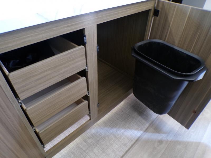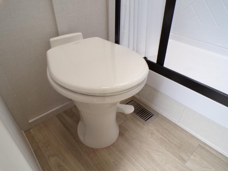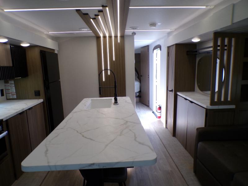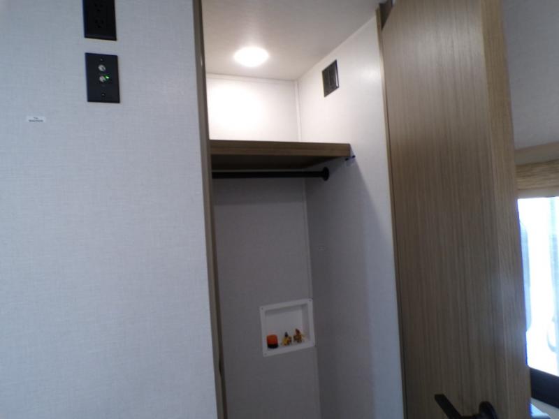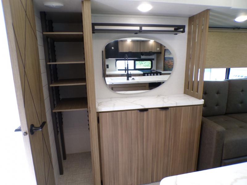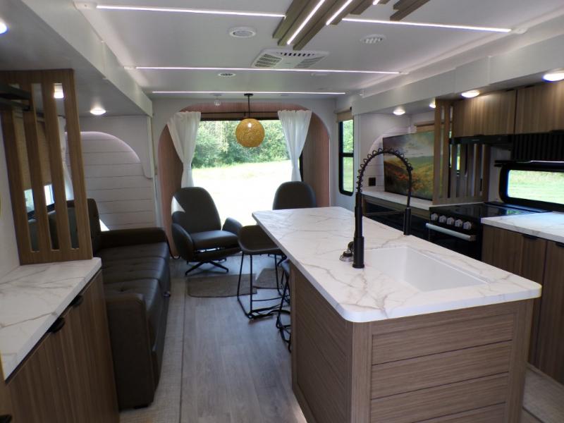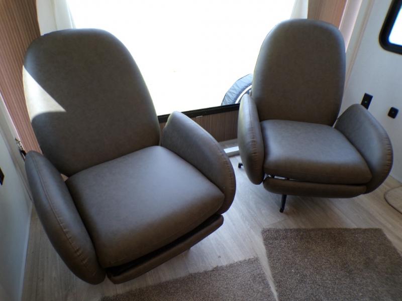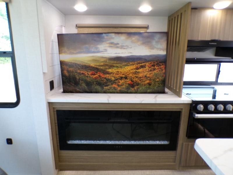 Find your zen int this spacious travel trailer for four! Once you've unloaded your gear, you can head inside to make lunch at the kitchen island with four chairs. An 80" trundle sofa provides additional seating space plus sleeping space for guests. You will love the rear custom recliners that are conveniently located next to the fireplace. The full bath is located towards the front next to the private bedroom so you can easily use the restroom at night, and you're sure to get a great night's rest on the custom king bed with Versa Tilt. This unit also includes washer and dryer prep, giving you the option to add these appliances.