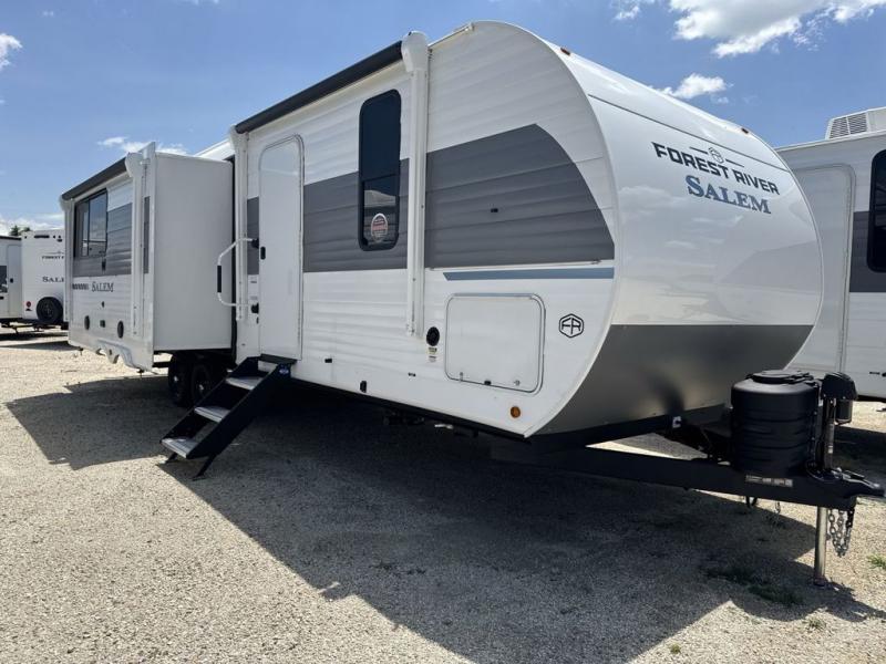 The Salem travel trailers are packed with hassle-free camping amenities and there are a variety of floorplans to choose from. The heated and enclosed Accessibelly will help protect against the elements and debris during transport, and the exterior retro/metal redesign is sure to be eye-catching! There are stylish roller shades inside, along with updated backsplash, elegant curtain rods and curtains, plus many more interior comforts! Choose a Salem travel trailer today for quality and value!