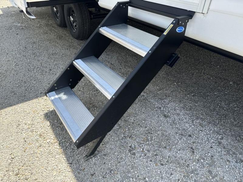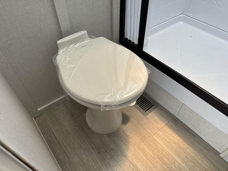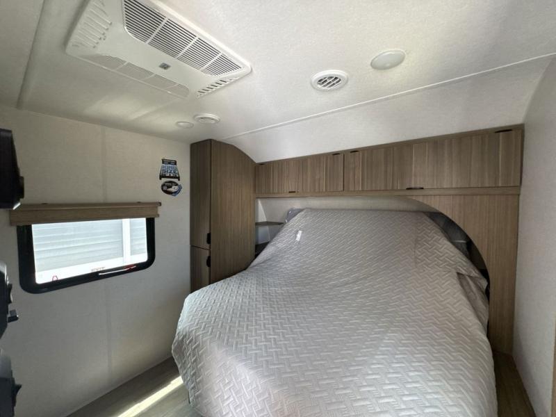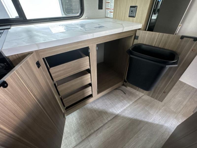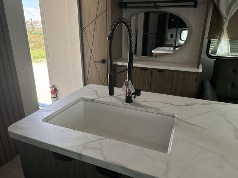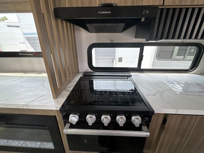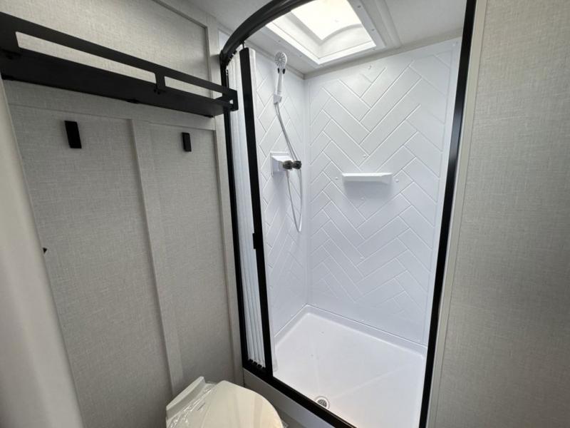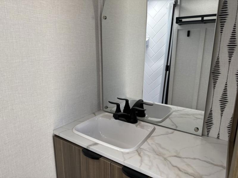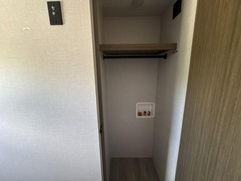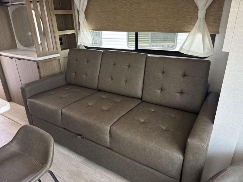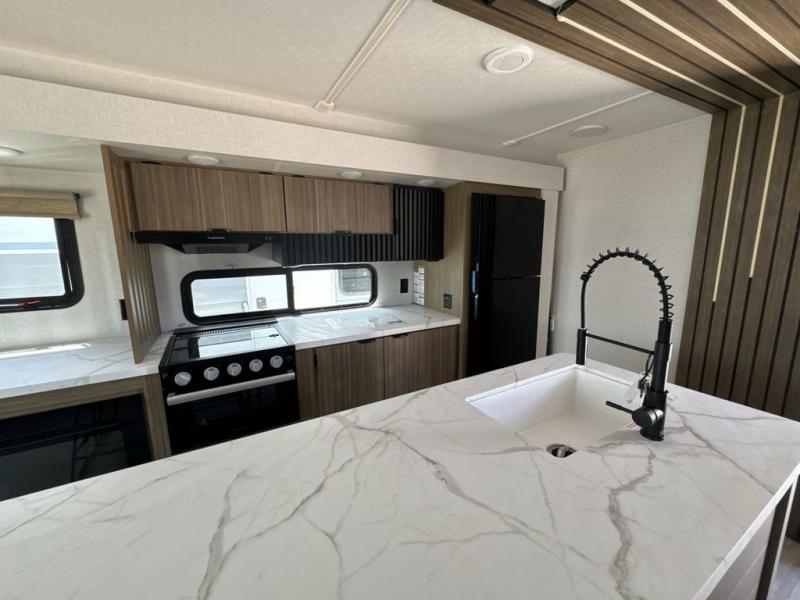 Find your zen int this spacious travel trailer for four! Once you've unloaded your gear, you can head inside to make lunch at the kitchen island with four chairs. An 80" trundle sofa provides additional seating space plus sleeping space for guests. You will love the rear custom recliners that are conveniently located next to the fireplace. The full bath is located towards the front next to the private bedroom so you can easily use the restroom at night, and you're sure to get a great night's rest on the custom king bed with Versa Tilt. This unit also includes washer and dryer prep, giving you the option to add these appliances.