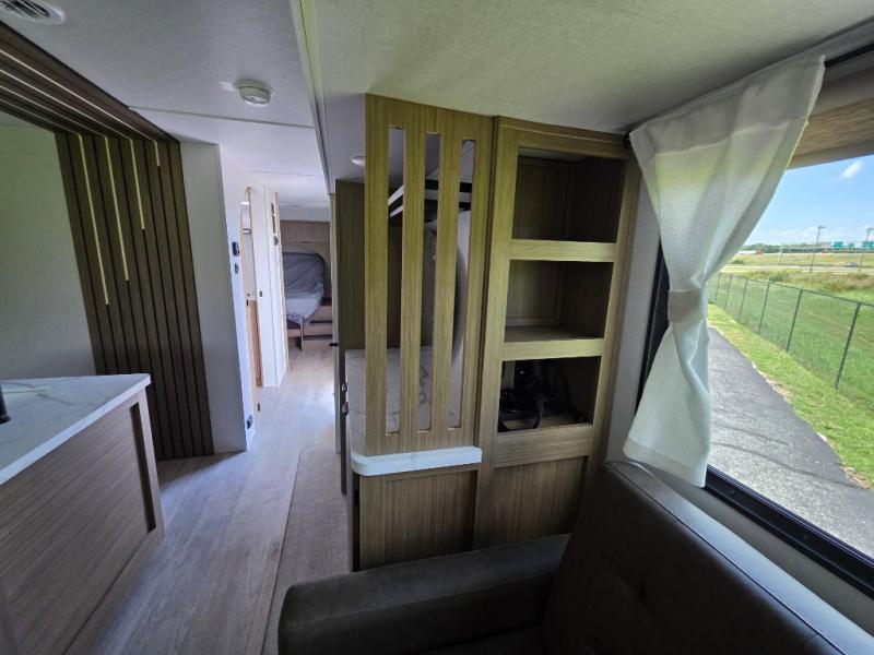Find your zen int this spacious travel trailer for four! Once you've unloaded your gear, you can head inside to make lunch at the kitchen island with four chairs. An 80" trundle sofa provides additional seating space plus sleeping space for guests. You will love the rear custom recliners that are conveniently located next to the fireplace. The full bath is located towards the front next to the private bedroom so you can easily use the restroom at night, and you're sure to get a great night's rest on the custom king bed with Versa Tilt. This unit also includes washer and dryer prep, giving you the option to add these appliances.