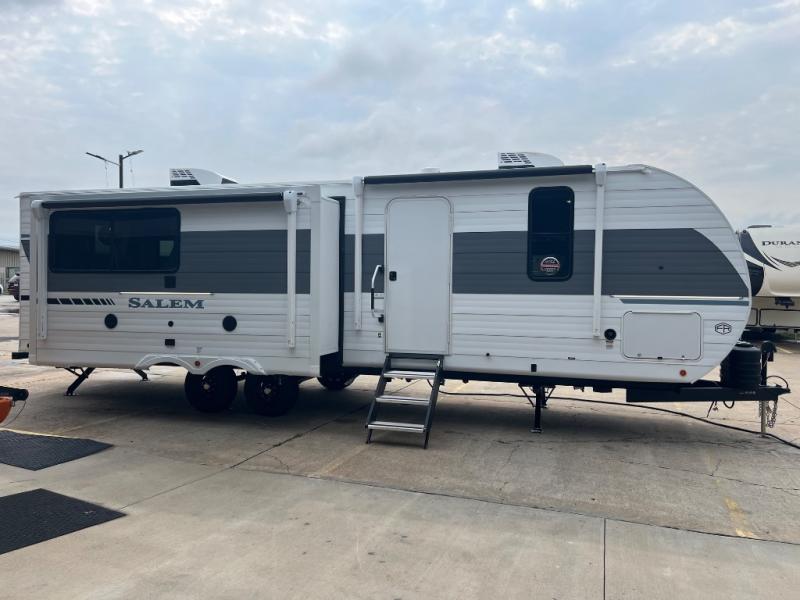 The Salem travel trailers are packed with hassle-free camping amenities and there are a variety of floorplans to choose from. The heated and enclosed Accessibelly will help protect against the elements and debris during transport, and the exterior retro/metal redesign is sure to be eye-catching! There are stylish roller shades inside, along with updated backsplash, elegant curtain rods and curtains, plus many more interior comforts! Choose a Salem travel trailer today for quality and value!