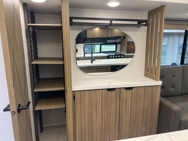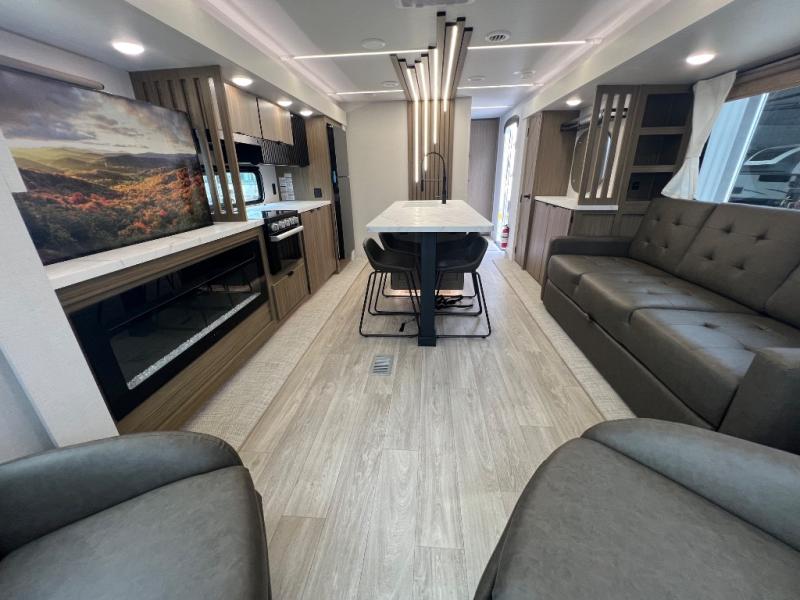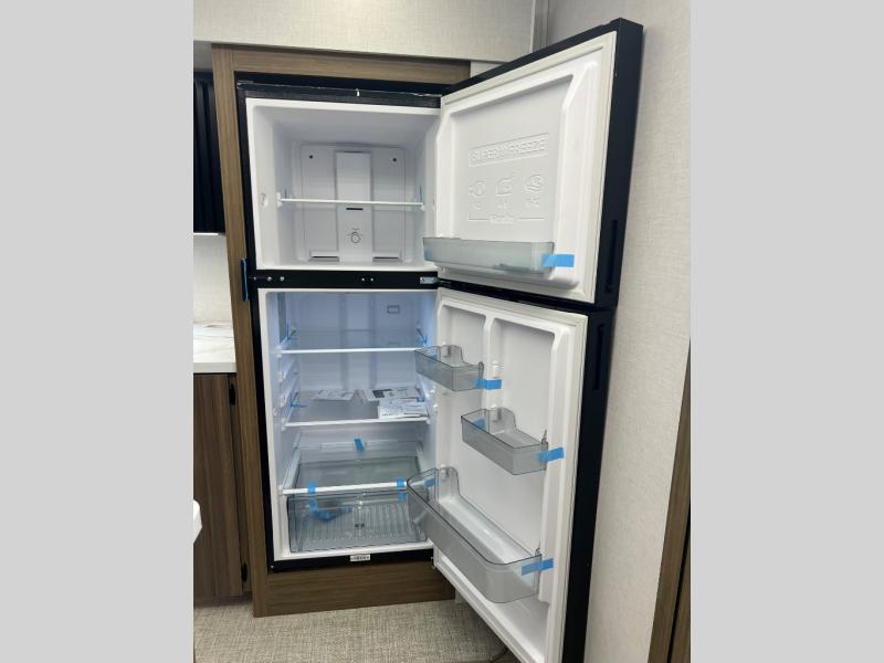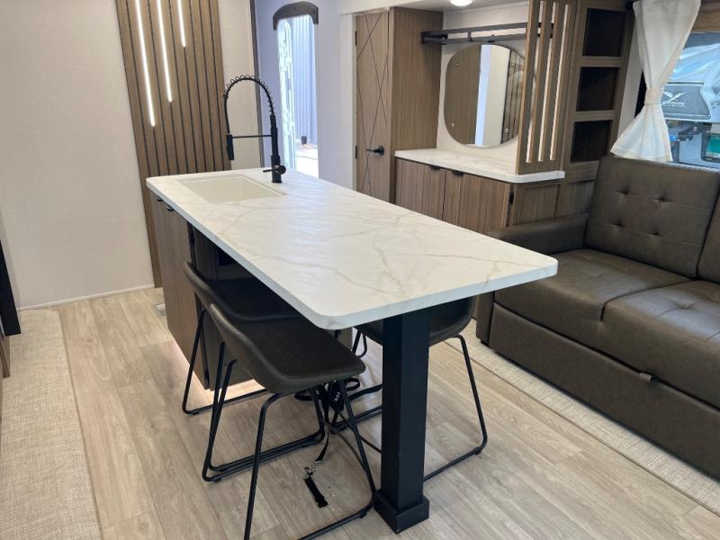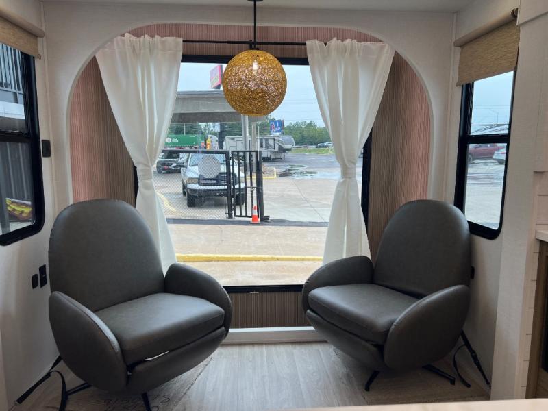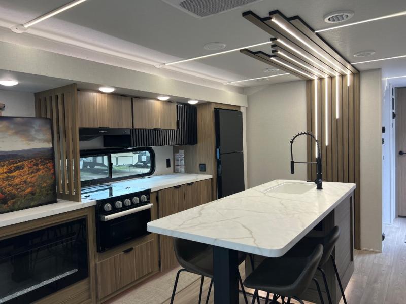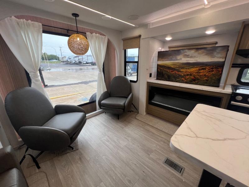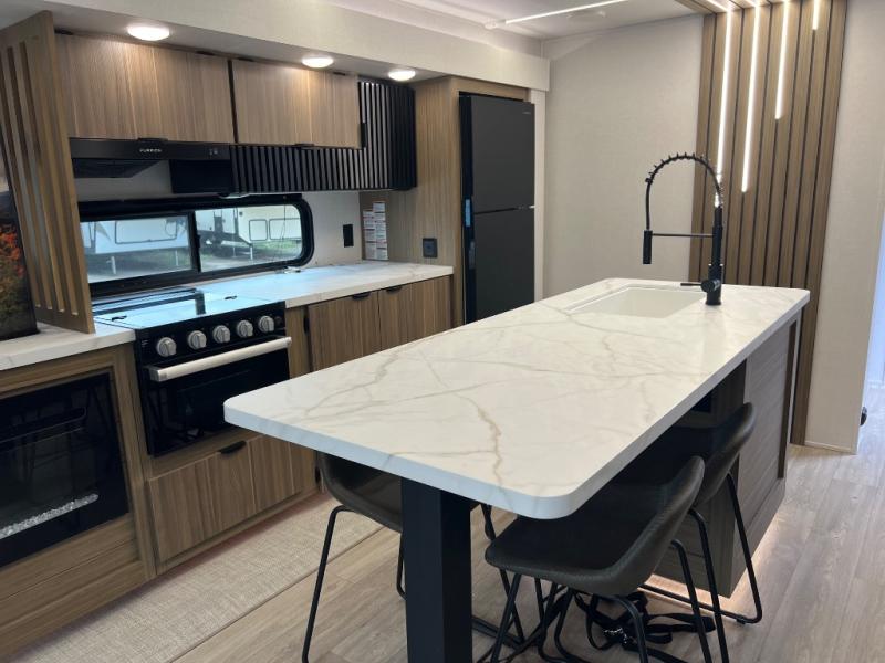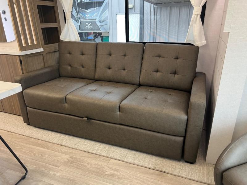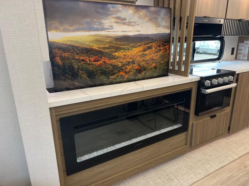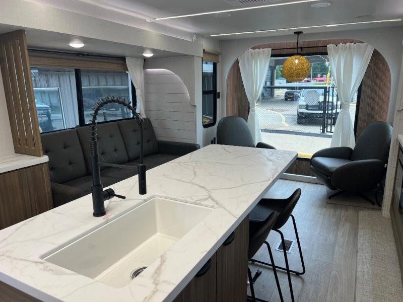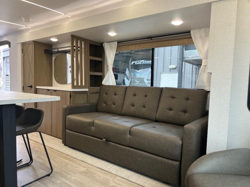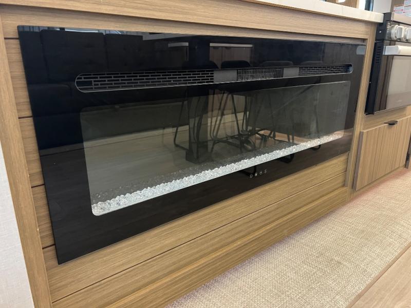 Find your zen in this spacious travel trailer for four! Once you've unloaded your gear, you can head inside to make lunch at the kitchen island with four chairs. An 80" trundle sofa provides additional seating space plus sleeping space for guests. You will love the rear custom recliners that are conveniently located next to the fireplace. The full bath is located towards the front next to the private bedroom so you can easily use the restroom at night, and you're sure to get a great night's rest on the custom king bed with Versa Tilt. This unit also includes washer and dryer prep, giving you the option to add these appliances.