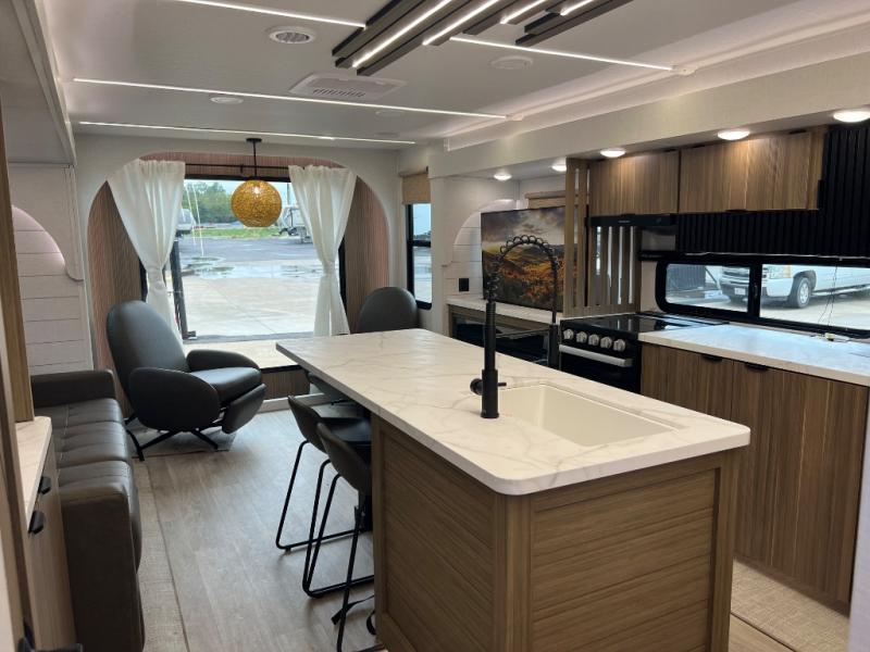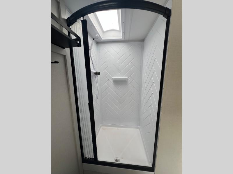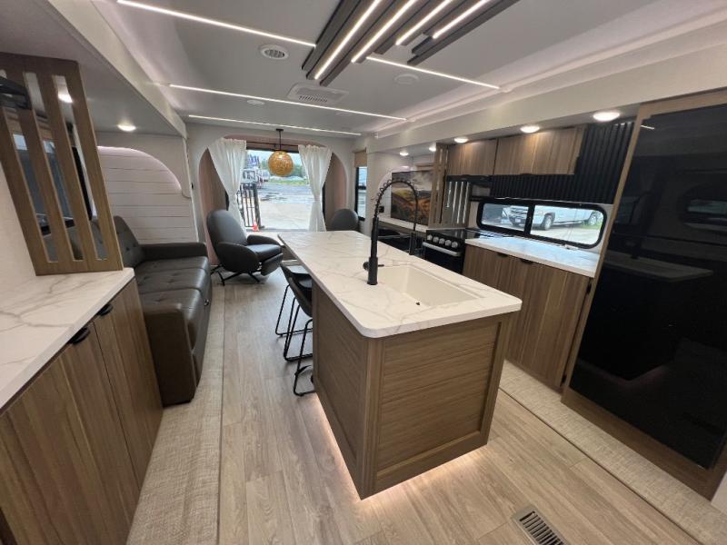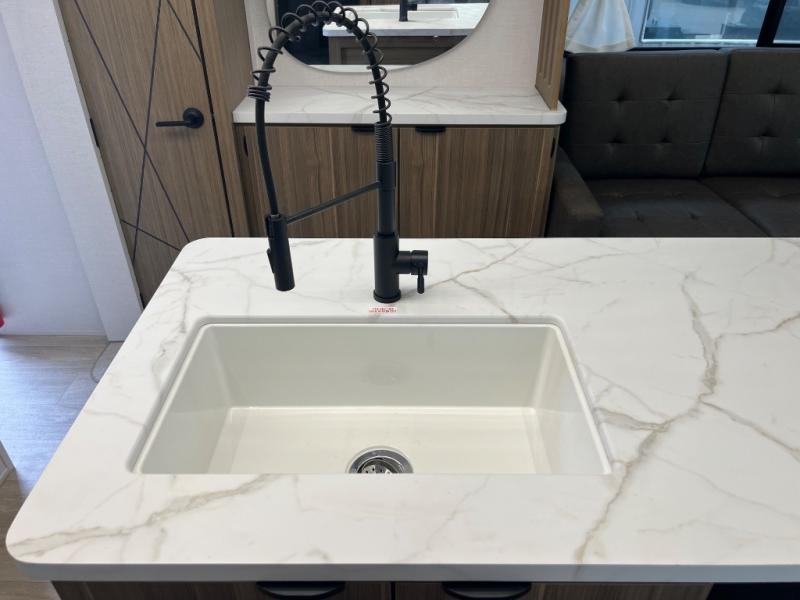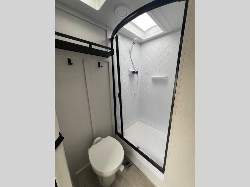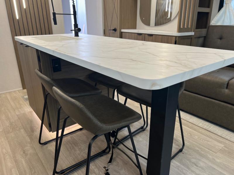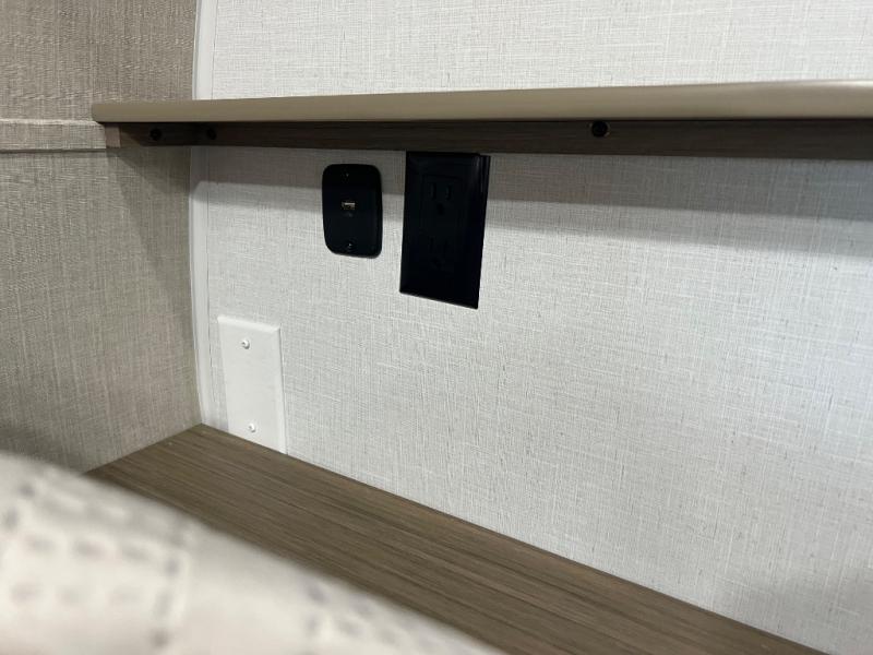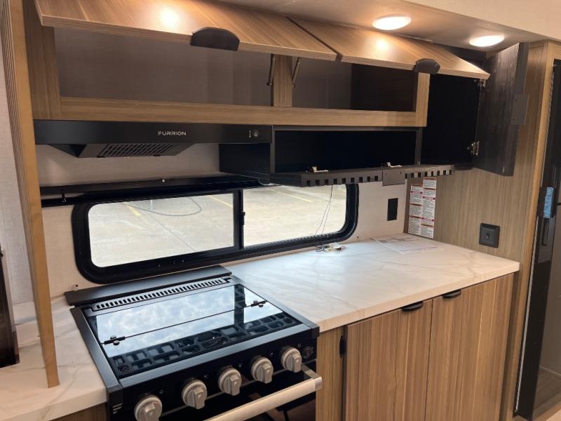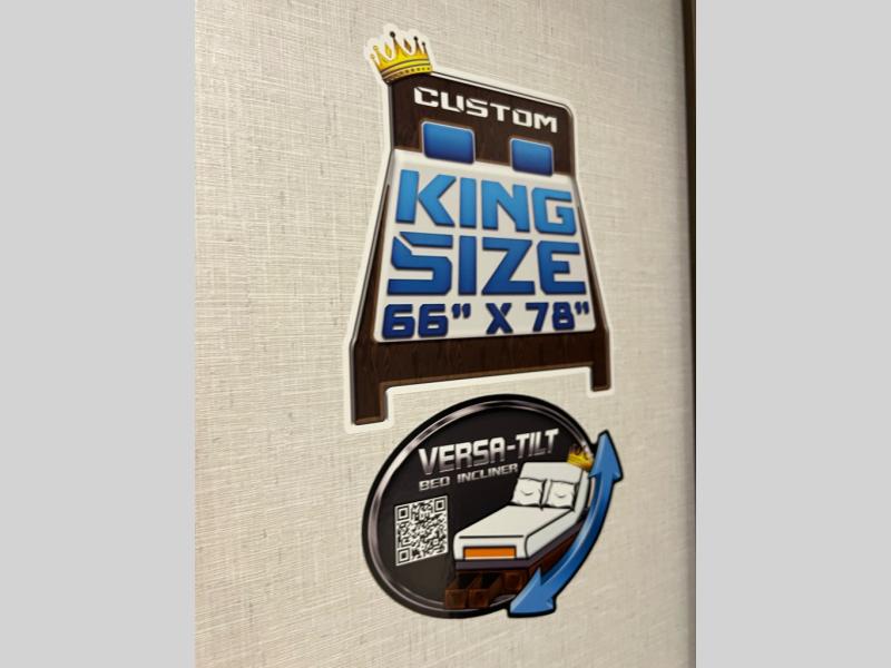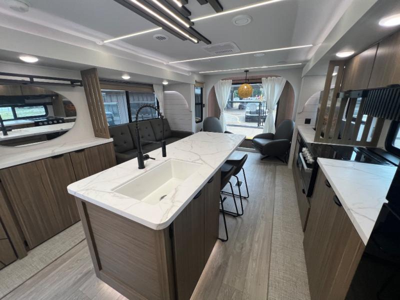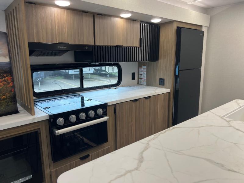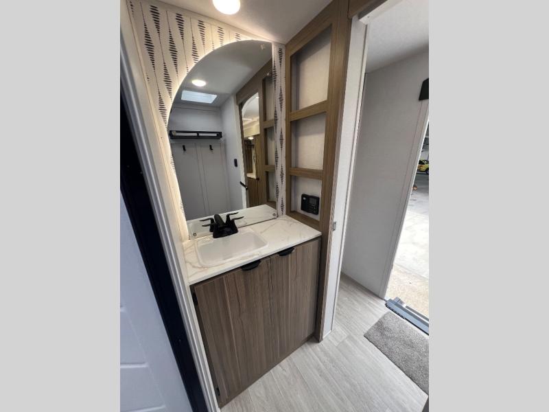 Find your zen in this spacious travel trailer for four! Once you've unloaded your gear, you can head inside to make lunch at the kitchen island with four chairs. An 80" trundle sofa provides additional seating space plus sleeping space for guests. You will love the rear custom recliners that are conveniently located next to the fireplace. The full bath is located towards the front next to the private bedroom so you can easily use the restroom at night, and you're sure to get a great night's rest on the custom king bed with Versa Tilt. This unit also includes washer and dryer prep, giving you the option to add these appliances.