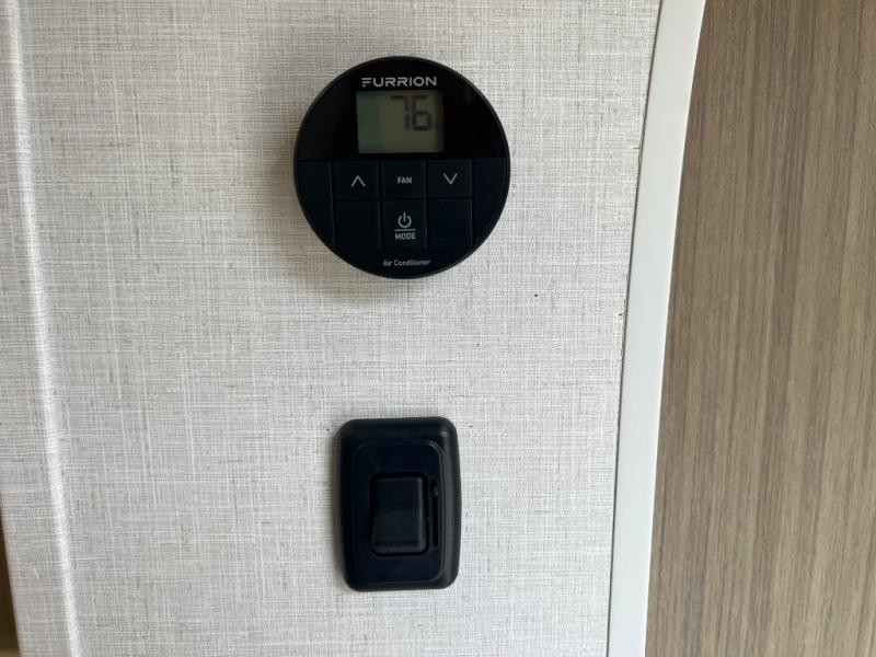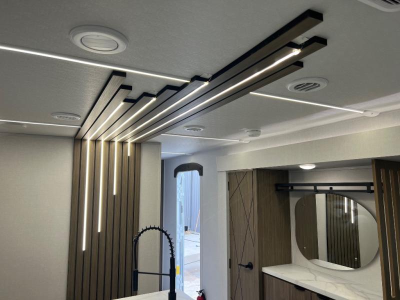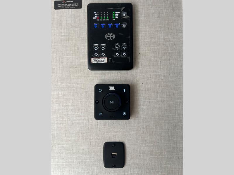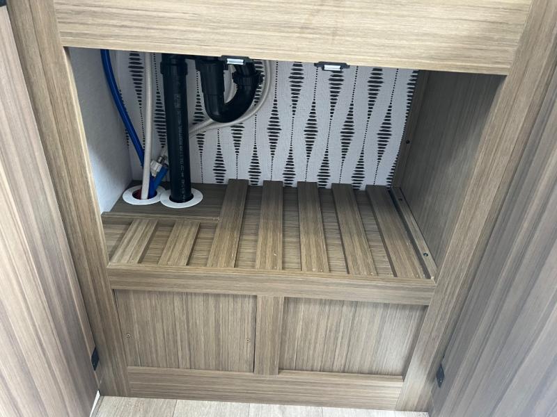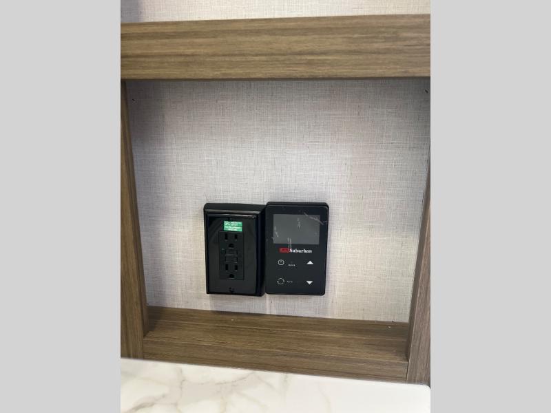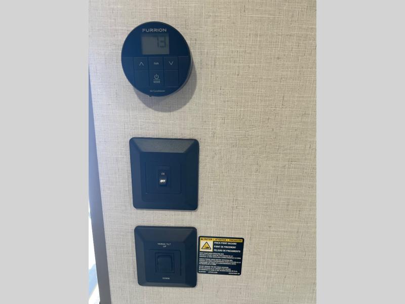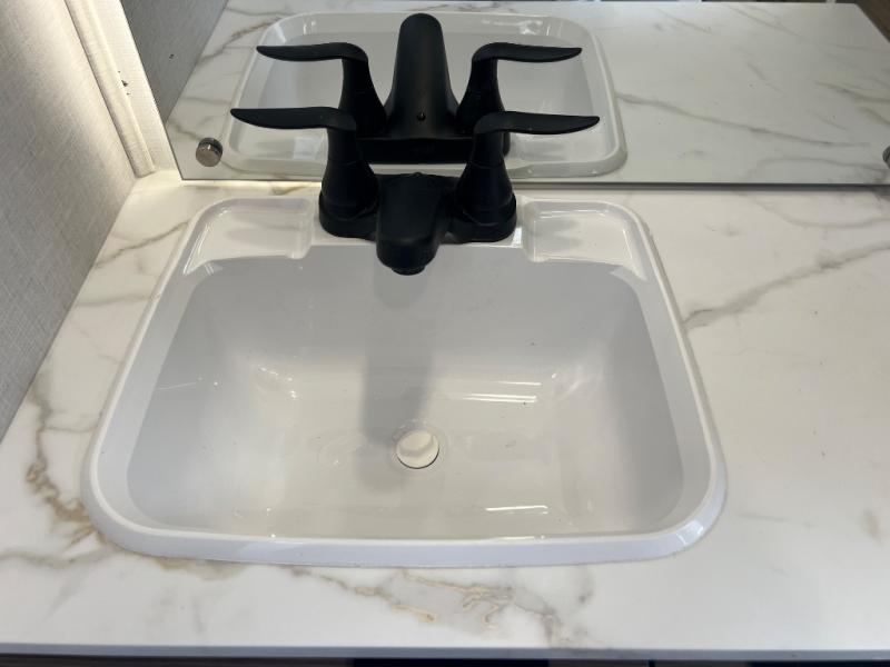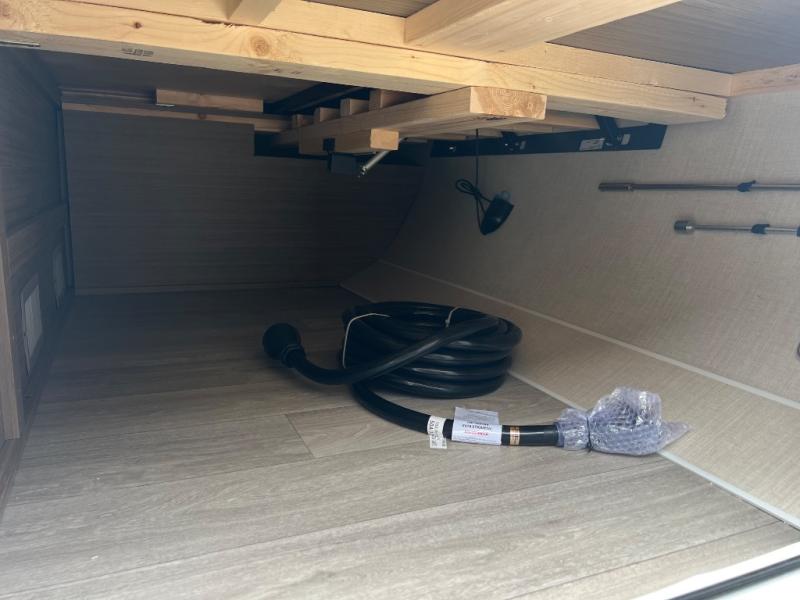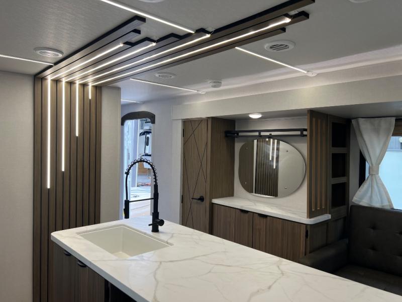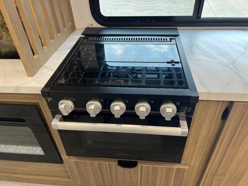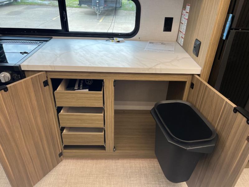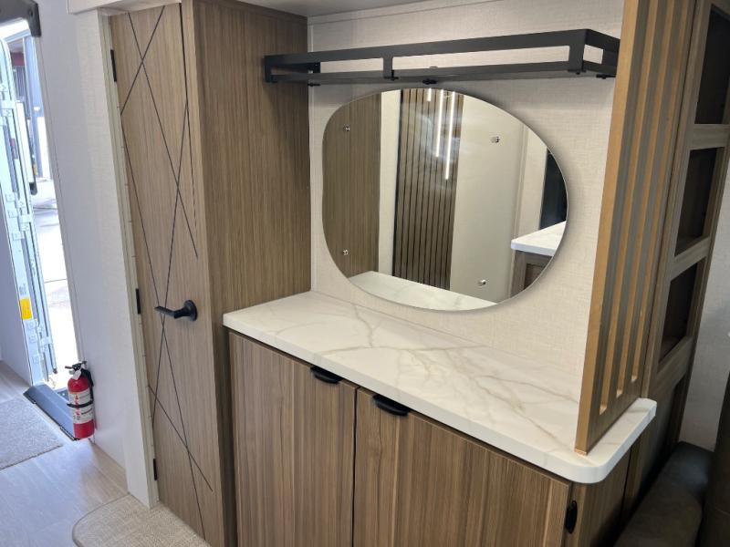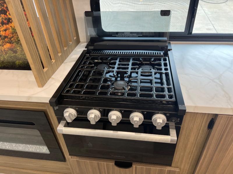 Find your zen in this spacious travel trailer for four! Once you've unloaded your gear, you can head inside to make lunch at the kitchen island with four chairs. An 80" trundle sofa provides additional seating space plus sleeping space for guests. You will love the rear custom recliners that are conveniently located next to the fireplace. The full bath is located towards the front next to the private bedroom so you can easily use the restroom at night, and you're sure to get a great night's rest on the custom king bed with Versa Tilt. This unit also includes washer and dryer prep, giving you the option to add these appliances.