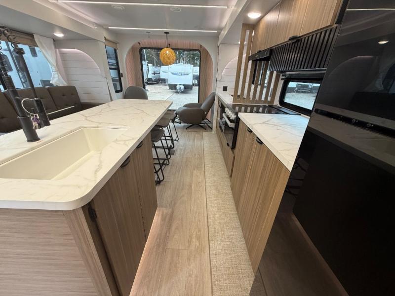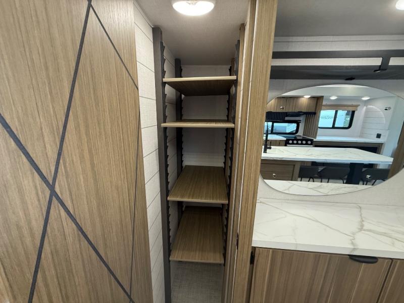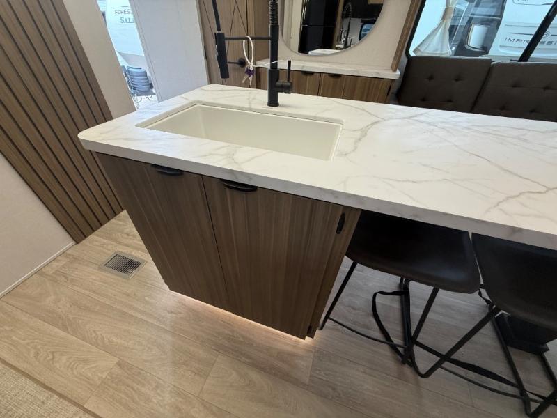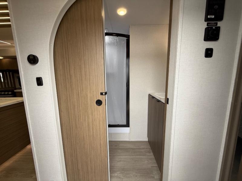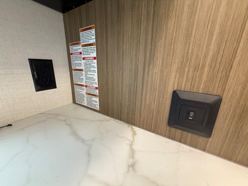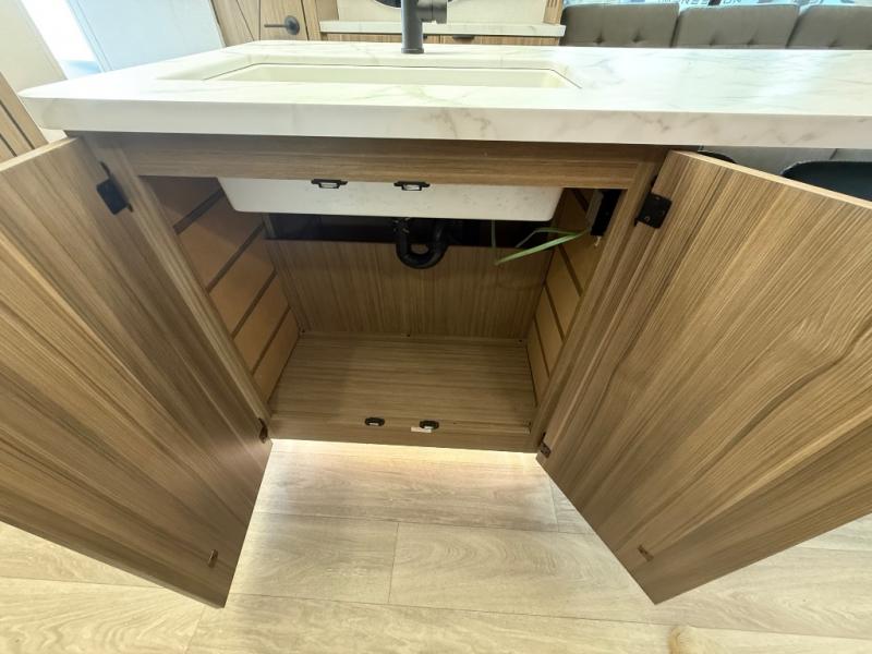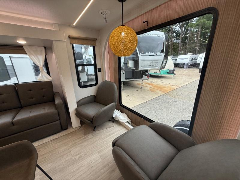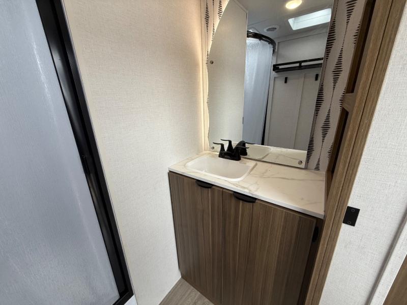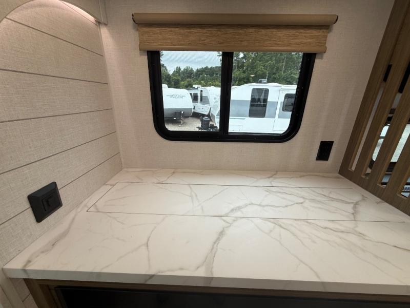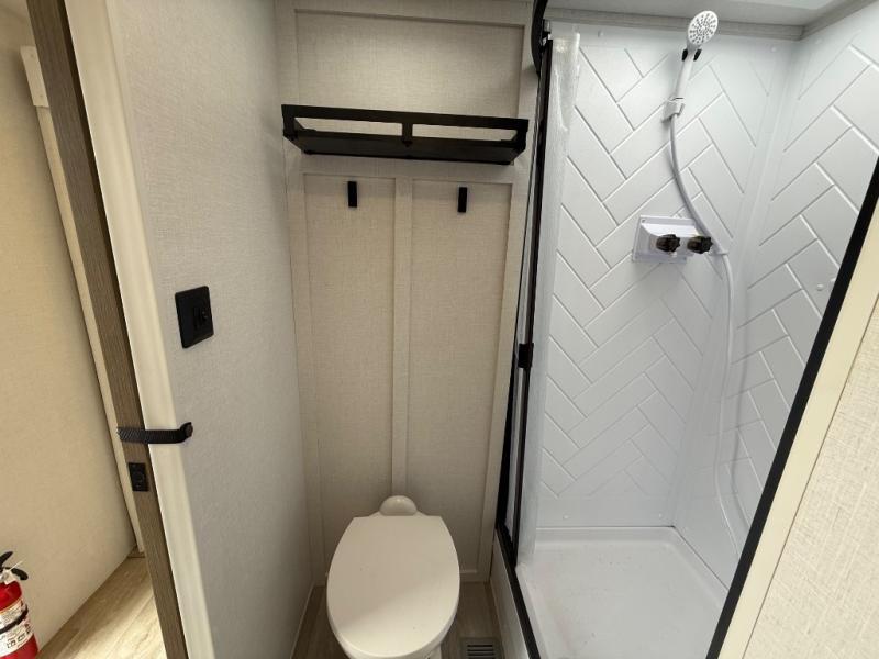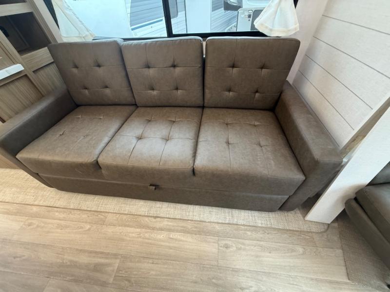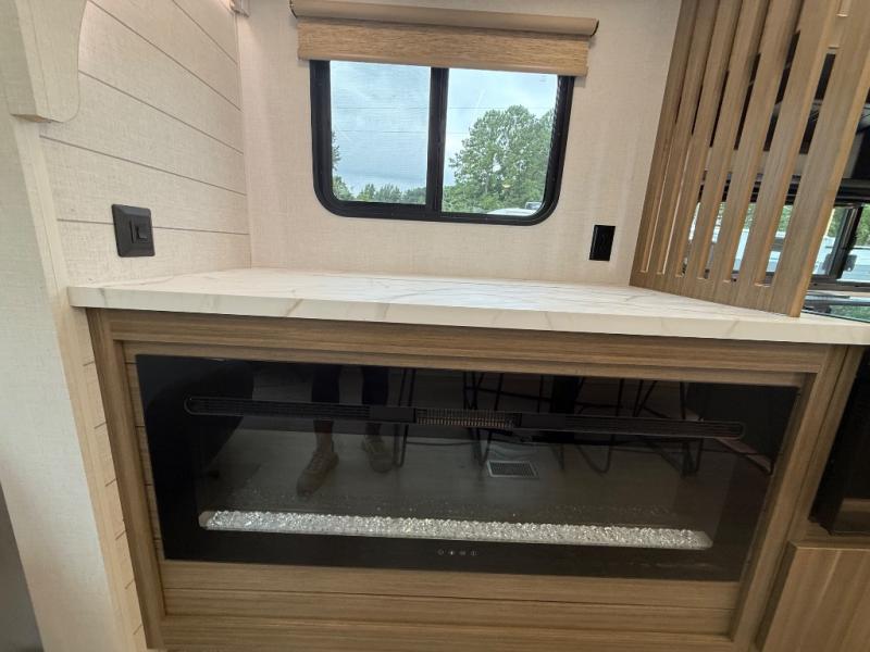 Find your zen int this spacious travel trailer for four! Once you've unloaded your gear, you can head inside to make lunch at the kitchen island with four chairs. An 80" trundle sofa provides additional seating space plus sleeping space for guests. You will love the rear custom recliners that are conveniently located next to the fireplace. The full bath is located towards the front next to the private bedroom so you can easily use the restroom at night, and you're sure to get a great night's rest on the custom king bed with Versa Tilt. This unit also includes washer and dryer prep, giving you the option to add these appliances.