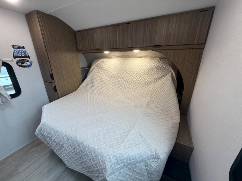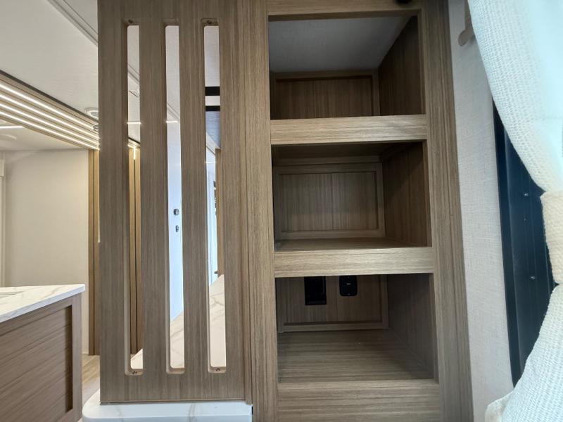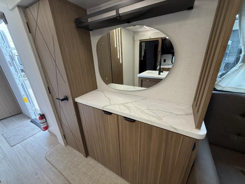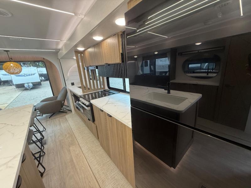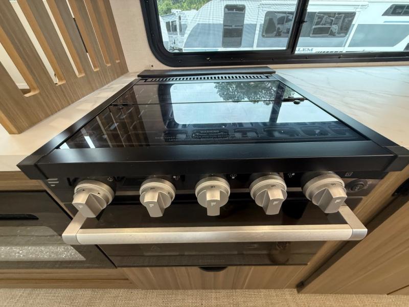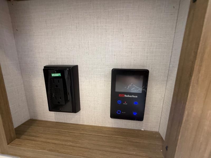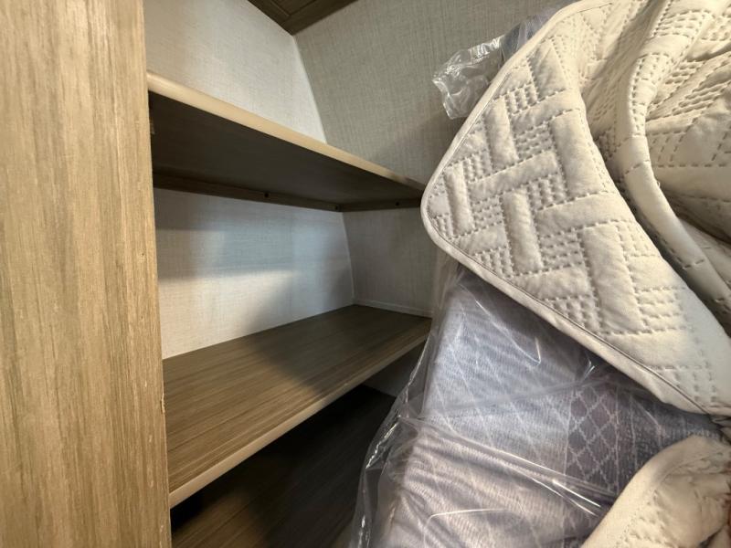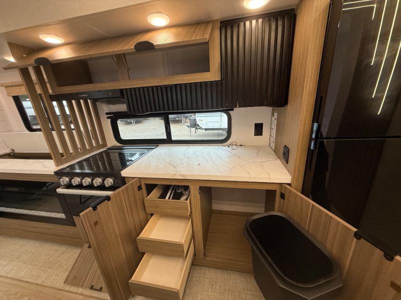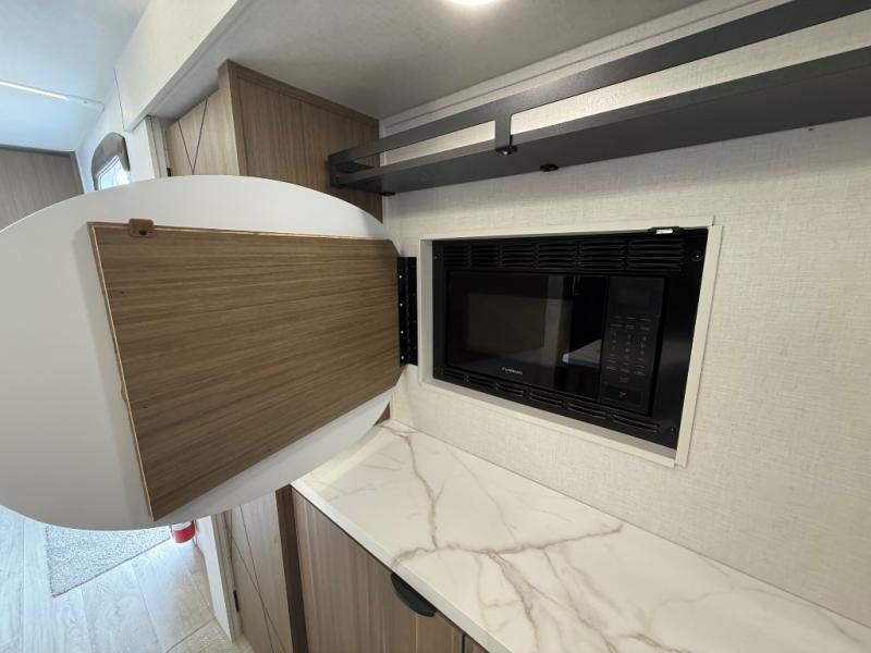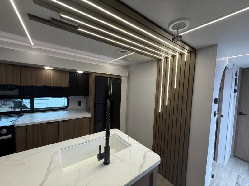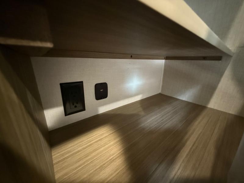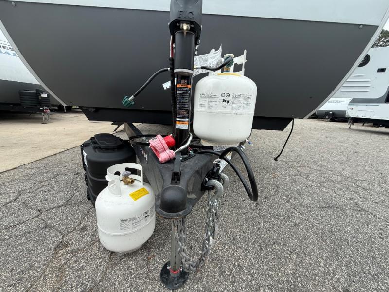 Find your zen int this spacious travel trailer for four! Once you've unloaded your gear, you can head inside to make lunch at the kitchen island with four chairs. An 80" trundle sofa provides additional seating space plus sleeping space for guests. You will love the rear custom recliners that are conveniently located next to the fireplace. The full bath is located towards the front next to the private bedroom so you can easily use the restroom at night, and you're sure to get a great night's rest on the custom king bed with Versa Tilt. This unit also includes washer and dryer prep, giving you the option to add these appliances.