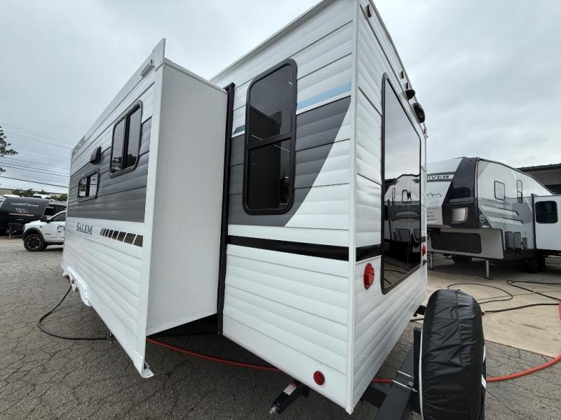 The Salem travel trailers are packed with hassle-free camping amenities and there are a variety of floorplans to choose from. The heated and enclosed Accessibelly will help protect against the elements and debris during transport, and the exterior retro/metal redesign is sure to be eye-catching! There are stylish roller shades inside, along with updated backsplash, elegant curtain rods and curtains, plus many more interior comforts! Choose a Salem travel trailer today for quality and value!