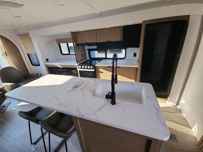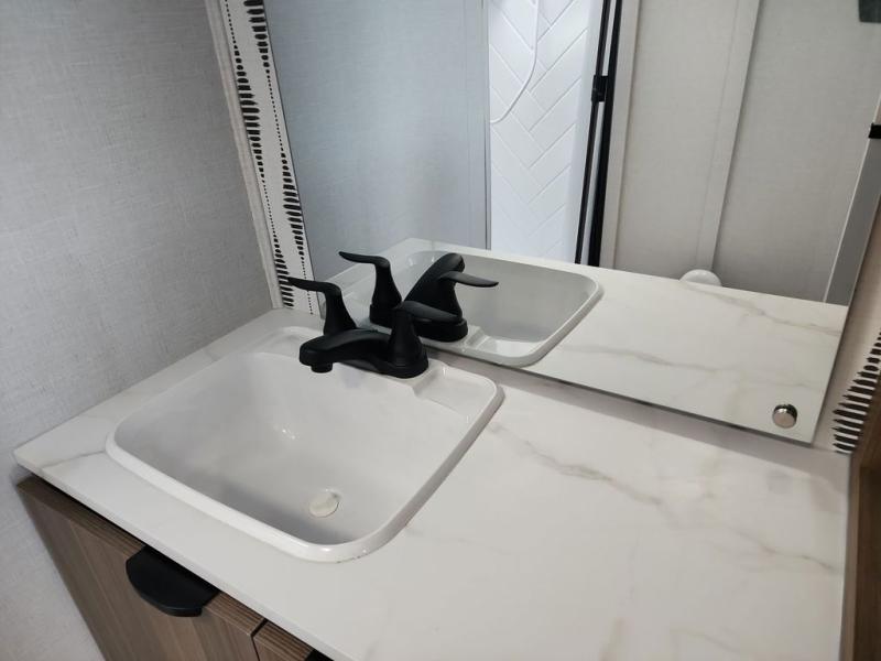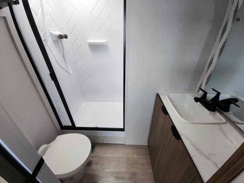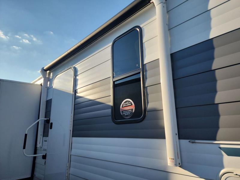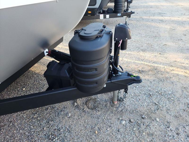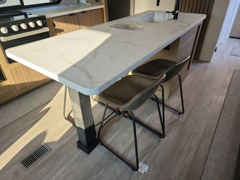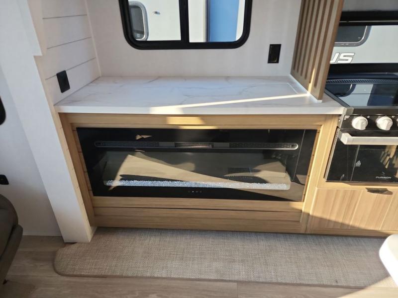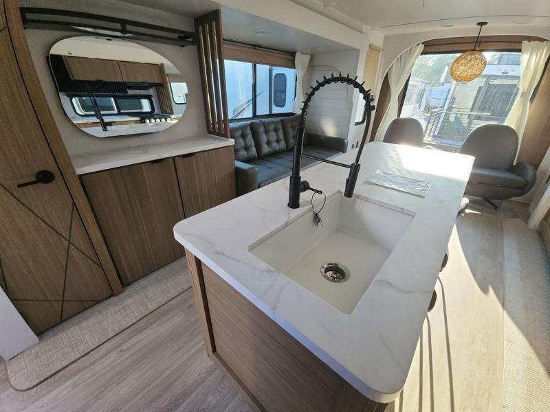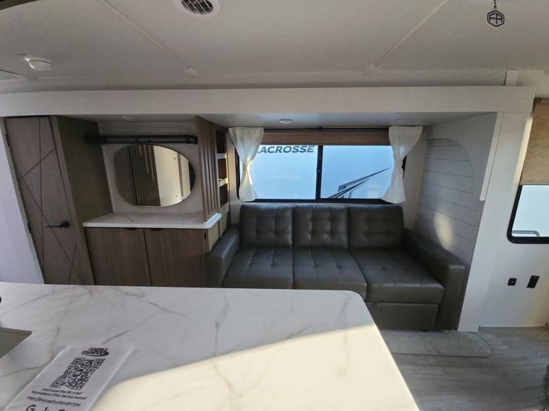 Find your zen int this spacious travel trailer for four! Once you've unloaded your gear, you can head inside to make lunch at the kitchen island with four chairs. An 80" trundle sofa provides additional seating space plus sleeping space for guests. You will love the rear custom recliners that are conveniently located next to the fireplace. The full bath is located towards the front next to the private bedroom so you can easily use the restroom at night, and you're sure to get a great night's rest on the custom king bed with Versa Tilt. This unit also includes washer and dryer prep, giving you the option to add these appliances.