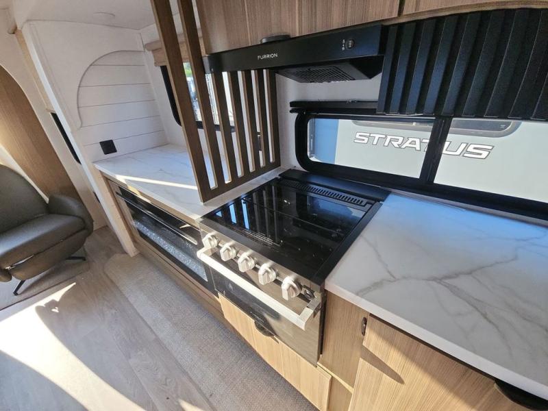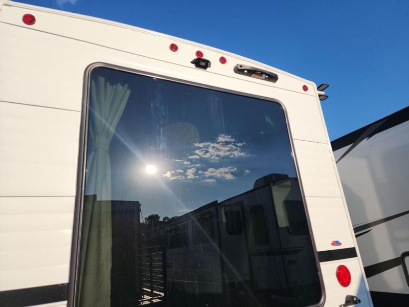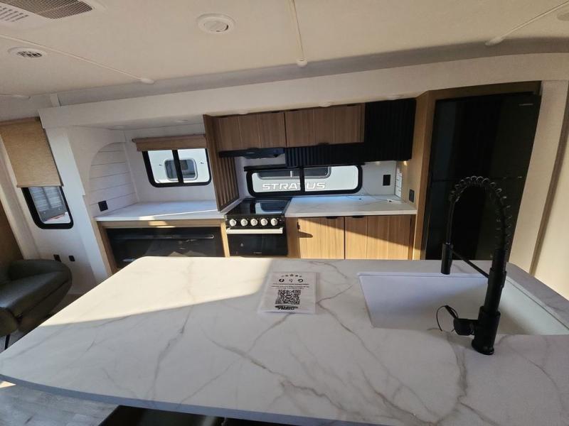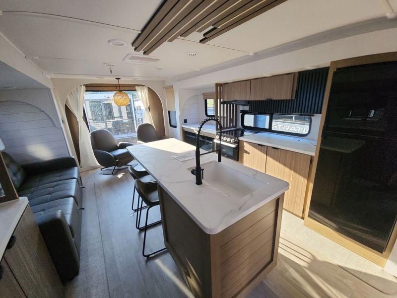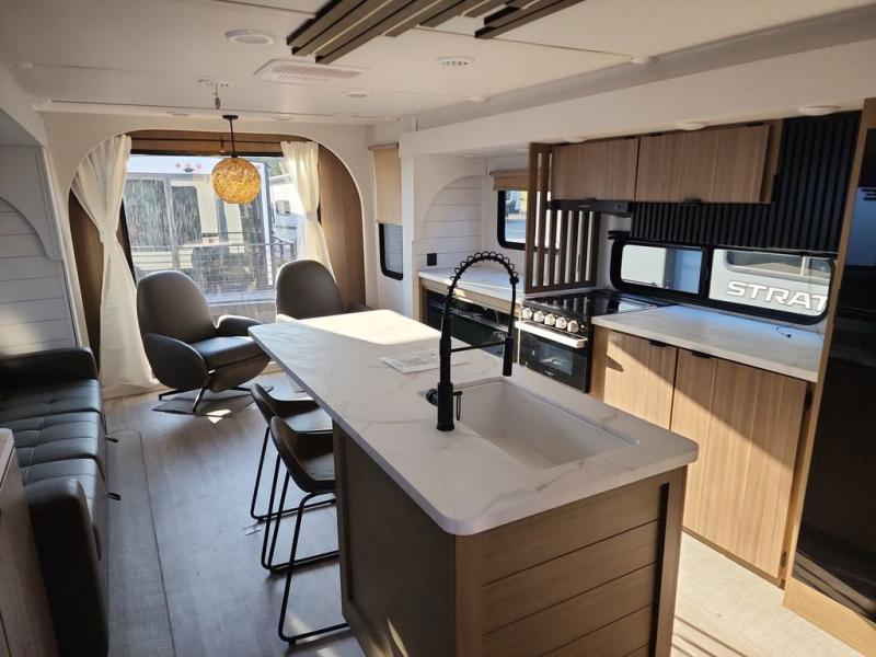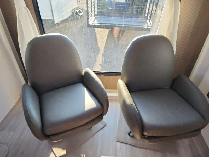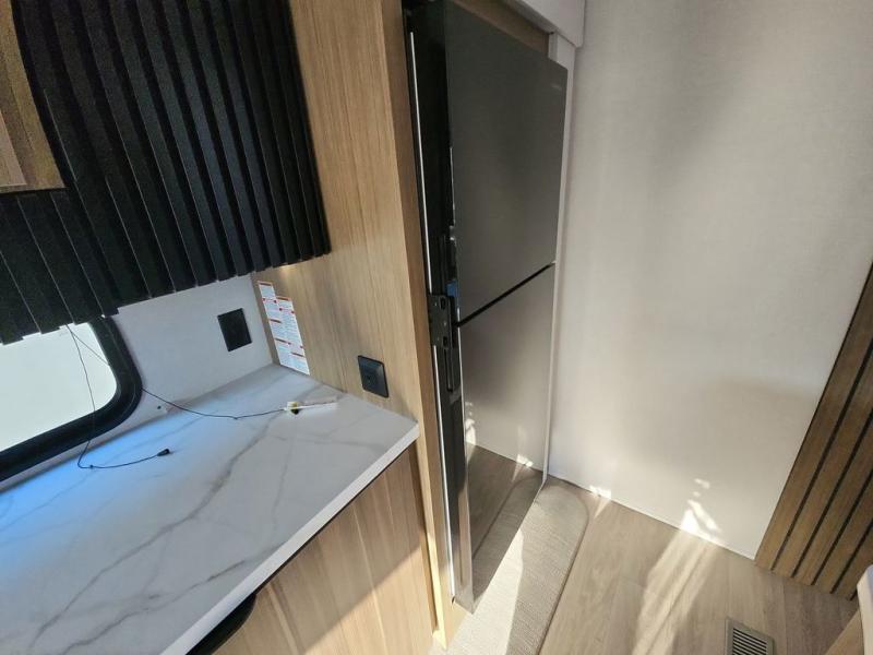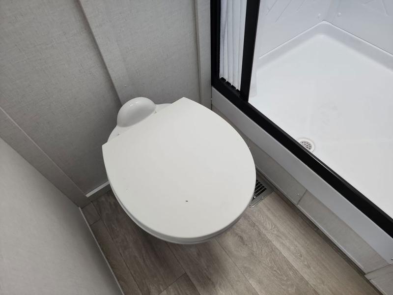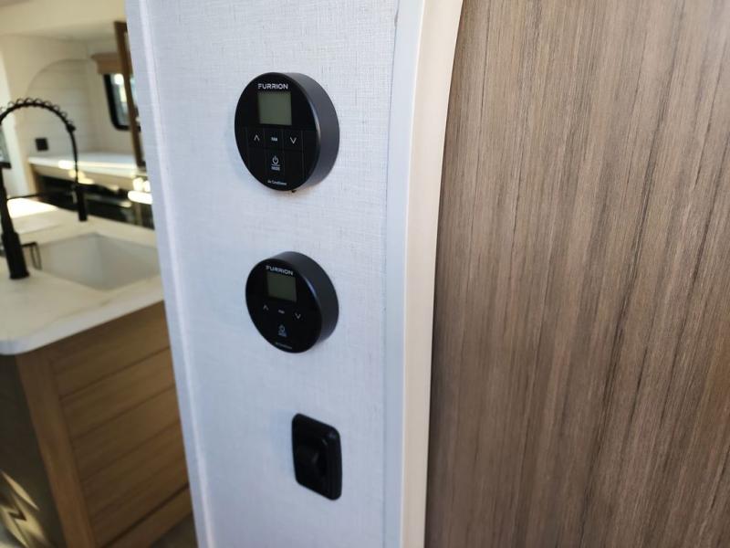 Find your zen int this spacious travel trailer for four! Once you've unloaded your gear, you can head inside to make lunch at the kitchen island with four chairs. An 80" trundle sofa provides additional seating space plus sleeping space for guests. You will love the rear custom recliners that are conveniently located next to the fireplace. The full bath is located towards the front next to the private bedroom so you can easily use the restroom at night, and you're sure to get a great night's rest on the custom king bed with Versa Tilt. This unit also includes washer and dryer prep, giving you the option to add these appliances.