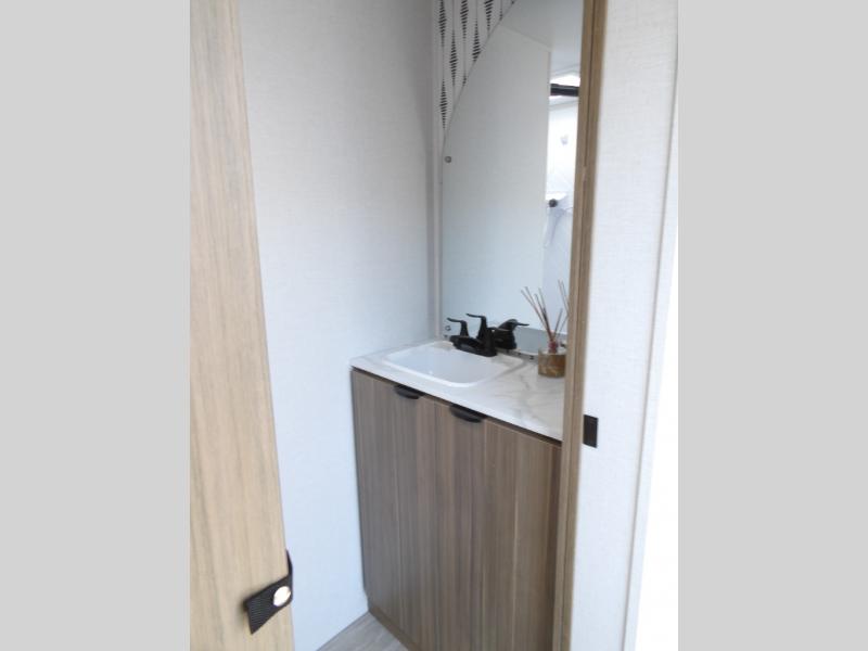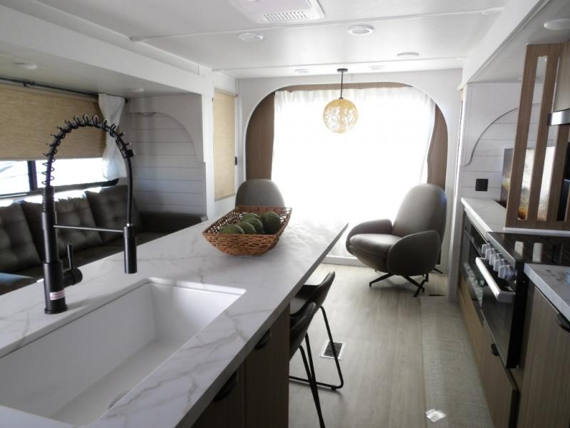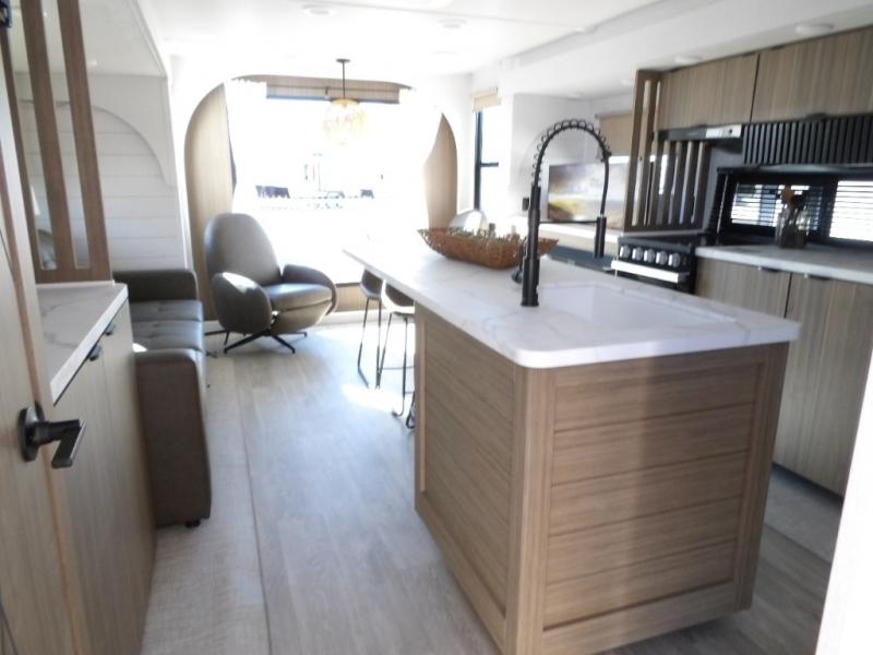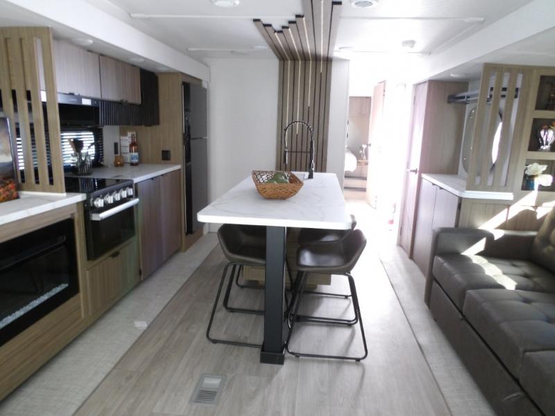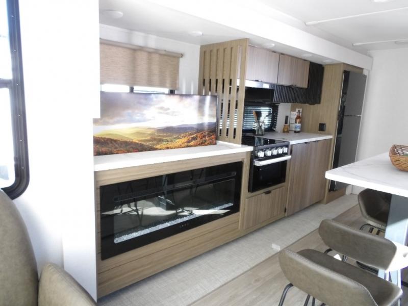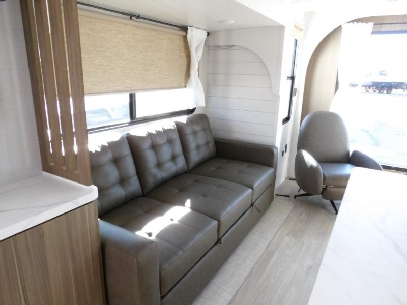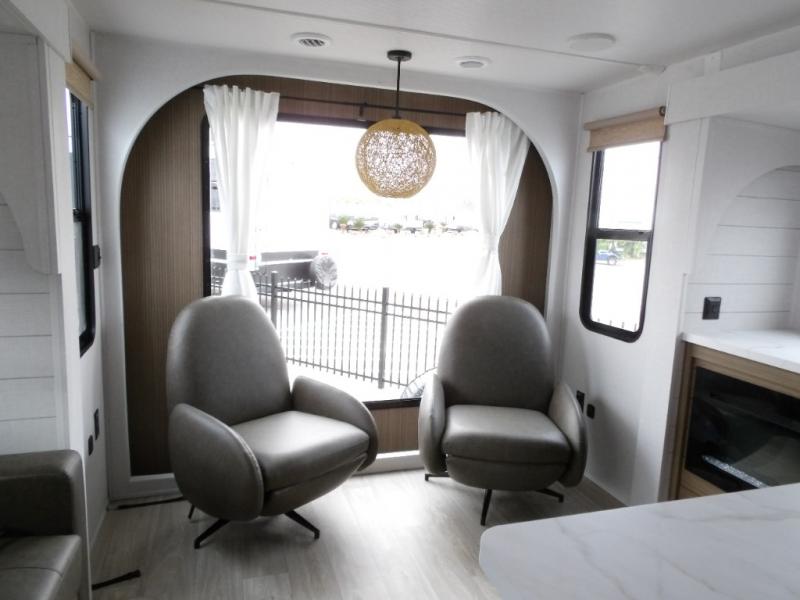 Find your zen int this spacious travel trailer for four! Once you've unloaded your gear, you can head inside to make lunch at the kitchen island with four chairs. An 80" trundle sofa provides additional seating space plus sleeping space for guests. You will love the rear custom recliners that are conveniently located next to the fireplace. The full bath is located towards the front next to the private bedroom so you can easily use the restroom at night, and you're sure to get a great night's rest on the custom king bed with Versa Tilt. This unit also includes washer and dryer prep, giving you the option to add these appliances.
