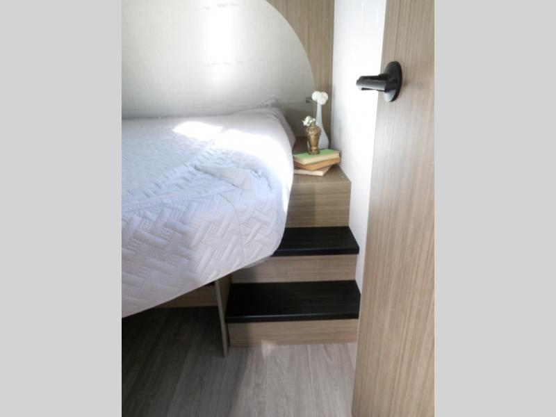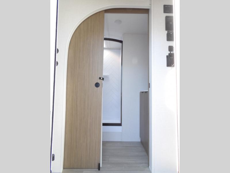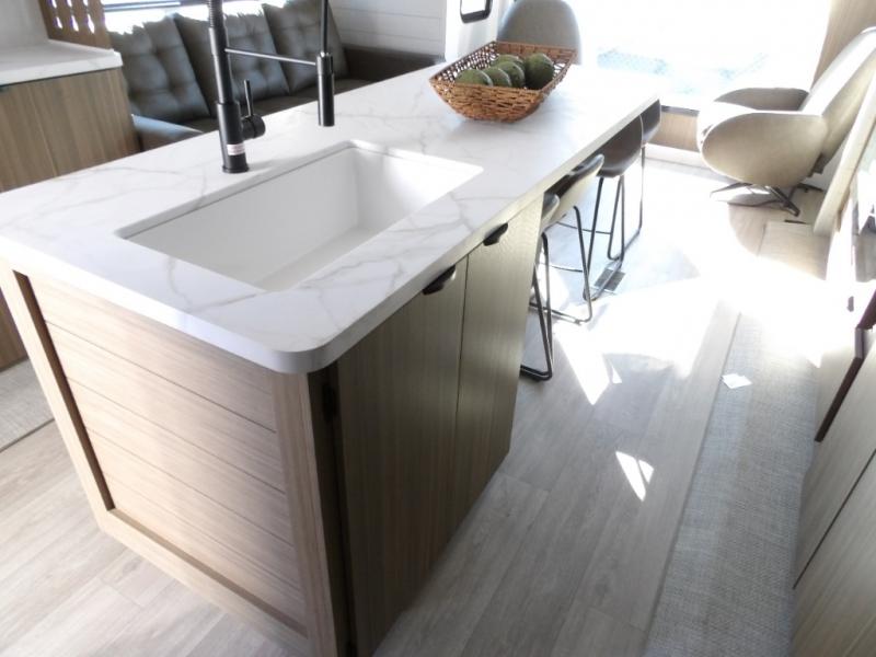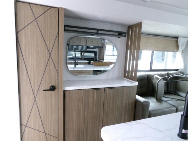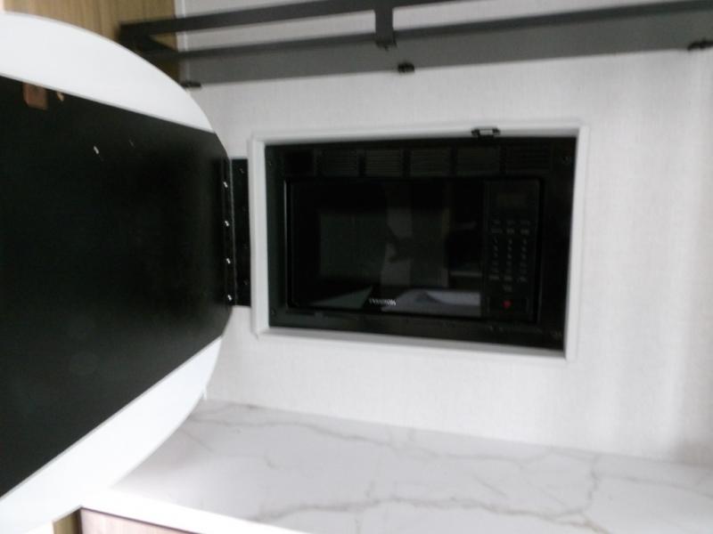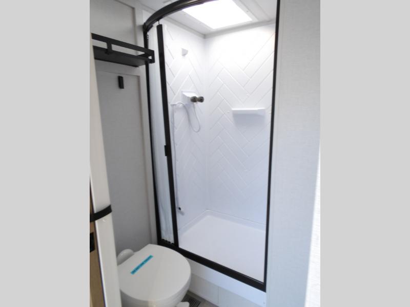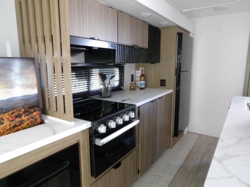 Find your zen int this spacious travel trailer for four! Once you've unloaded your gear, you can head inside to make lunch at the kitchen island with four chairs. An 80" trundle sofa provides additional seating space plus sleeping space for guests. You will love the rear custom recliners that are conveniently located next to the fireplace. The full bath is located towards the front next to the private bedroom so you can easily use the restroom at night, and you're sure to get a great night's rest on the custom king bed with Versa Tilt. This unit also includes washer and dryer prep, giving you the option to add these appliances.