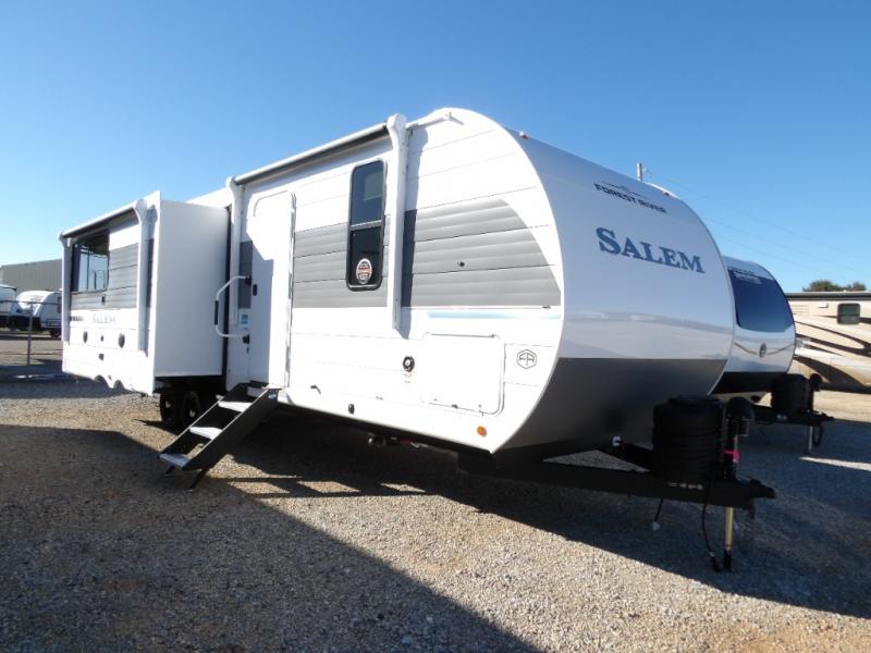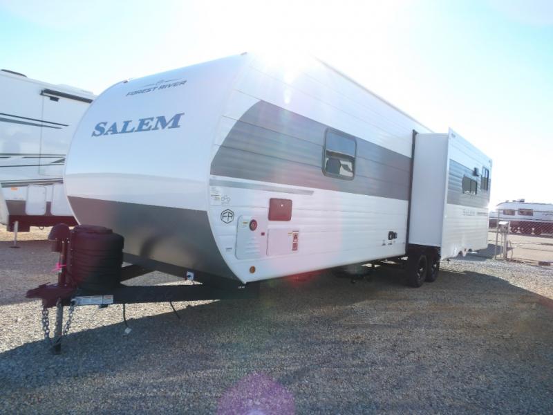 The Salem travel trailers are packed with hassle-free camping amenities and there are a variety of floorplans to choose from. The heated and enclosed Accessibelly will help protect against the elements and debris during transport, and the exterior retro/metal redesign is sure to be eye-catching! There are stylish roller shades inside, along with updated backsplash, elegant curtain rods and curtains, plus many more interior comforts! Choose a Salem travel trailer today for quality and value!