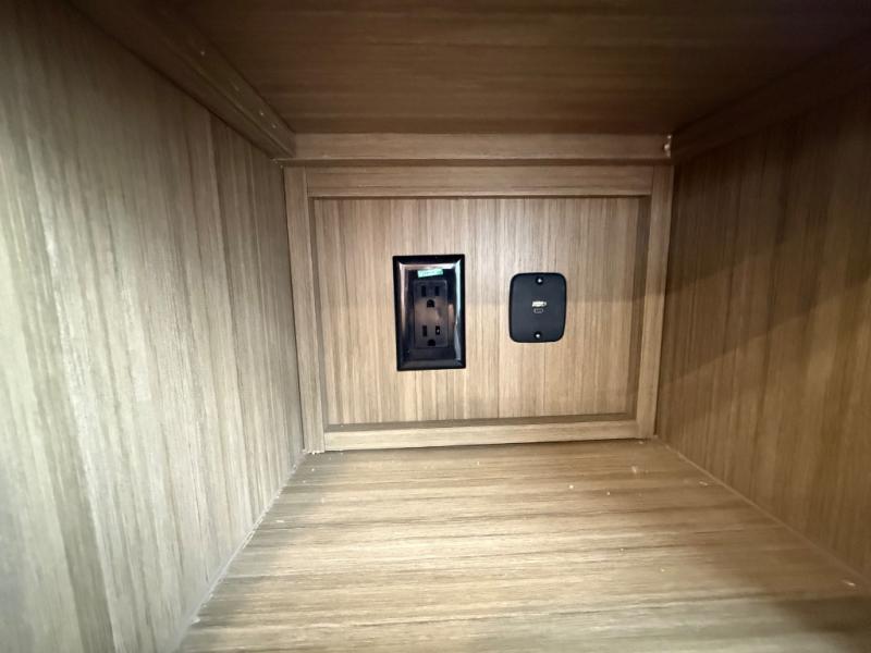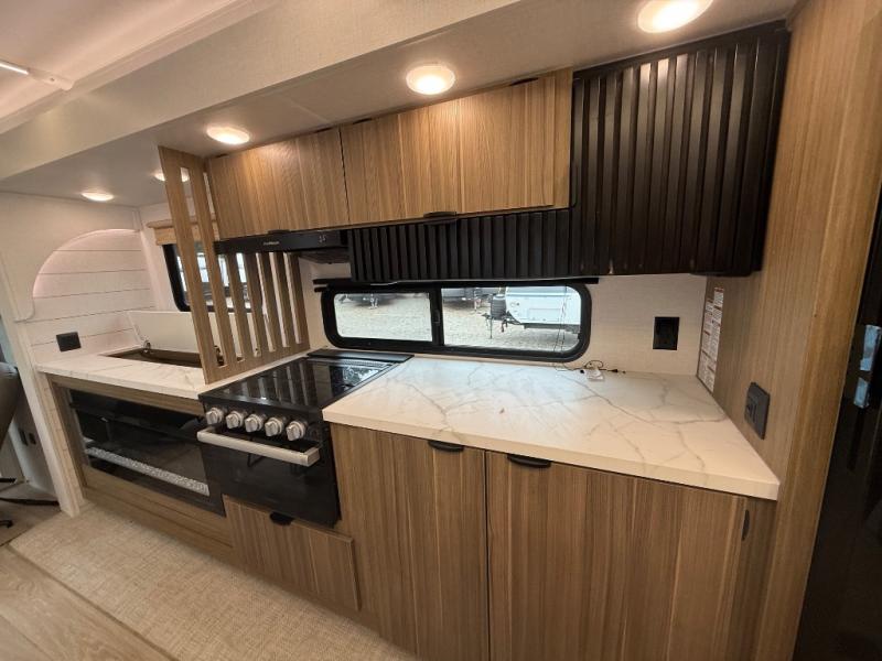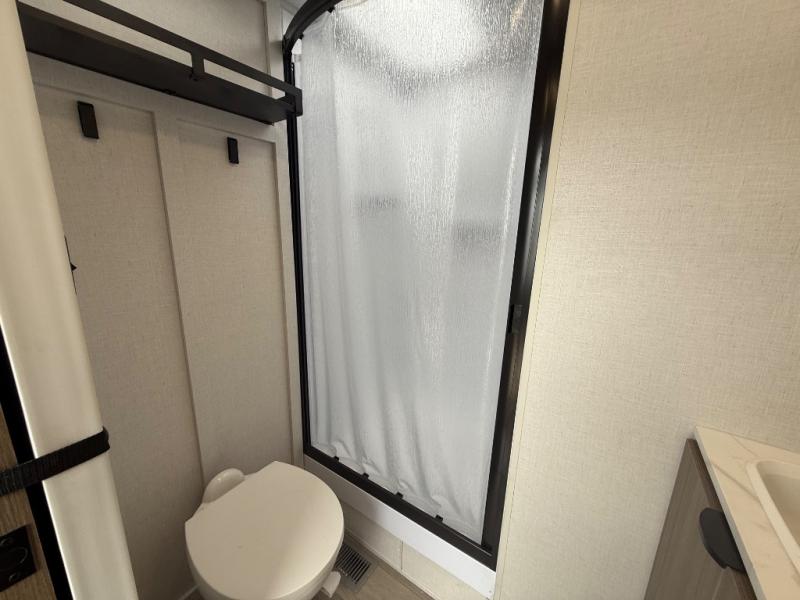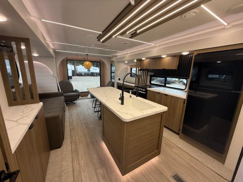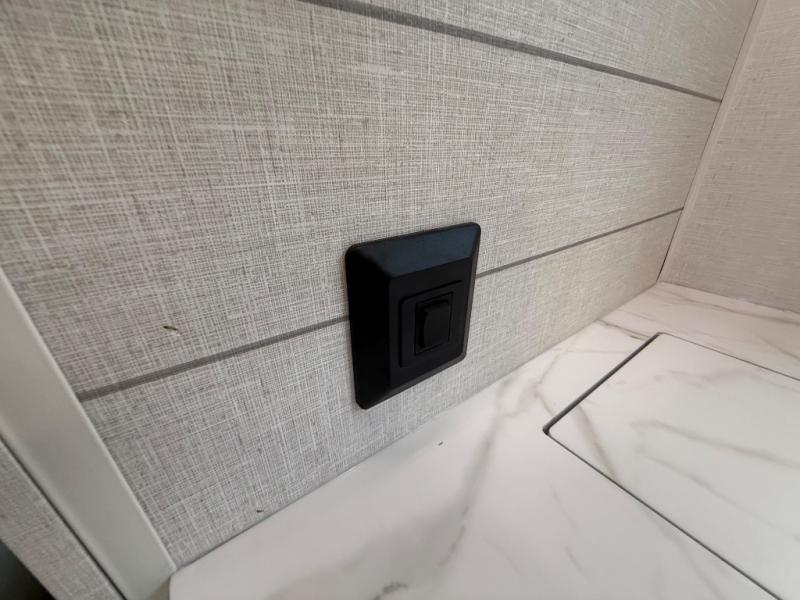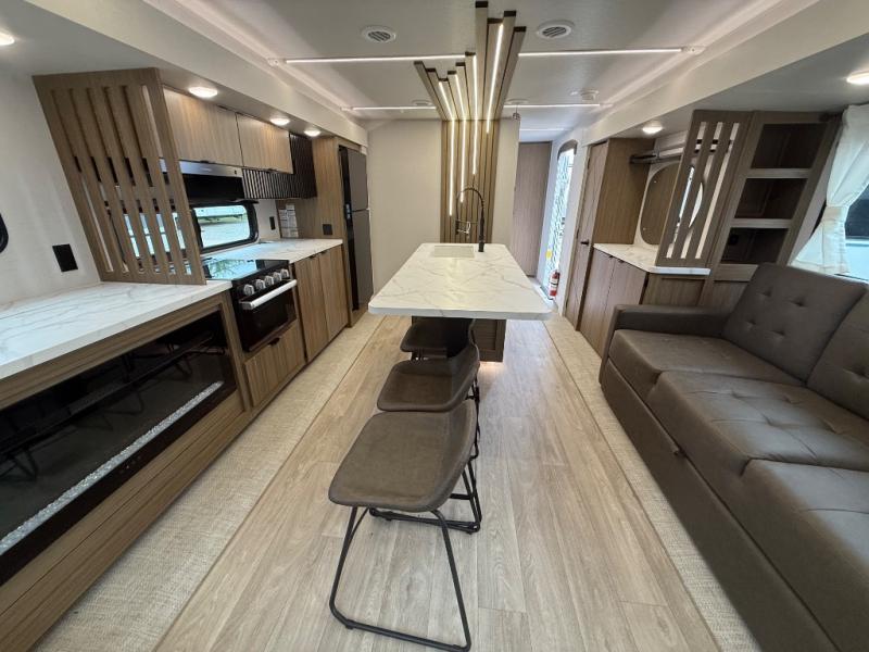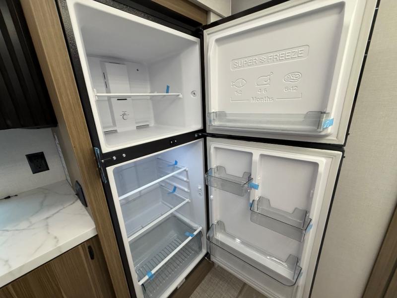 Find your zen int this spacious travel trailer for four! Once you've unloaded your gear, you can head inside to make lunch at the kitchen island with four chairs. An 80" trundle sofa provides additional seating space plus sleeping space for guests. You will love the rear custom recliners that are conveniently located next to the fireplace. The full bath is located towards the front next to the private bedroom so you can easily use the restroom at night, and you're sure to get a great night's rest on the custom king bed with Versa Tilt. This unit also includes washer and dryer prep, giving you the option to add these appliances.