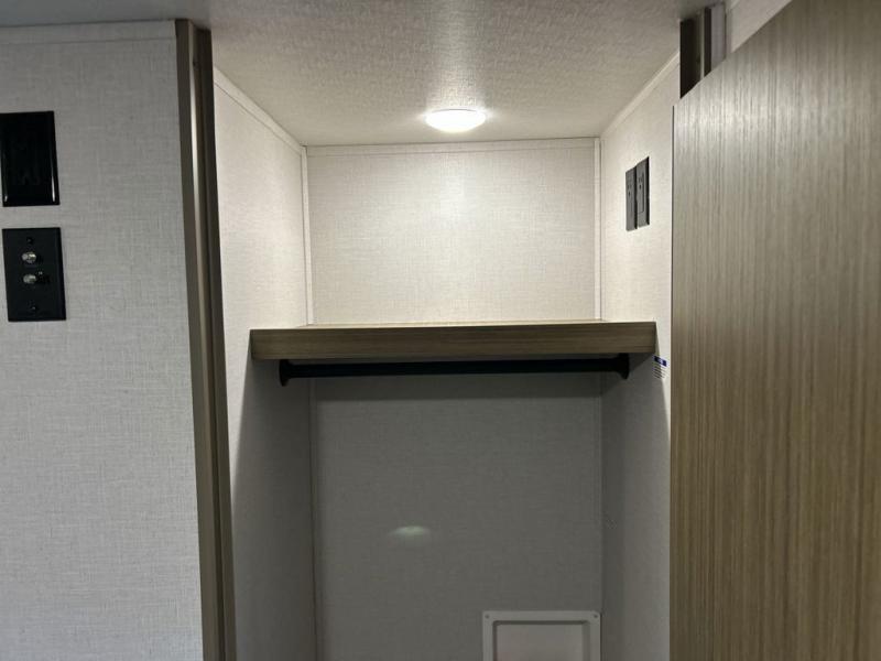 Find your zen int this spacious travel trailer for four! Once you've unloaded your gear, you can head inside to make lunch at the kitchen island with four chairs. An 80" trundle sofa provides additional seating space plus sleeping space for guests. You will love the rear custom recliners that are conveniently located next to the fireplace. The full bath is located towards the front next to the private bedroom so you can easily use the restroom at night, and you're sure to get a great night's rest on the custom king bed with Versa Tilt. This unit also includes washer and dryer prep, giving you the option to add these appliances.