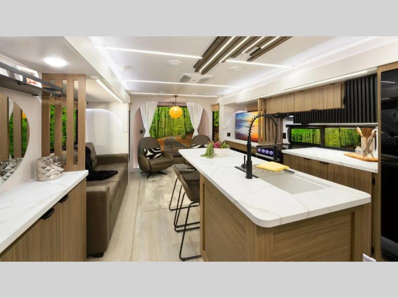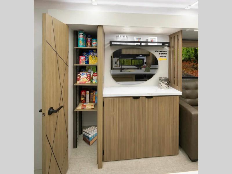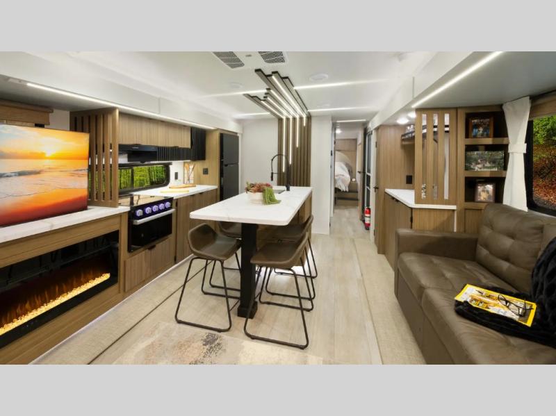 Find your zen int this spacious travel trailer for four! Once you've unloaded your gear, you can head inside to make lunch at the kitchen island with four chairs. An 80" trundle sofa provides additional seating space plus sleeping space for guests. You will love the rear custom recliners that are conveniently located next to the fireplace. The full bath is located towards the front next to the private bedroom so you can easily use the restroom at night, and you're sure to get a great night's rest on the custom king bed with Versa Tilt. This unit also includes washer and dryer prep, giving you the option to add these appliances.