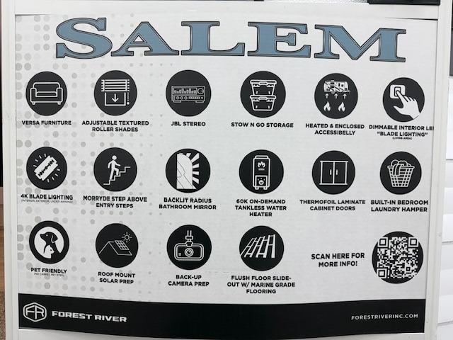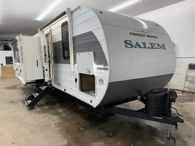 The Salem travel trailers are packed with hassle-free camping amenities and there are a variety of floorplans to choose from. The heated and enclosed Accessibelly will help protect against the elements and debris during transport, and the exterior retro/metal redesign is sure to be eye-catching! There are stylish roller shades inside, along with updated backsplash, elegant curtain rods and curtains, plus many more interior comforts! Choose a Salem travel trailer today for quality and value!