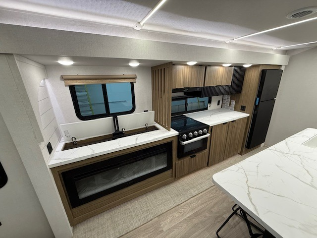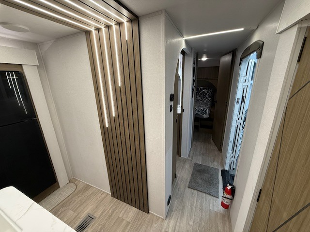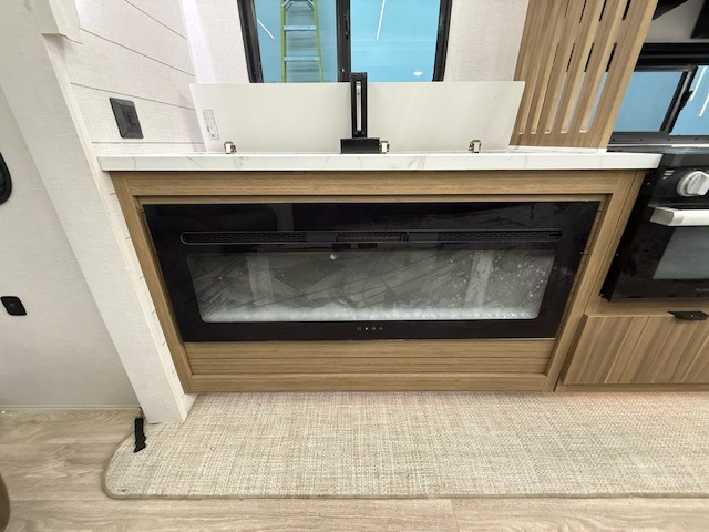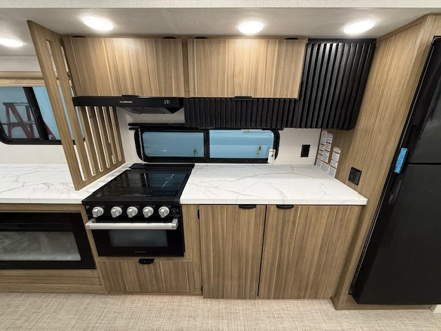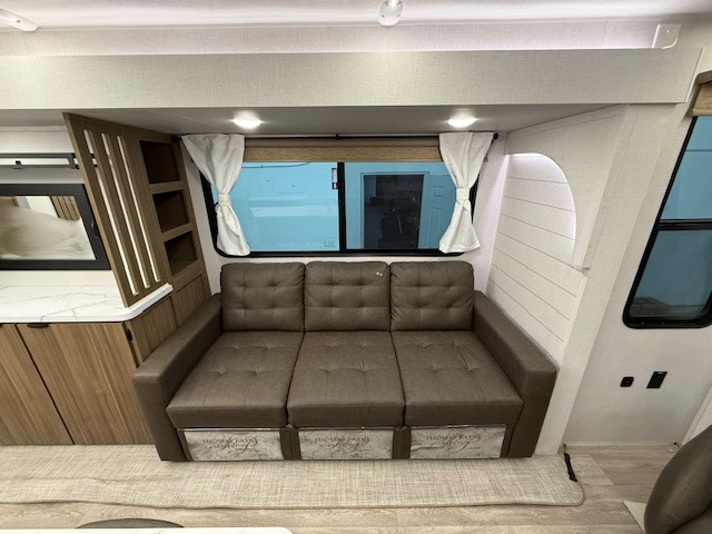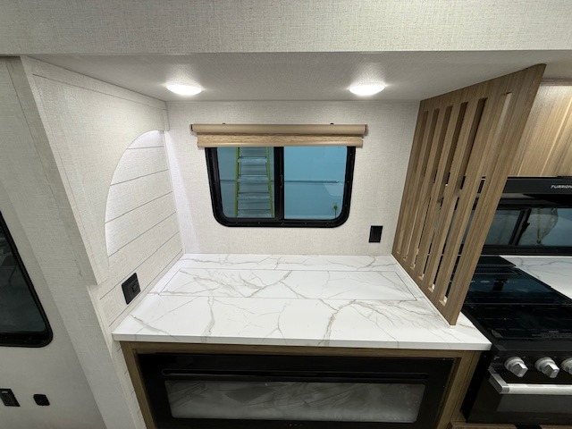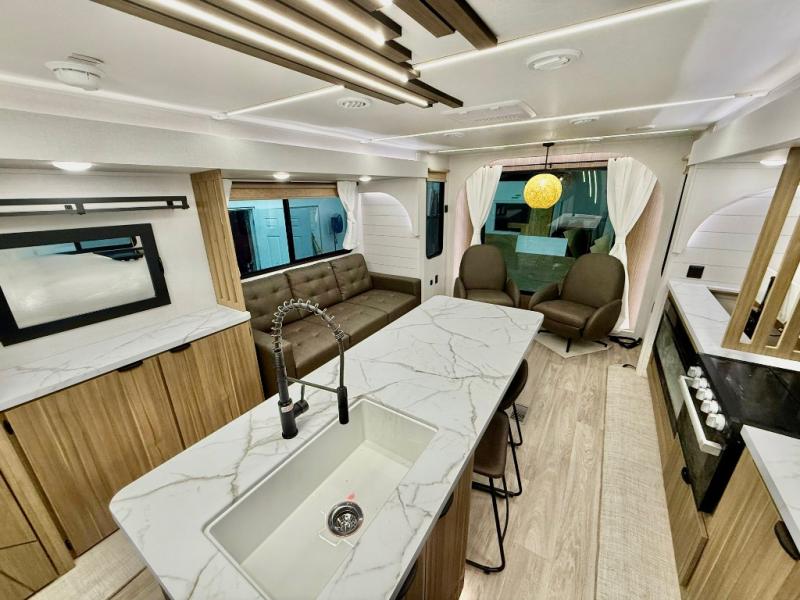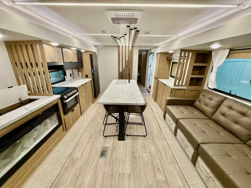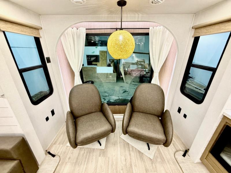 Find your zen in this spacious travel trailer for four! Once you've unloaded your gear, you can head inside to make lunch at the kitchen island with four chairs. An 80" trundle sofa provides additional seating space plus sleeping space for guests. You will love the rear custom recliners that are conveniently located next to the fireplace. The full bath is located towards the front next to the private bedroom so you can easily use the restroom at night, and you're sure to get a great night's rest on the custom king bed with Versa Tilt. This unit also includes washer and dryer prep, giving you the option to add these appliances.