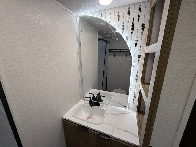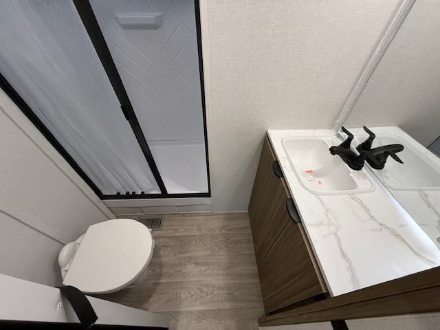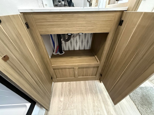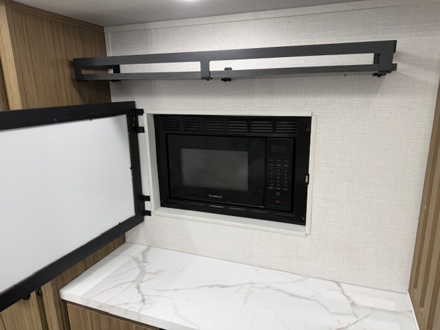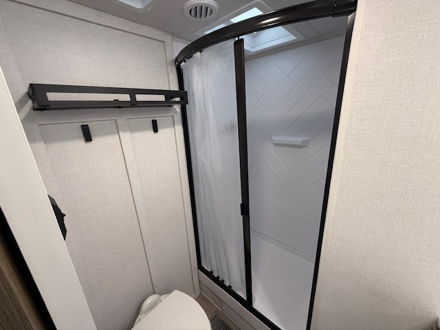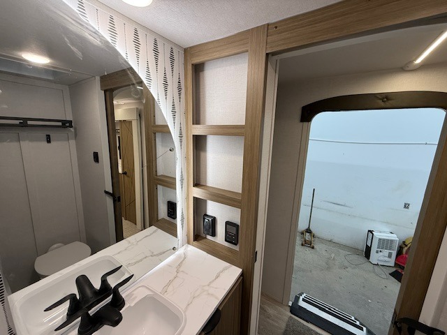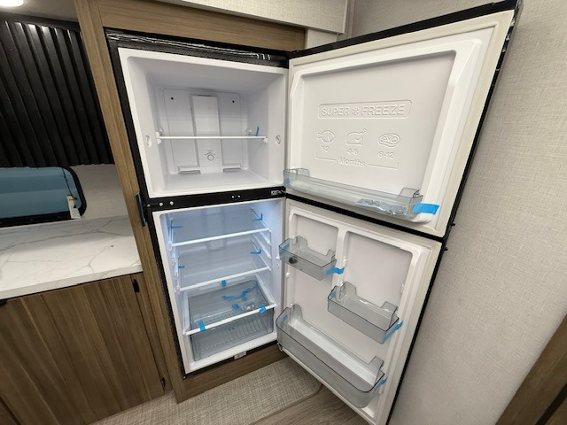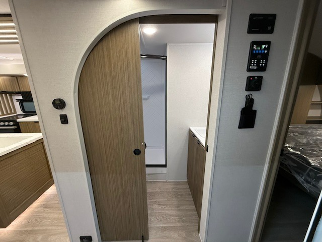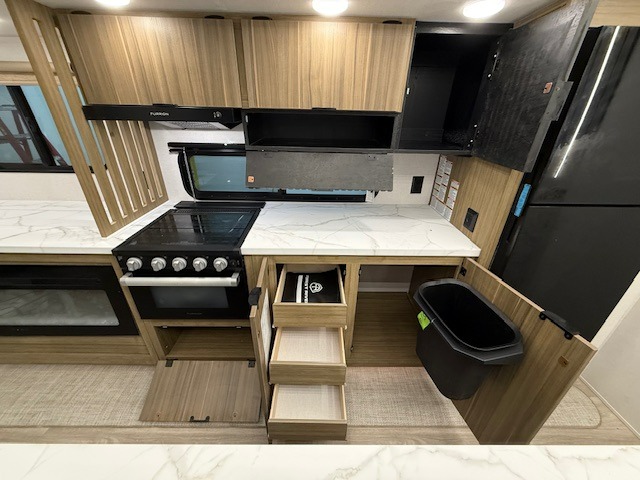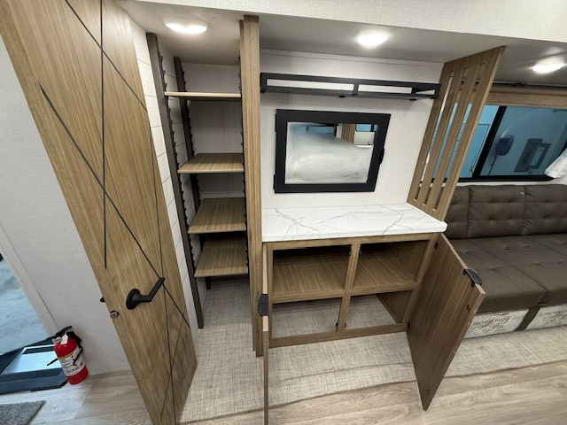 Find your zen in this spacious travel trailer for four! Once you've unloaded your gear, you can head inside to make lunch at the kitchen island with four chairs. An 80" trundle sofa provides additional seating space plus sleeping space for guests. You will love the rear custom recliners that are conveniently located next to the fireplace. The full bath is located towards the front next to the private bedroom so you can easily use the restroom at night, and you're sure to get a great night's rest on the custom king bed with Versa Tilt. This unit also includes washer and dryer prep, giving you the option to add these appliances.