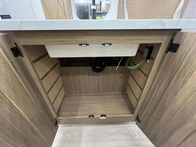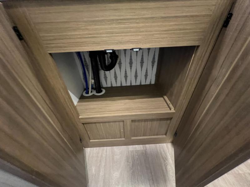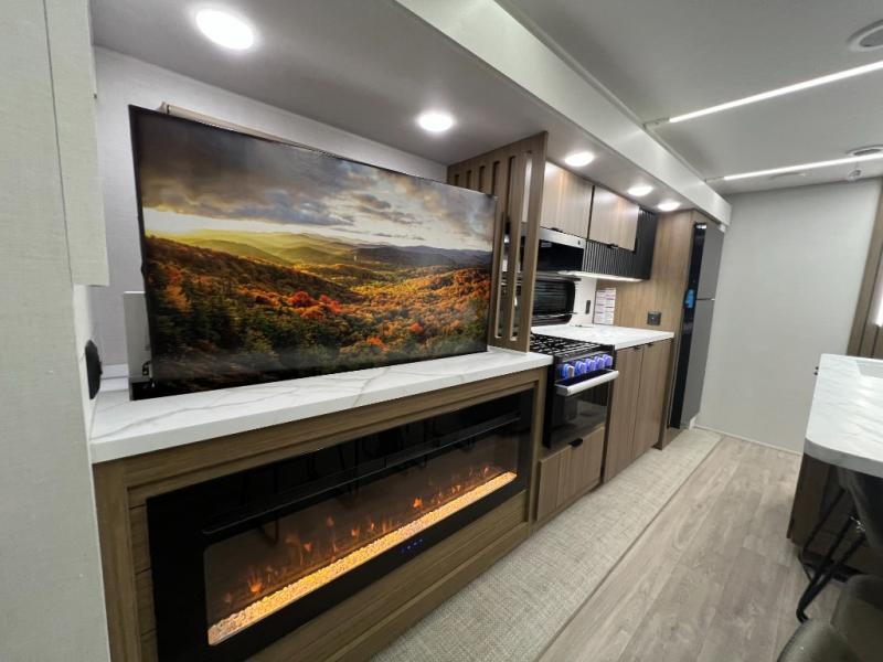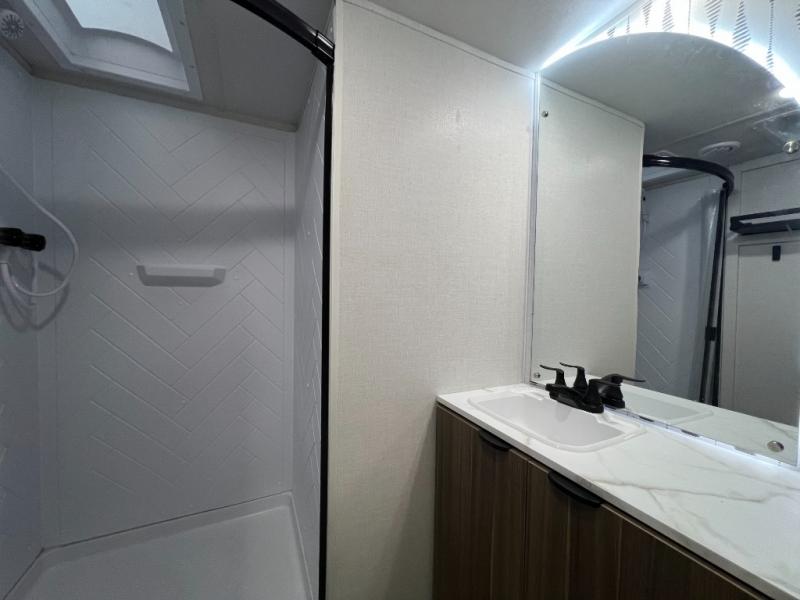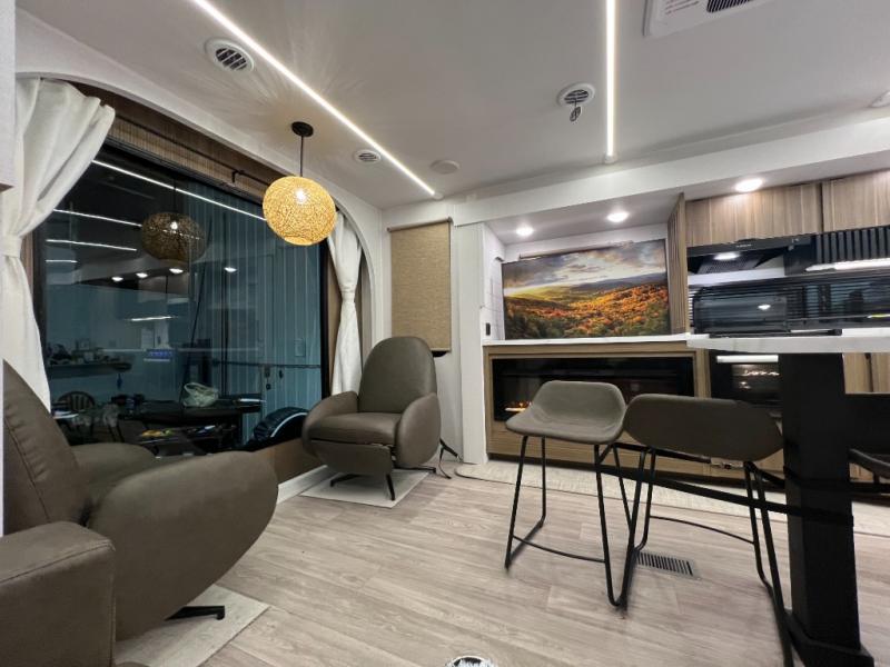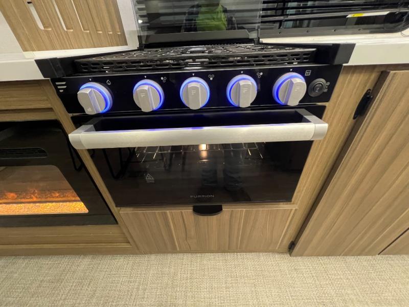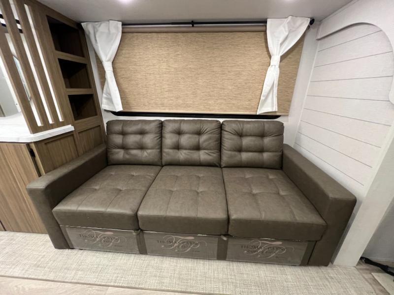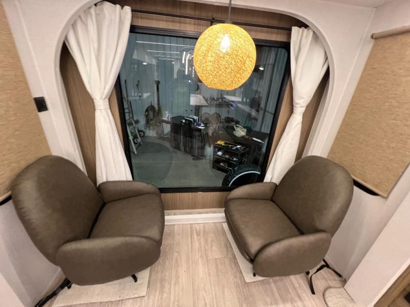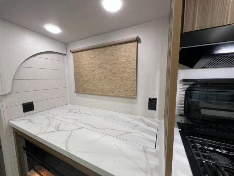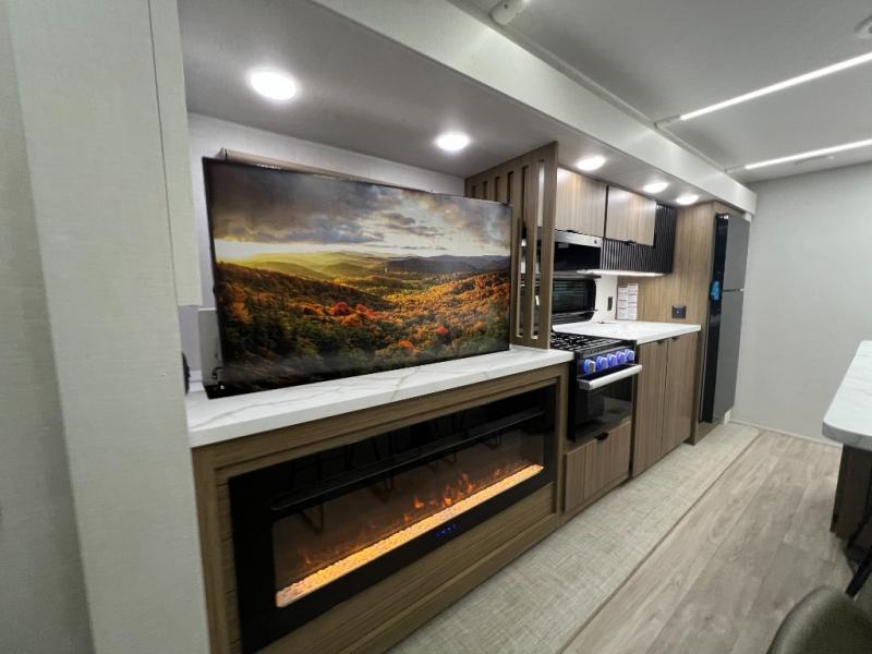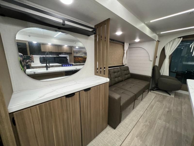 Find your zen int this spacious travel trailer for four! Once you've unloaded your gear, you can head inside to make lunch at the kitchen island with four chairs. An 80" trundle sofa provides additional seating space plus sleeping space for guests. You will love the rear custom recliners that are conveniently located next to the fireplace. The full bath is located towards the front next to the private bedroom so you can easily use the restroom at night, and you're sure to get a great night's rest on the custom king bed with Versa Tilt. This unit also includes washer and dryer prep, giving you the option to add these appliances.