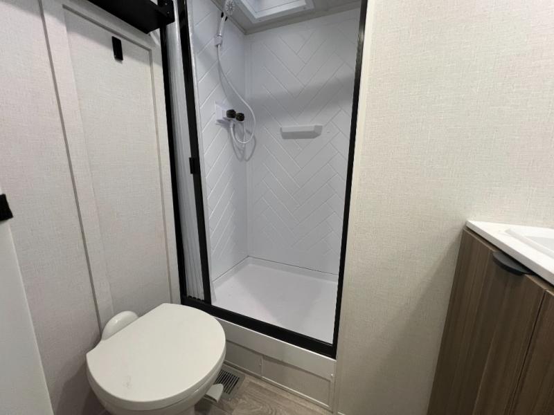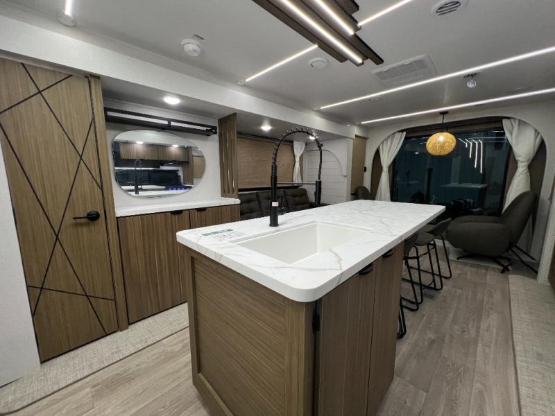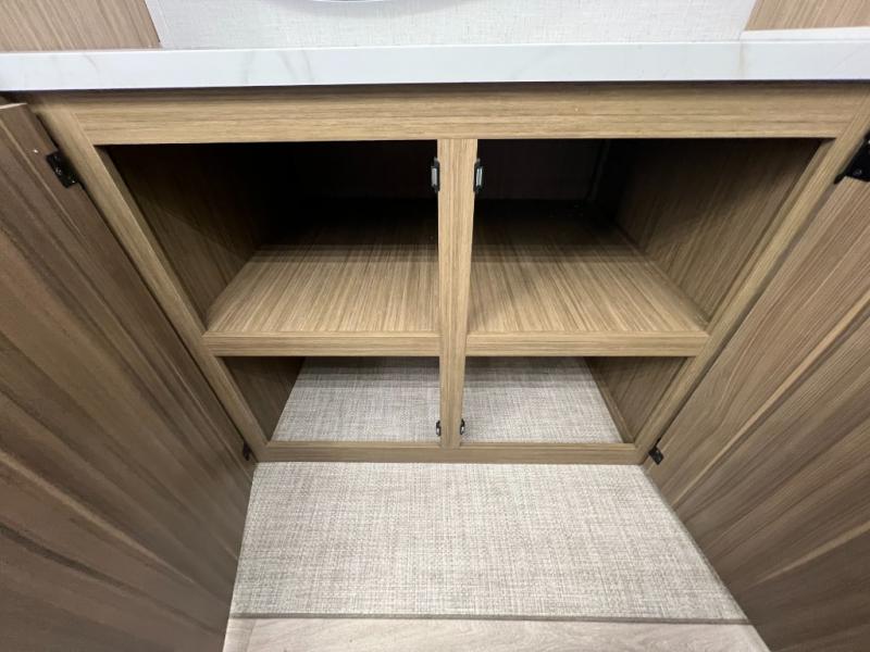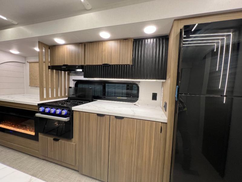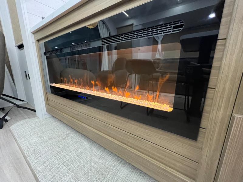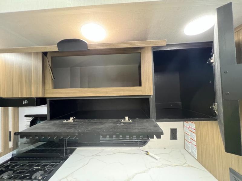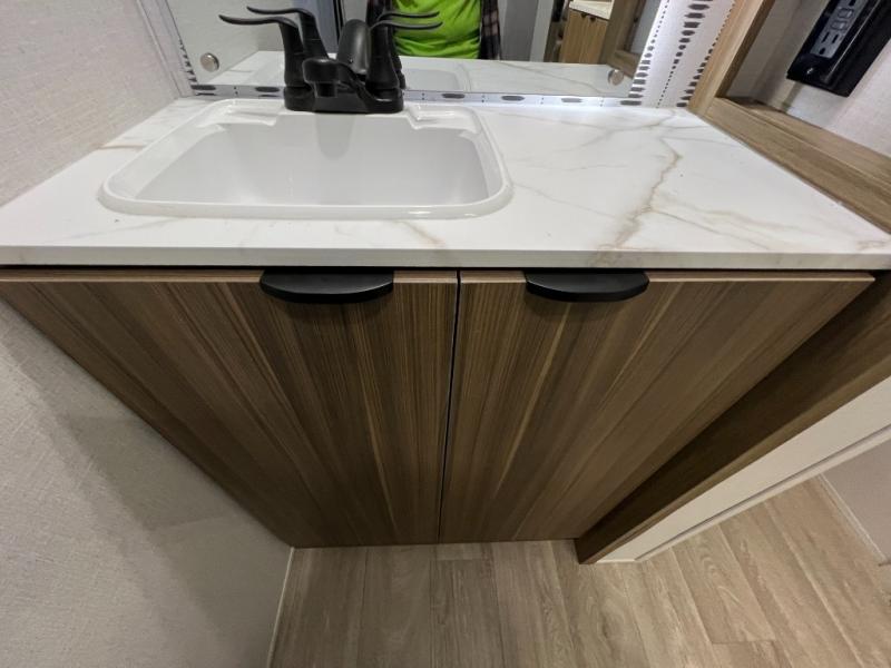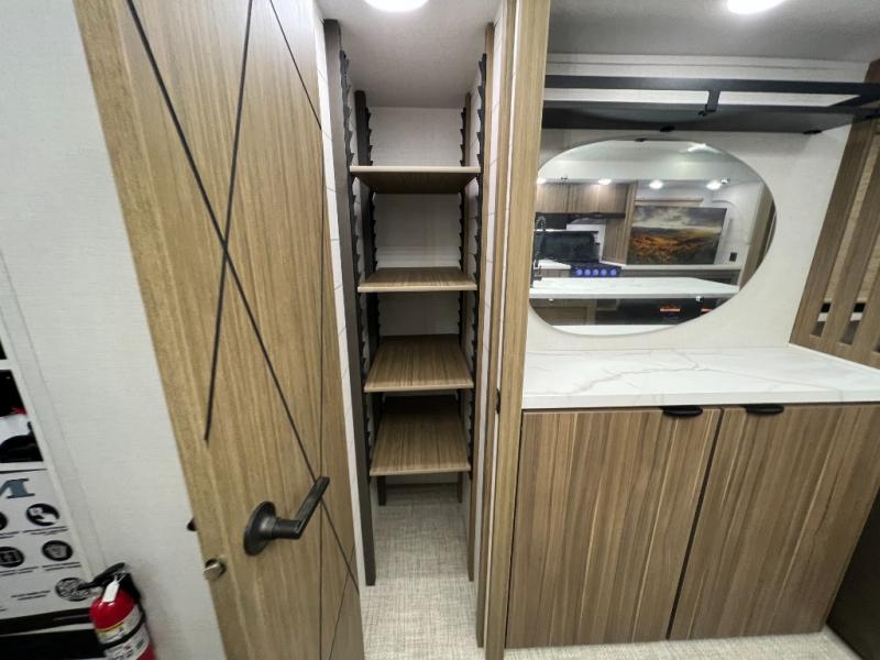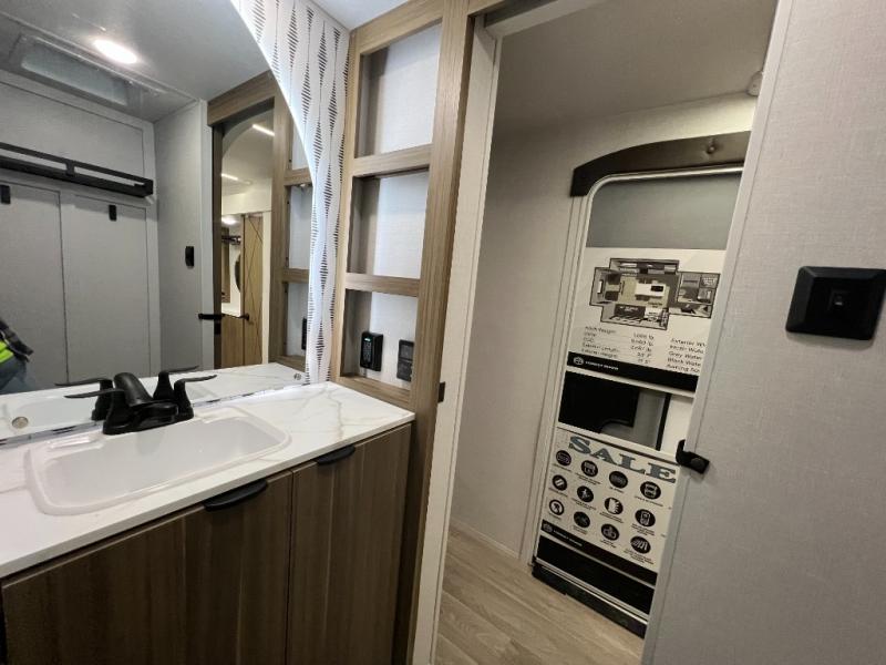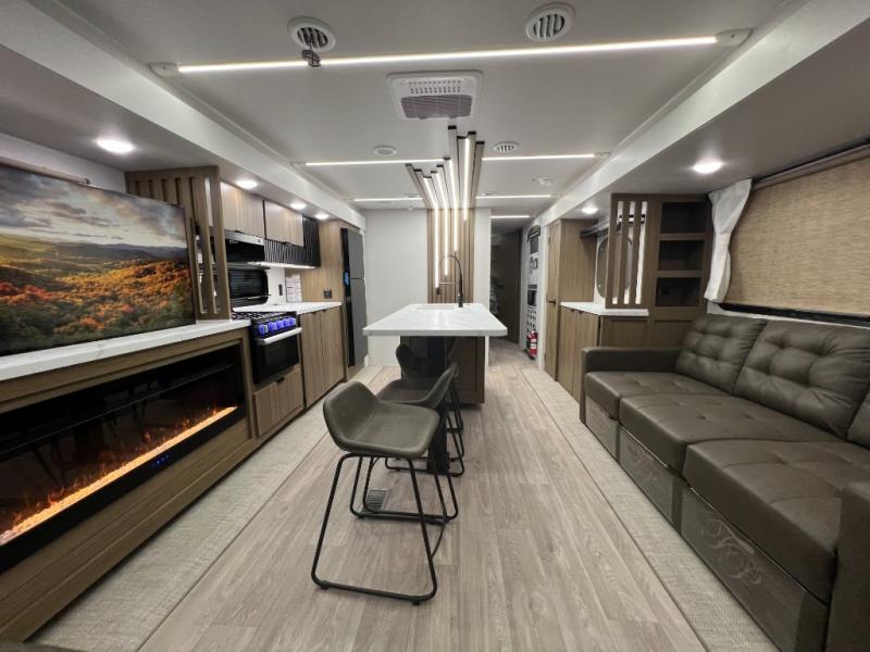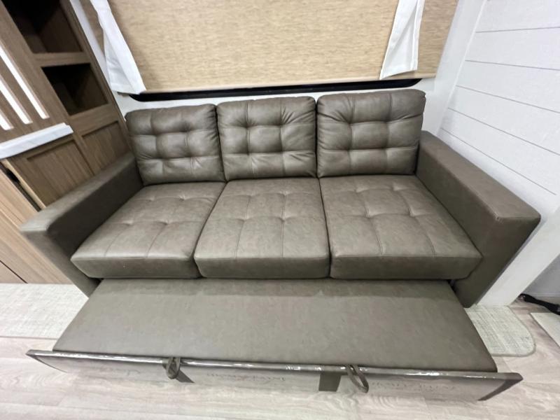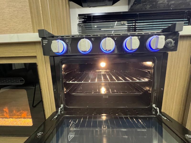 Find your zen int this spacious travel trailer for four! Once you've unloaded your gear, you can head inside to make lunch at the kitchen island with four chairs. An 80" trundle sofa provides additional seating space plus sleeping space for guests. You will love the rear custom recliners that are conveniently located next to the fireplace. The full bath is located towards the front next to the private bedroom so you can easily use the restroom at night, and you're sure to get a great night's rest on the custom king bed with Versa Tilt. This unit also includes washer and dryer prep, giving you the option to add these appliances.
