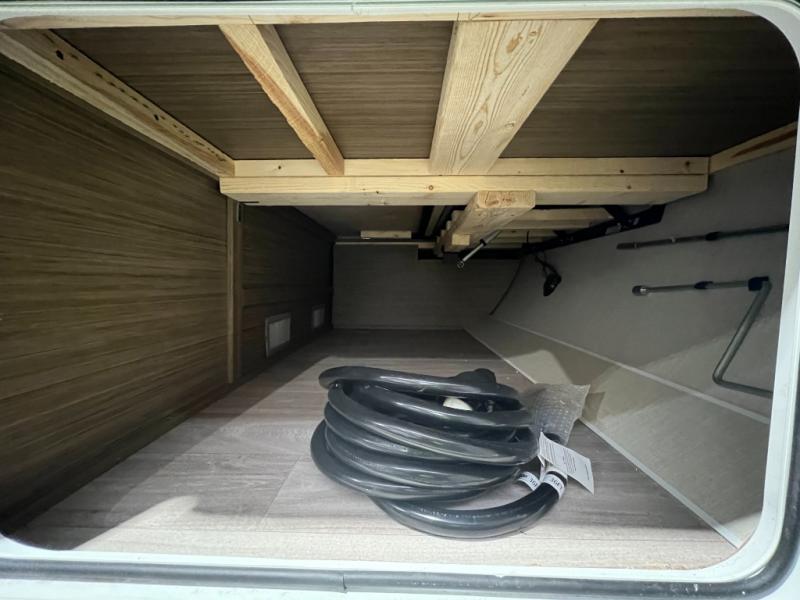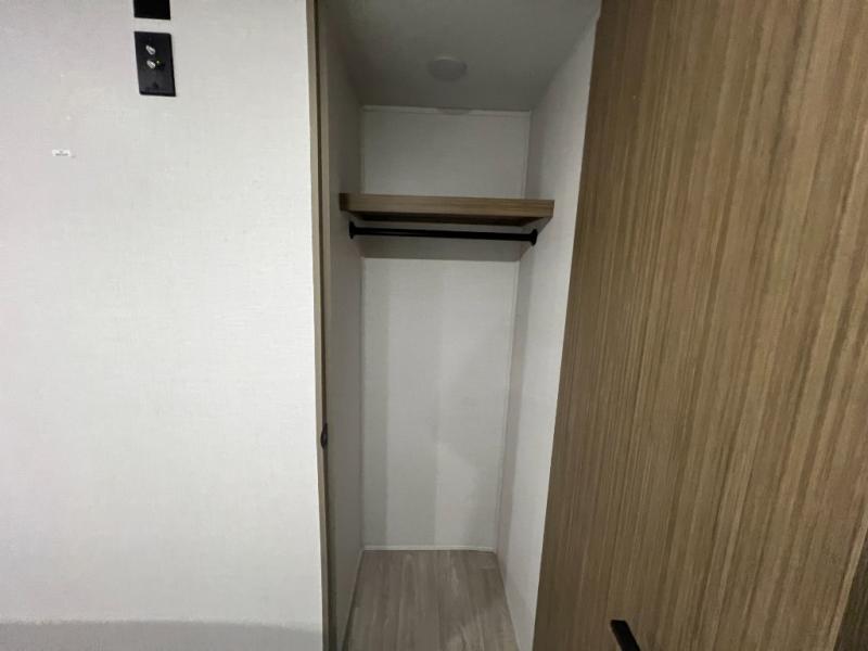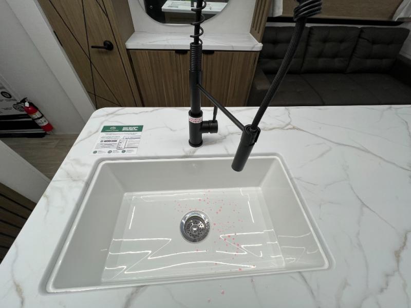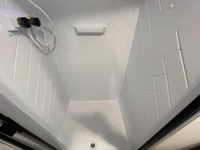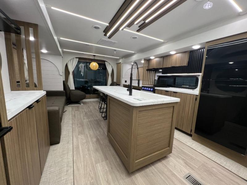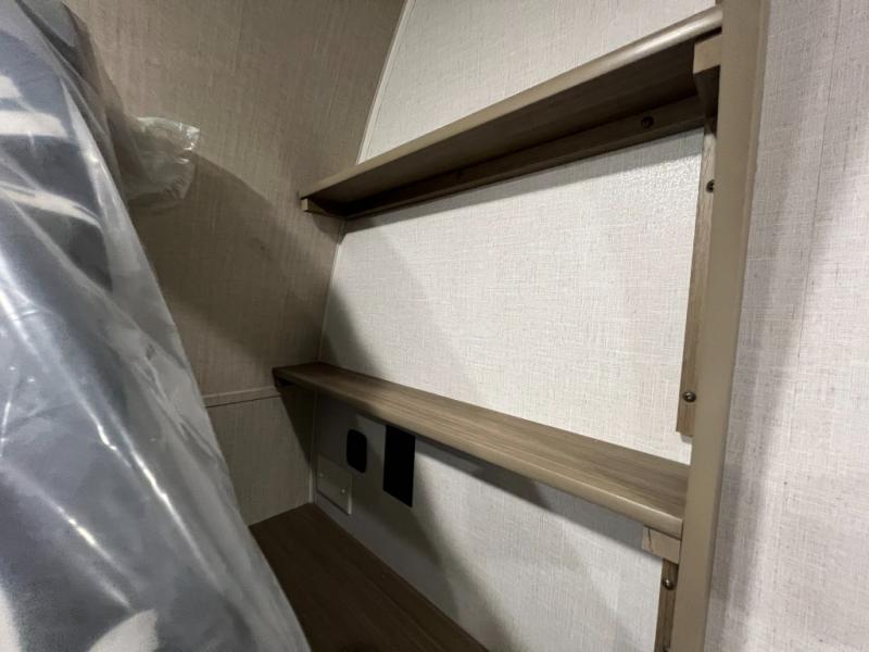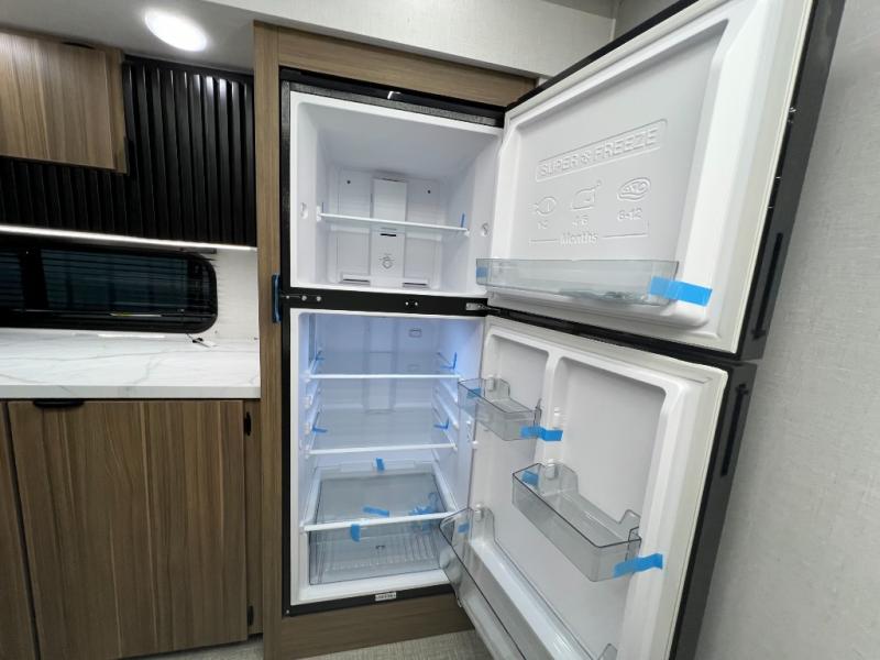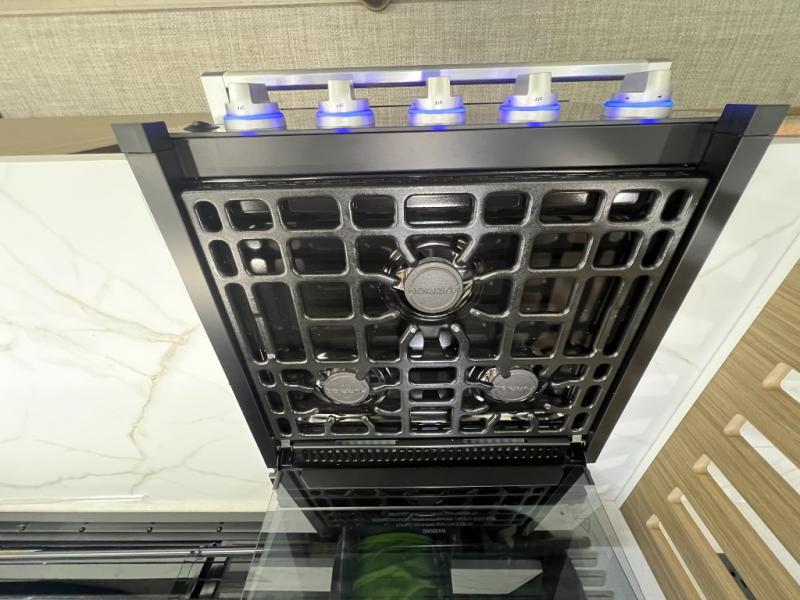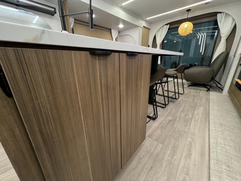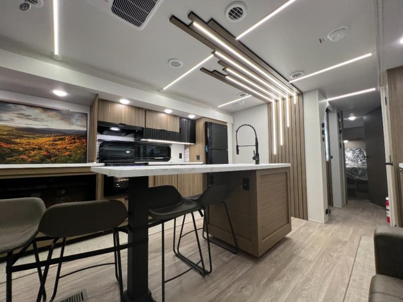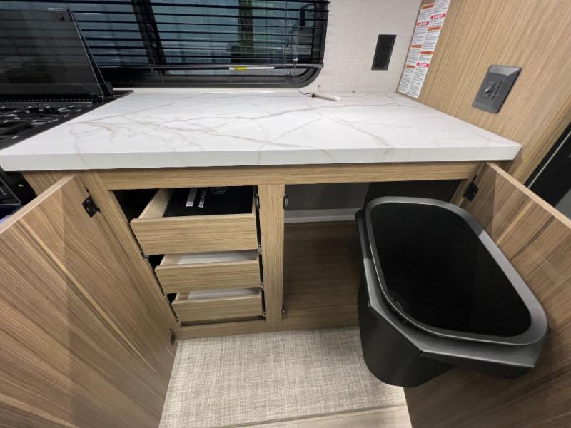 Find your zen int this spacious travel trailer for four! Once you've unloaded your gear, you can head inside to make lunch at the kitchen island with four chairs. An 80" trundle sofa provides additional seating space plus sleeping space for guests. You will love the rear custom recliners that are conveniently located next to the fireplace. The full bath is located towards the front next to the private bedroom so you can easily use the restroom at night, and you're sure to get a great night's rest on the custom king bed with Versa Tilt. This unit also includes washer and dryer prep, giving you the option to add these appliances.