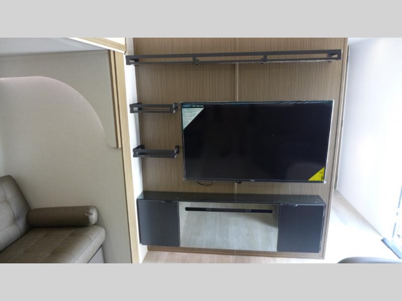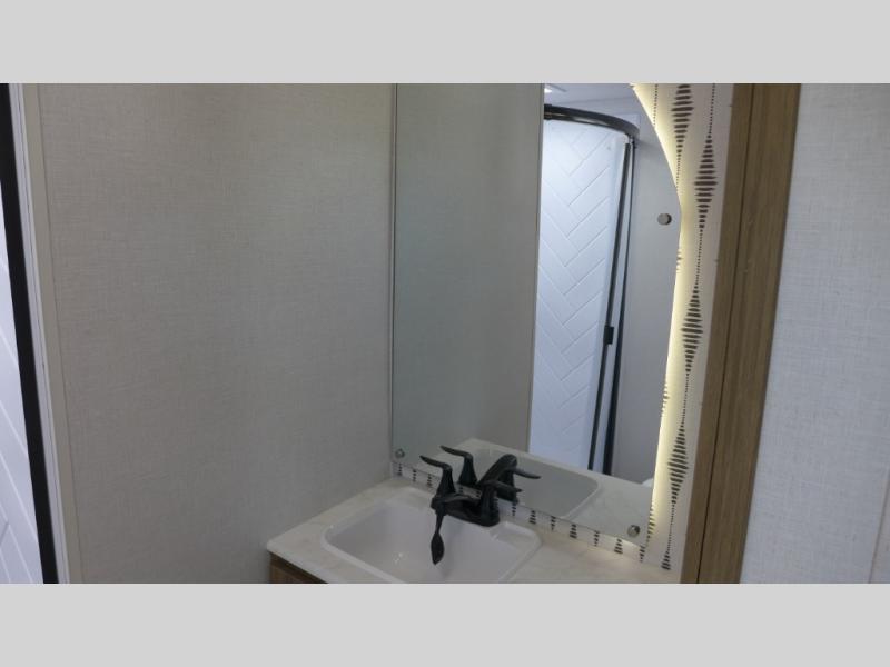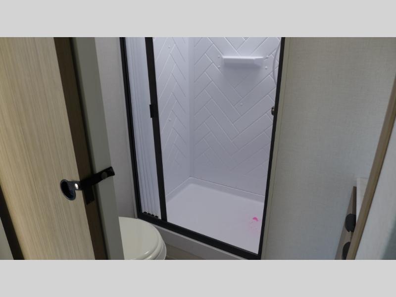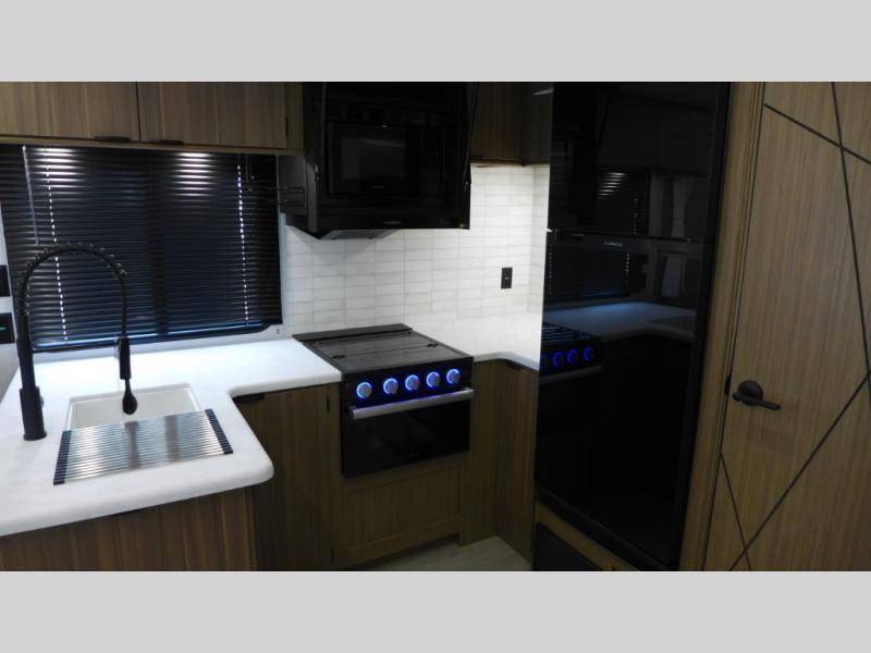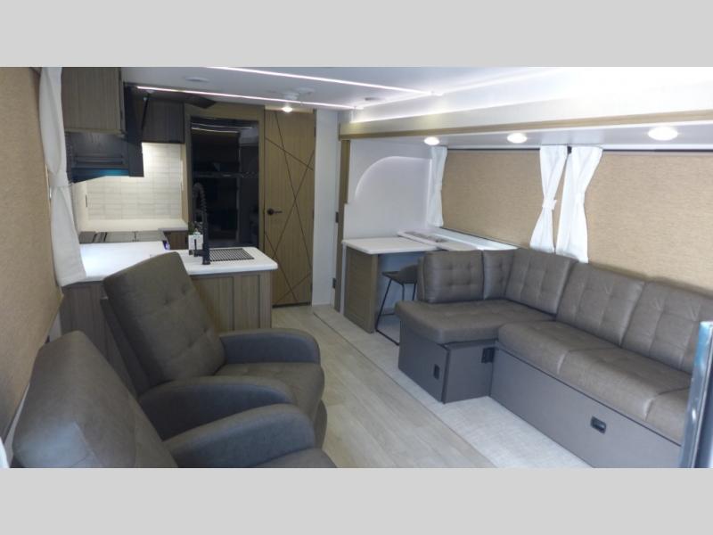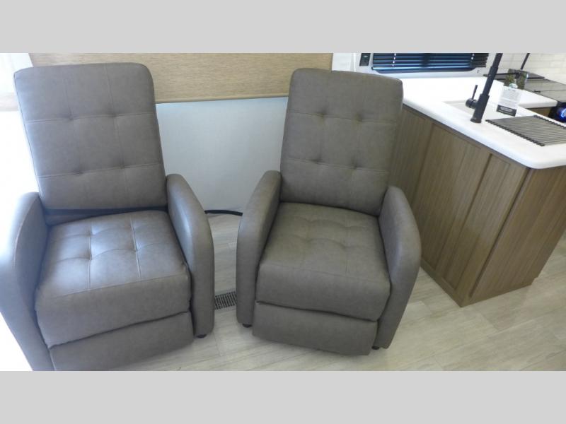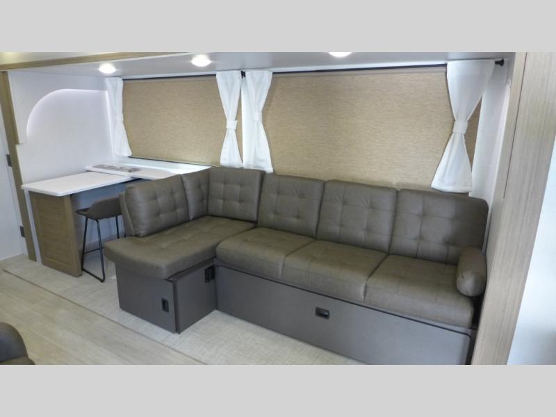 With a spacious kitchen and panoramic windows, this travel trailer is sure to stand out! The L-shaped sofa, dual lounge chairs, and Versa Flex table give you many seating options. You can either cook a delicious meal in the rear kitchen or you can use the exterior camp kitchen to breathe in some fresh air while you cook. After a fun-filled day, you can rinse off in the walk-in shower then head to the front private bedroom, grab your pajamas from the closet, and lay down on the custom king bed with Versa Tilt for a good night's rest!