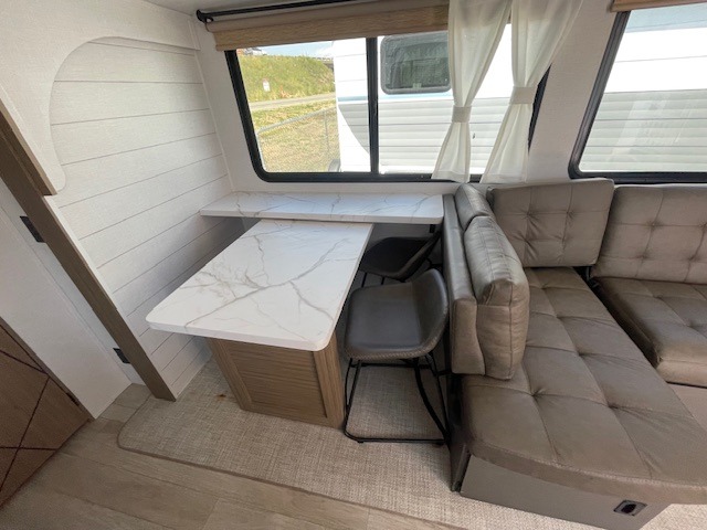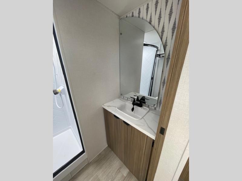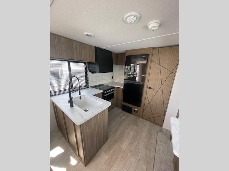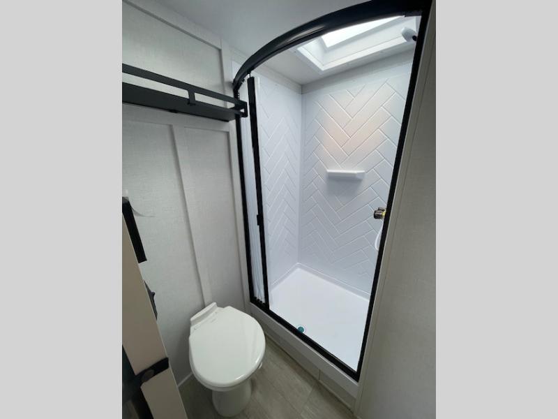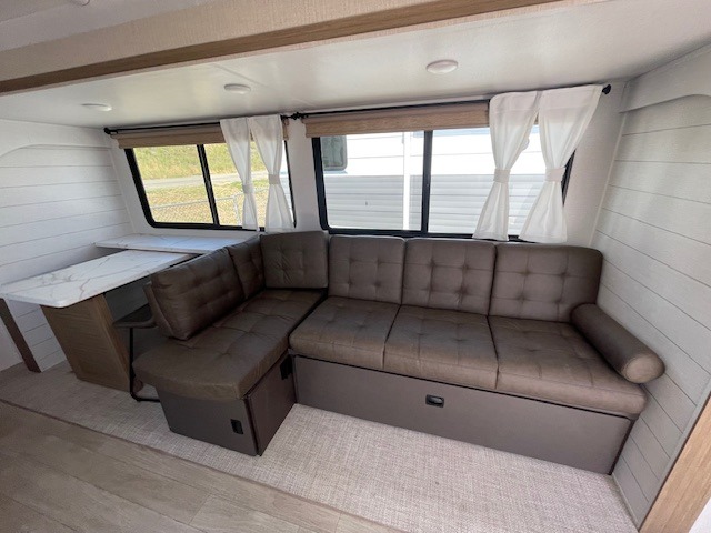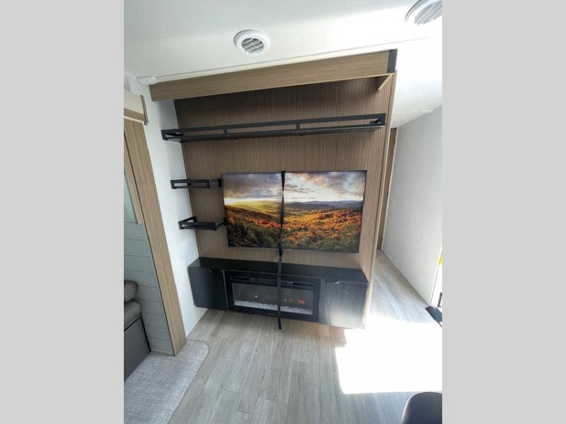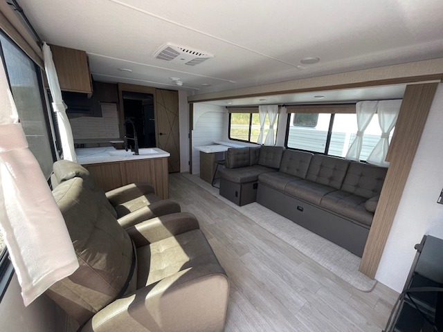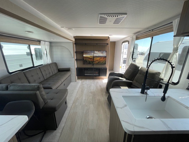 With a spacious kitchen and panoramic windows, this travel trailer is sure to stand out! The L-shaped sofa, dual lounge chairs, and Versa Flex table give you many seating options. You can either cook a delicious meal in the rear kitchen or you can use the exterior camp kitchen to breathe in some fresh air while you cook. After a fun-filled day, you can rinse off in the walk-in shower then head to the front private bedroom, grab your pajamas from the closet, and lay down on the custom king bed with Versa Tilt for a good night's rest!