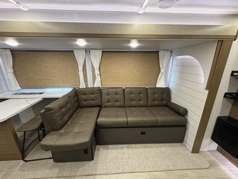 With a spacious kitchen and panoramic windows, this travel trailer is sure to stand out! The L-shaped sofa, dual lounge chairs, and Versa Flex table give you many seating options. You can either cook a delicious meal in the rear kitchen or you can use the exterior camp kitchen to breathe in some fresh air while you cook. After a fun-filled day, you can rinse off in the walk-in shower then head to the front private bedroom, grab your pajamas from the closet, and lay down on the custom king bed with Versa Tilt for a good night's rest!