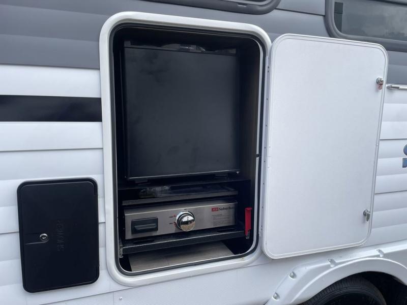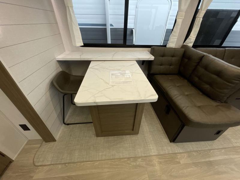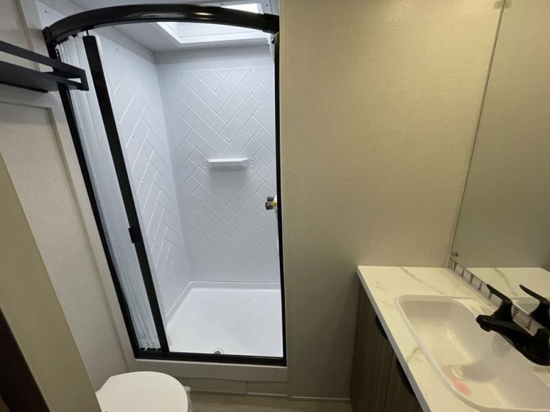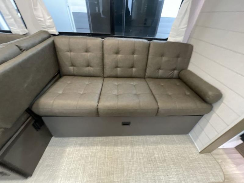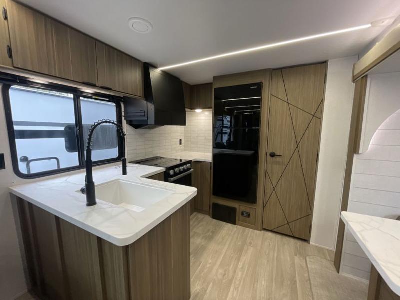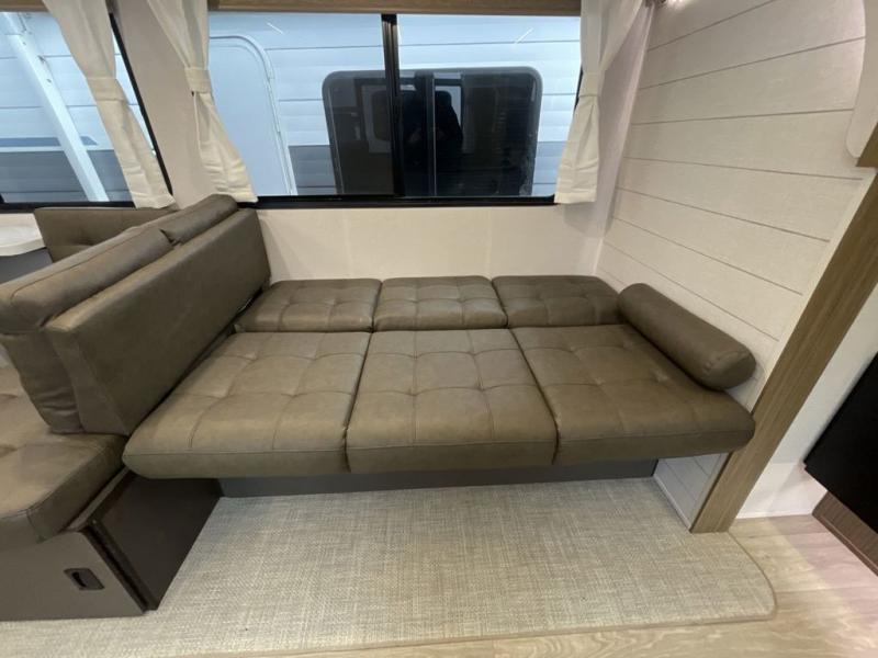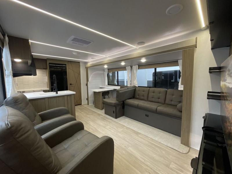 With a spacious kitchen and panoramic windows, this travel trailer is sure to stand out! The L-shaped sofa, dual lounge chairs, and Versa Flex table give you many seating options. You can either cook a delicious meal in the rear kitchen or you can use the exterior camp kitchen to breathe in some fresh air while you cook. After a fun-filled day, you can rinse off in the walk-in shower then head to the front private bedroom, grab your pajamas from the closet, and lay down on the custom king bed with Versa Tilt for a good night's rest!