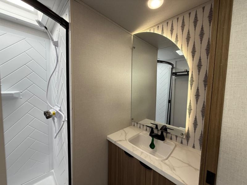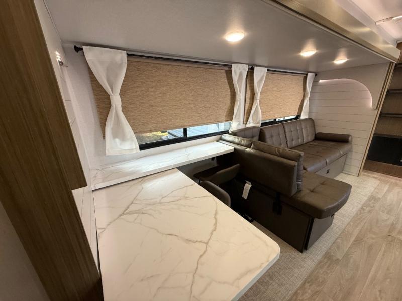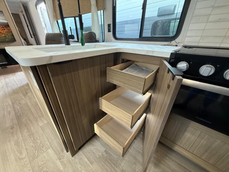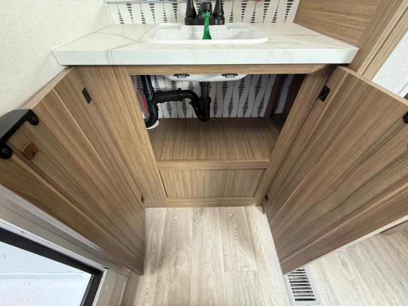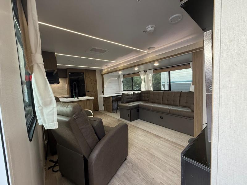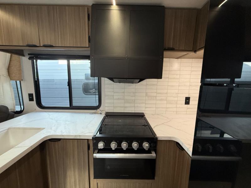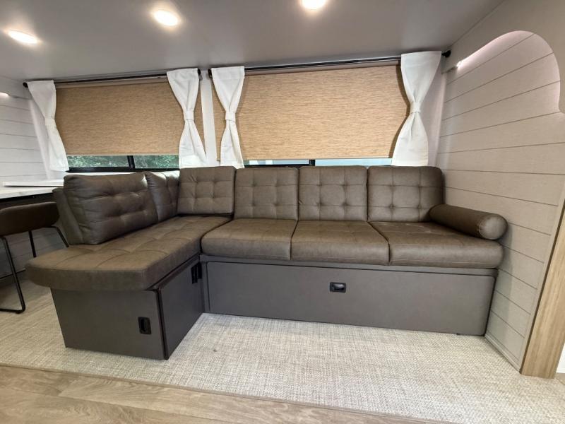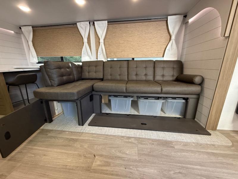 With a spacious kitchen and panoramic windows, this travel trailer is sure to stand out! The L-shaped sofa, dual lounge chairs, and Versa Flex table give you many seating options. You can either cook a delicious meal in the rear kitchen or you can use the exterior camp kitchen to breathe in some fresh air while you cook. After a fun-filled day, you can rinse off in the walk-in shower then head to the front private bedroom, grab your pajamas from the closet, and lay down on the custom king bed with Versa Tilt for a good night's rest!