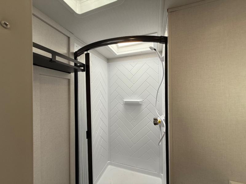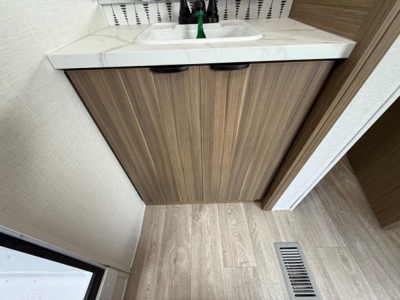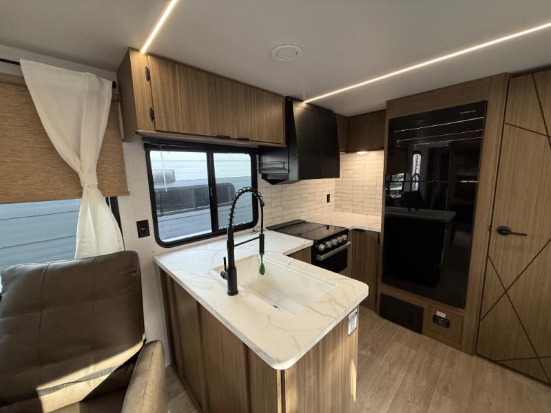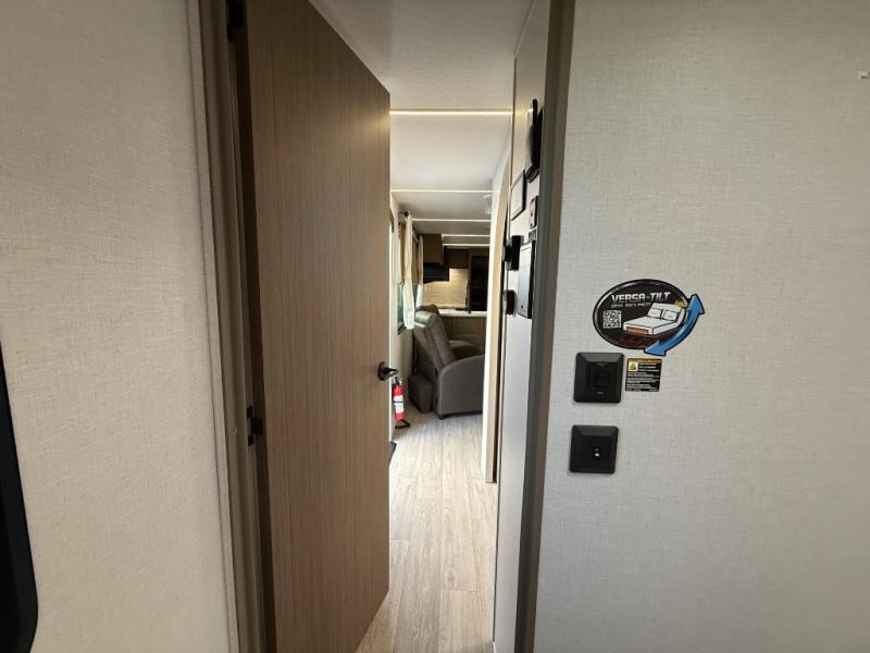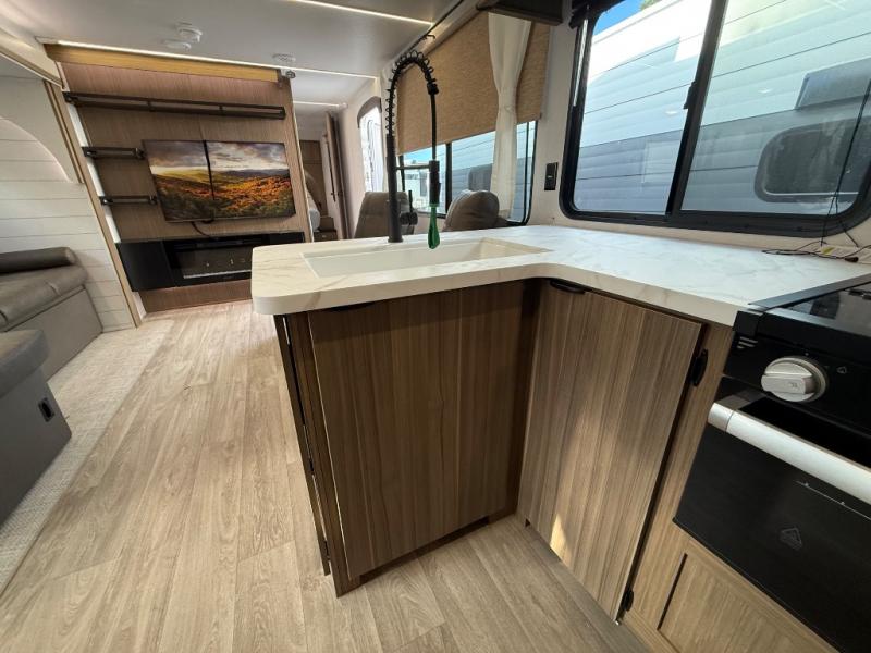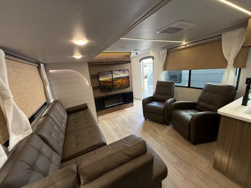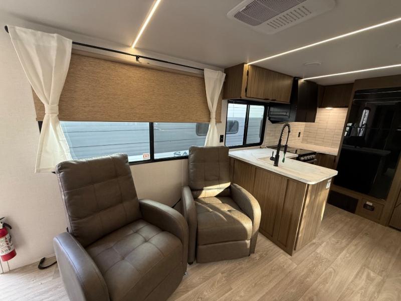 With a spacious kitchen and panoramic windows, this travel trailer is sure to stand out! The L-shaped sofa, dual lounge chairs, and Versa Flex table give you many seating options. You can either cook a delicious meal in the rear kitchen or you can use the exterior camp kitchen to breathe in some fresh air while you cook. After a fun-filled day, you can rinse off in the walk-in shower then head to the front private bedroom, grab your pajamas from the closet, and lay down on the custom king bed with Versa Tilt for a good night's rest!