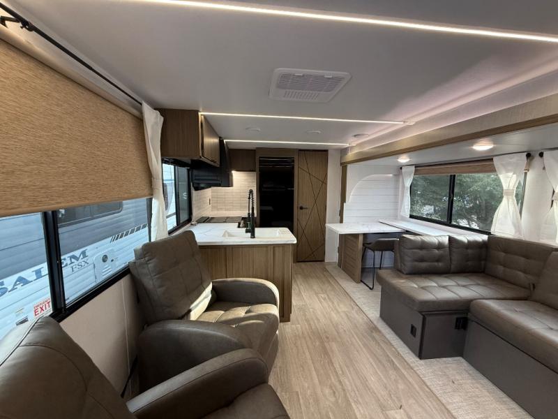 The Salem travel trailers are packed with hassle-free camping amenities! There are a variety of floorplans to choose from between three different regions. The heated and enclosed Accessibelly will help protect against the elements and debris during transport, and the exterior retro/metal redesign is sure to be eye-catching! There are stylish roller shades inside, along with updated backsplash, elegant curtain rods and curtains, plus many more interior comforts! Choose a Salem travel trailer today for quality and value!