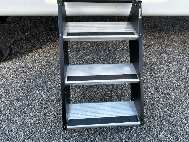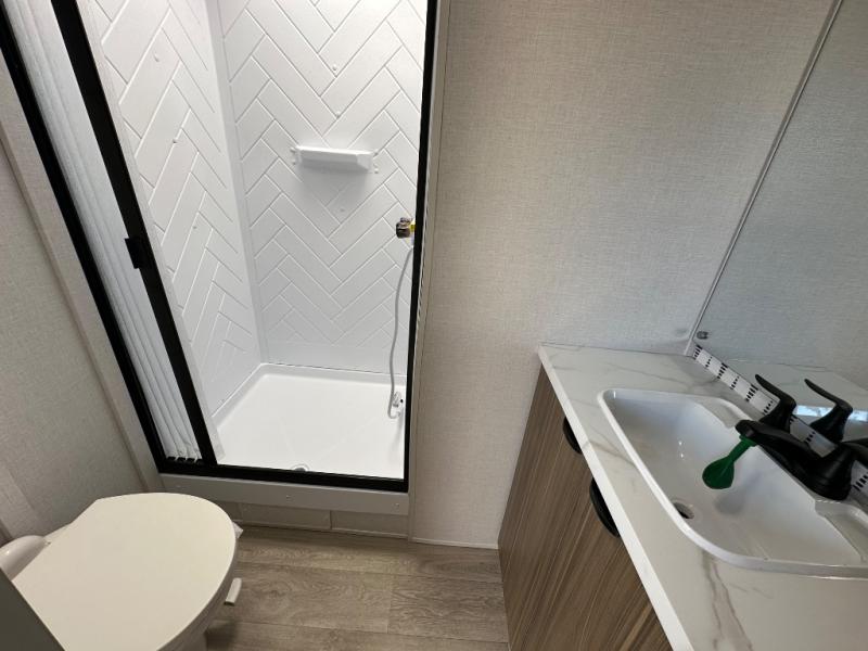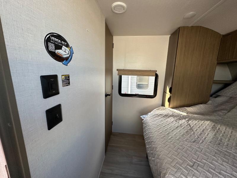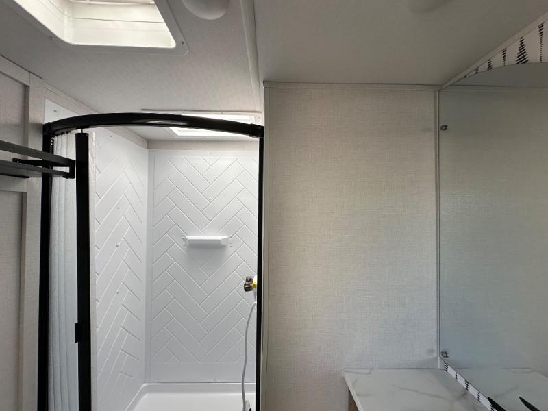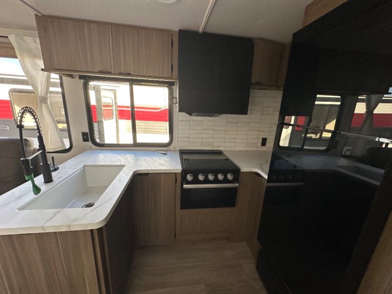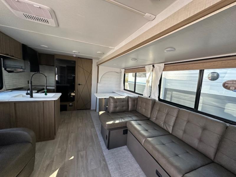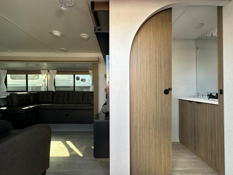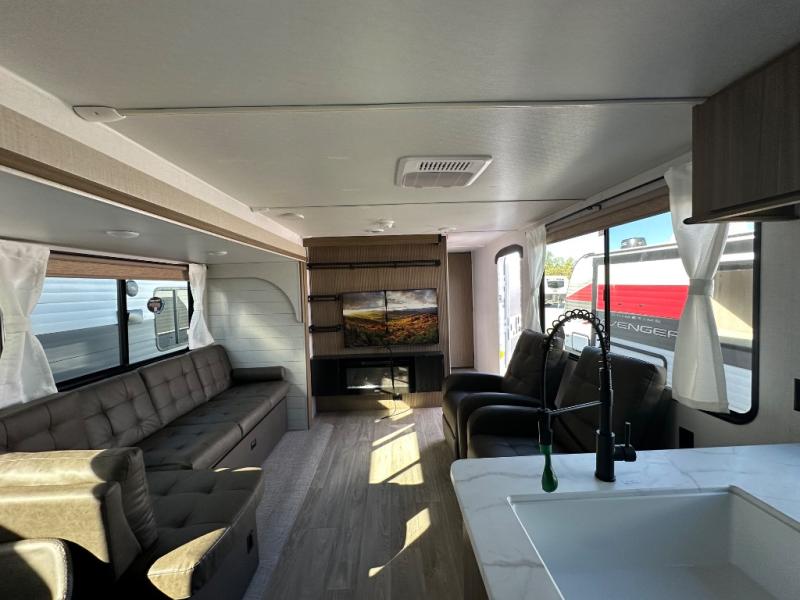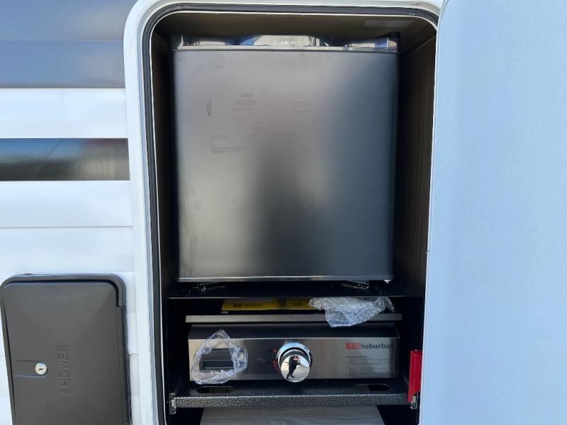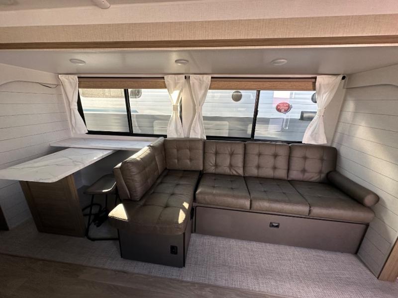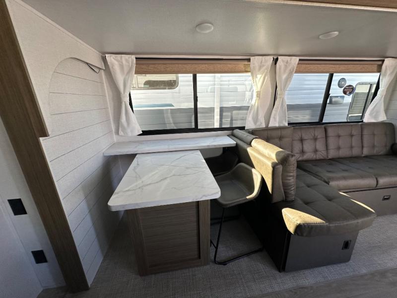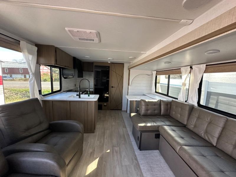 With a spacious kitchen and panoramic windows, this travel trailer is sure to stand out! The L-shaped sofa, dual lounge chairs, and Versa Flex table give you many seating options. You can either cook a delicious meal in the rear kitchen or you can use the exterior camp kitchen to breathe in some fresh air while you cook. After a fun-filled day, you can rinse off in the walk-in shower then head to the front private bedroom, grab your pajamas from the closet, and lay down on the custom king bed with Versa Tilt for a good night's rest!