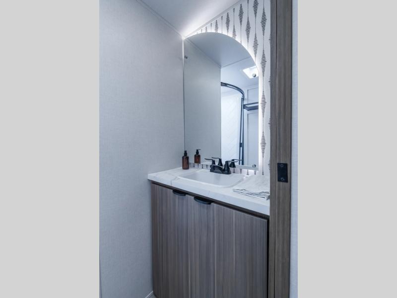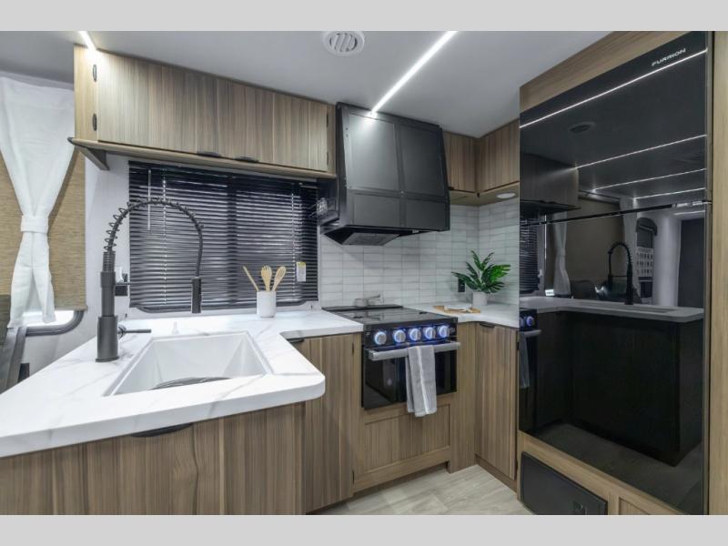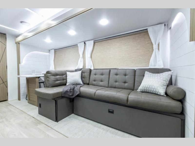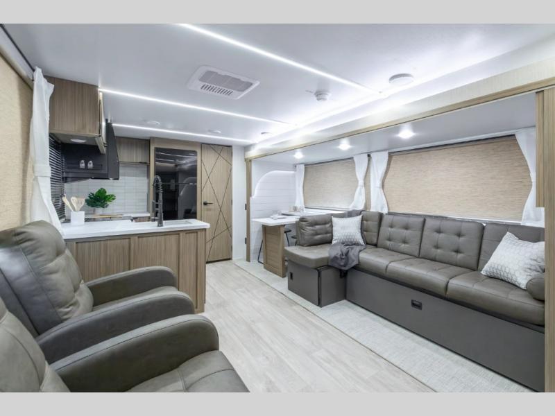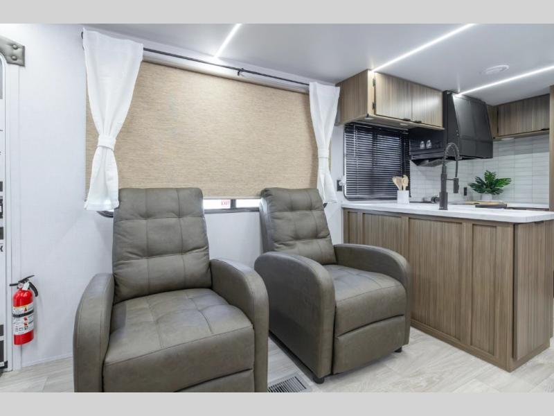 With a spacious kitchen and panoramic windows, this travel trailer is sure to stand out! The L-shaped sofa, dual lounge chairs, and Versa Flex table give you many seating options. You can either cook a delicious meal in the rear kitchen or you can use the exterior camp kitchen to breathe in some fresh air while you cook. After a fun-filled day, you can rinse off in the walk-in shower then head to the front private bedroom, grab your pajamas from the closet, and lay down on the custom king bed with Versa Tilt for a good night's rest!