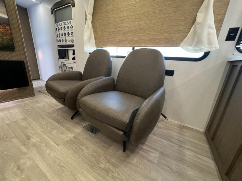 The Salem travel trailers are packed with hassle-free camping amenities! There are a variety of floorplans to choose from between three different regions. The heated and enclosed Accessibelly will help protect against the elements and debris during transport, and the exterior retro/metal redesign is sure to be eye-catching! There are stylish roller shades inside, along with updated backsplash, elegant curtain rods and curtains, plus many more interior comforts! Choose a Salem travel trailer today for quality and value!