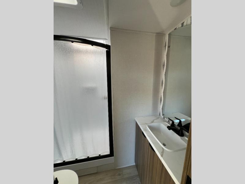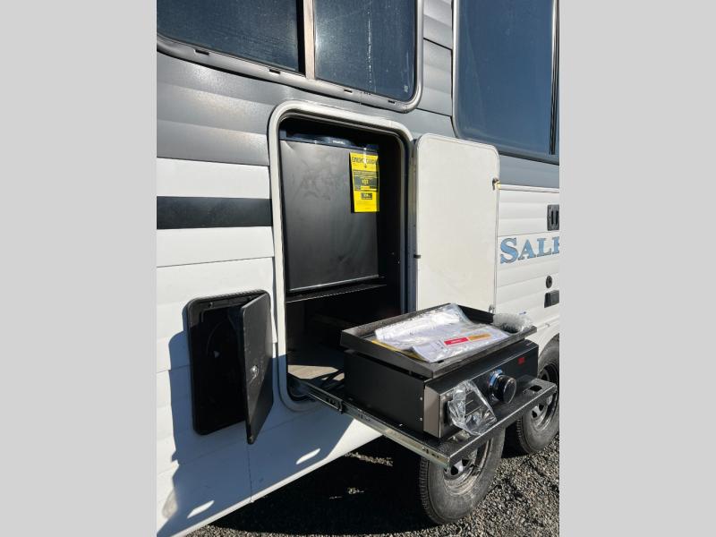 Toward the front, the private bedroom becomes a true retreat with its spacious king bed and thoughtfully designed storage that keeps everything neatly organized for extended stays. The bathroom sits conveniently between the living and sleeping areas, offering a residential-style shower and clean, functional layout. Altogether, the Salem 27RK delivers a balanced blend of comfort, style, and practicality—an ideal choice for travelers who want a refined, move-in-ready space that feels like home wherever they roam.