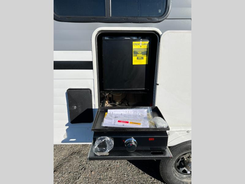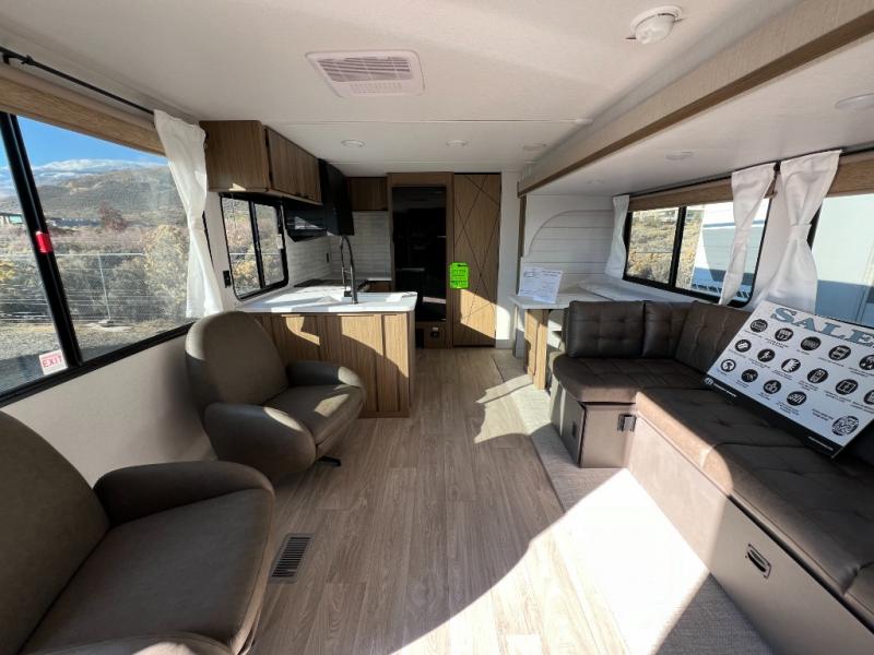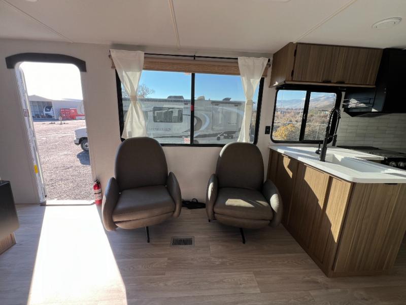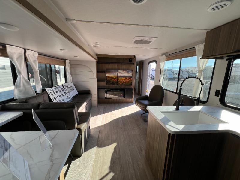Step into the 2026 Salem 27RK and you’re welcomed by a rear kitchen layout that feels both open and beautifully composed, offering generous counter space and a warm flow into the living area. Large windows brighten the space naturally, while the built-in fireplace adds a cozy, residential touch that makes evenings feel relaxed and inviting. The seating arrangement is perfect for quiet mornings or casual gatherings, and the overall design carries the comfortable, lived-in charm of a well-planned home on wheels.