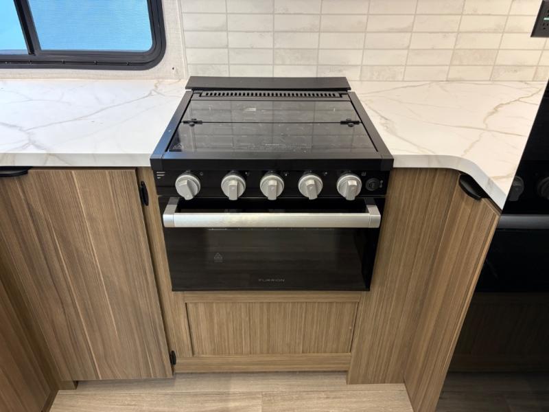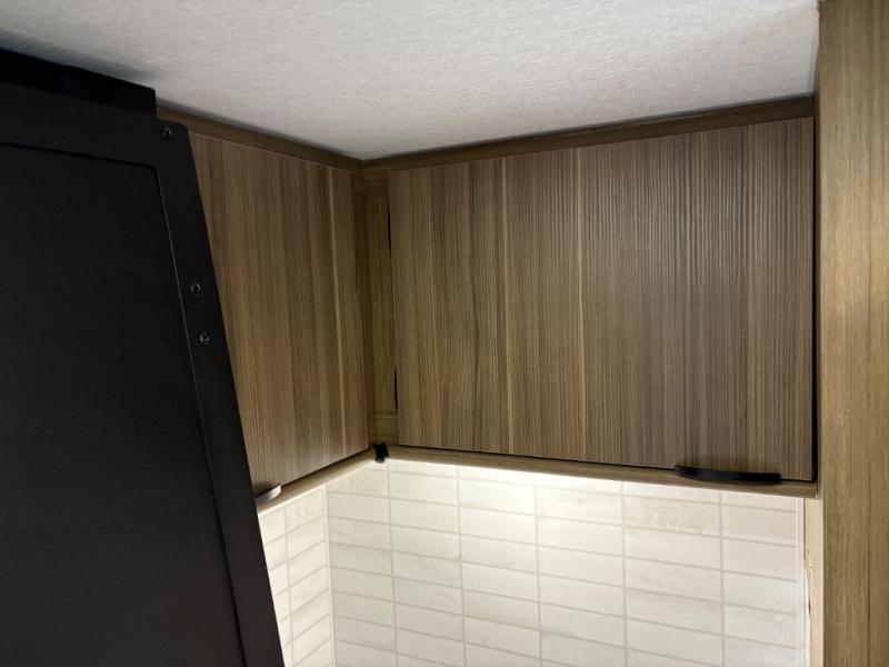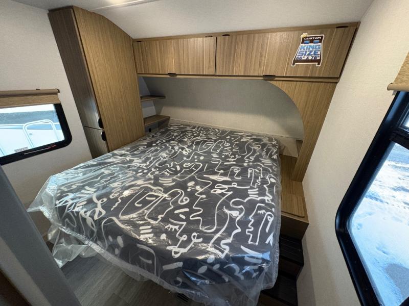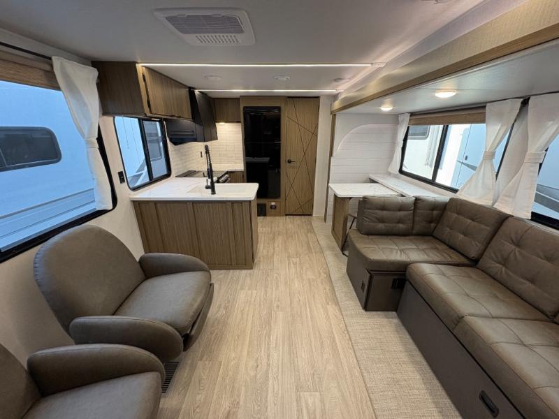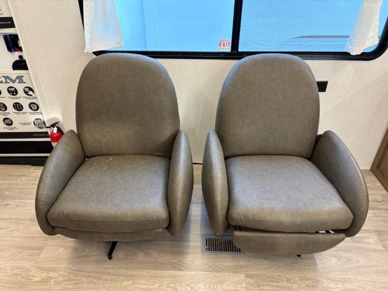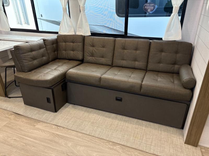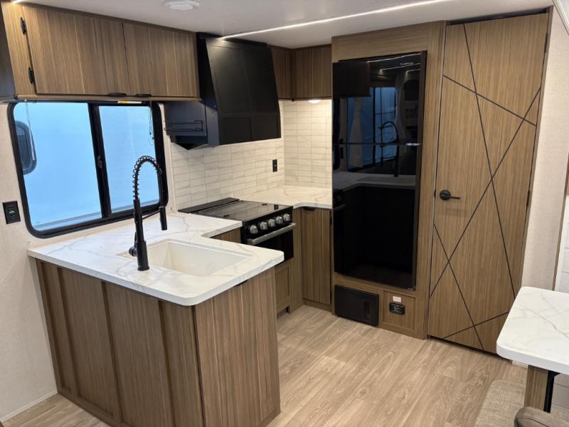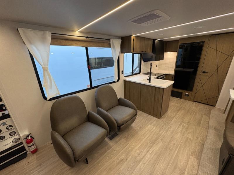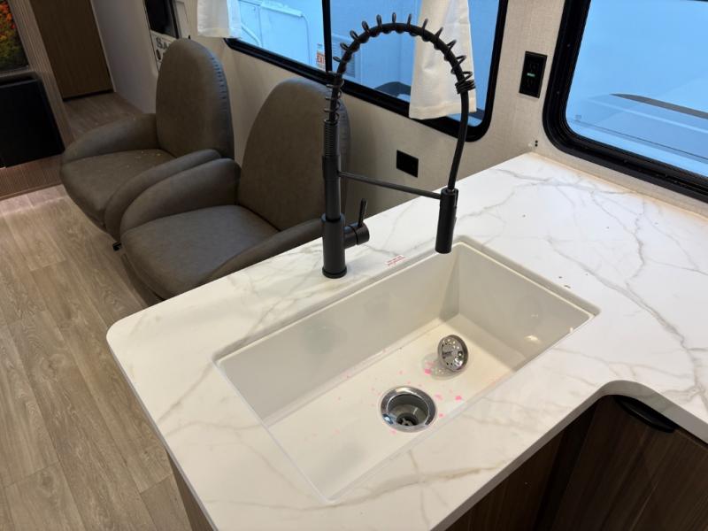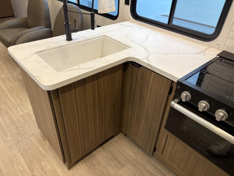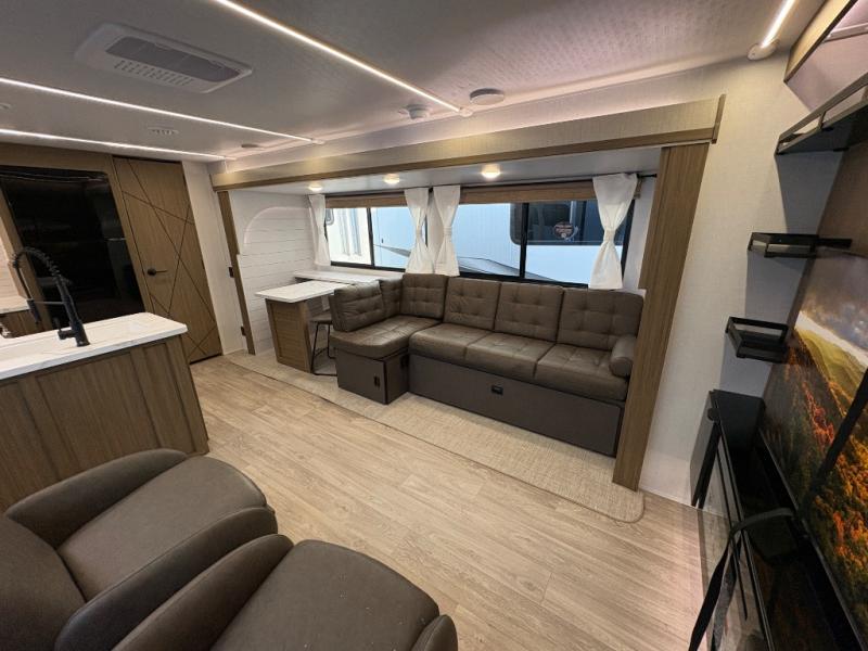 With a spacious kitchen and panoramic windows, this travel trailer is sure to stand out! The L-shaped sofa, dual lounge chairs, and Versa Flex table give you many seating options. You can either cook a delicious meal in the rear kitchen or you can use the exterior camp kitchen to breathe in some fresh air while you cook. After a fun-filled day, you can rinse off in the walk-in shower then head to the front private bedroom, grab your pajamas from the closet, and lay down on the custom king bed with Versa Tilt for a good night's rest!