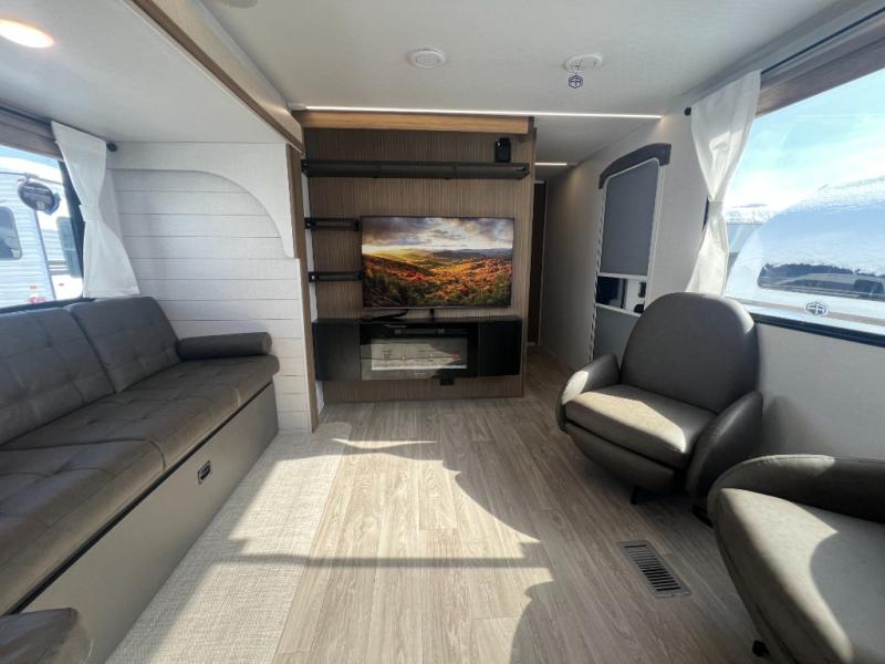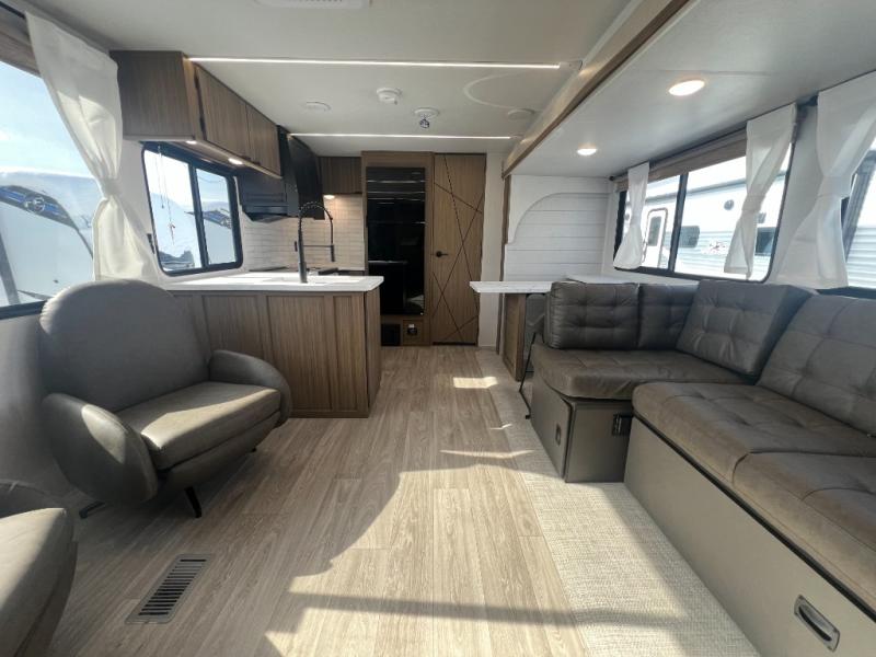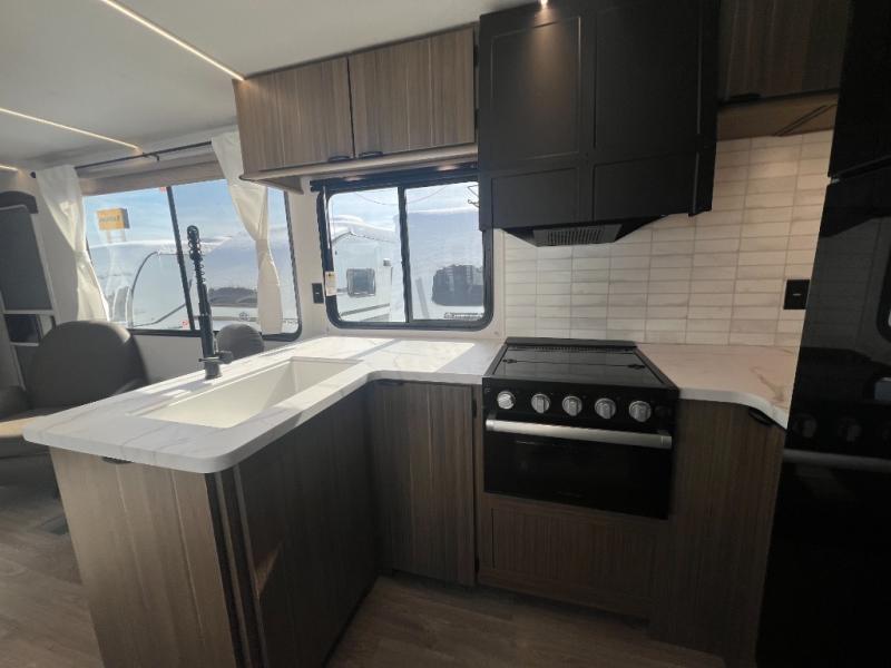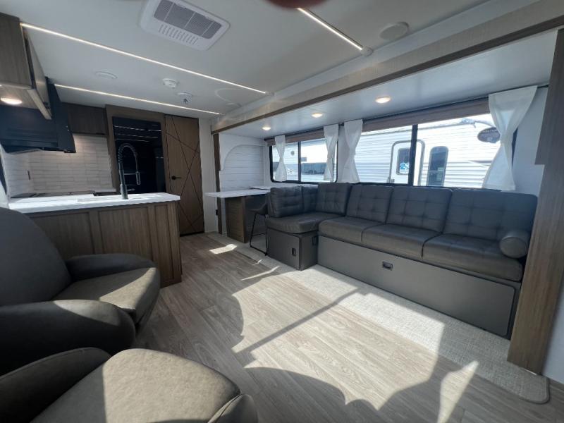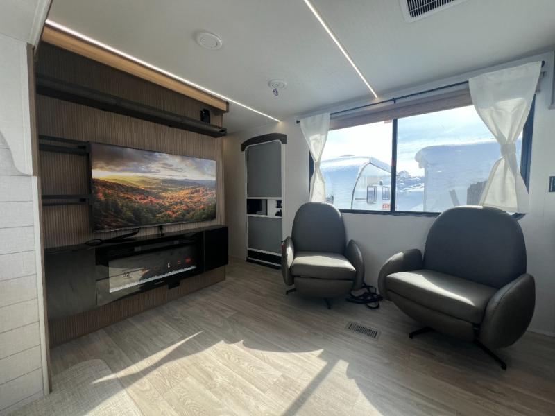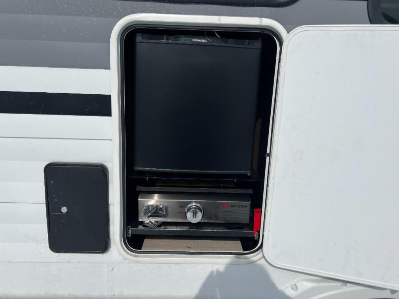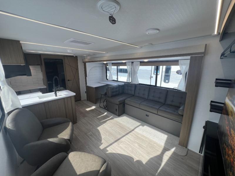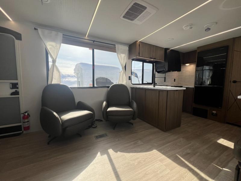 With a spacious kitchen and panoramic windows, this travel trailer is sure to stand out! The L-shaped Versa lounge, dual lounge chairs, and Versa Flex table give you many seating options. You can either cook a delicious meal in the rear kitchen, or you can use the exterior camp kitchen to breathe in some fresh air while you cook. After a fun-filled day, you can rinse off in the walk-in shower then head to the front private bedroom, grab your pajamas from the closet, and lay down on the custom king bed with Versa Tilt for a good night's rest!