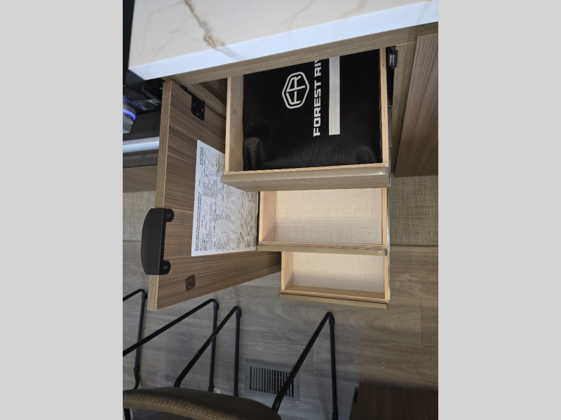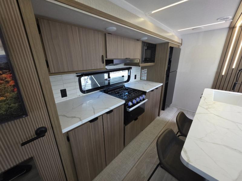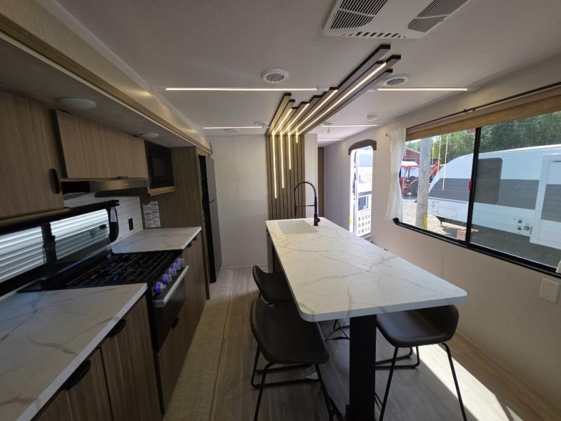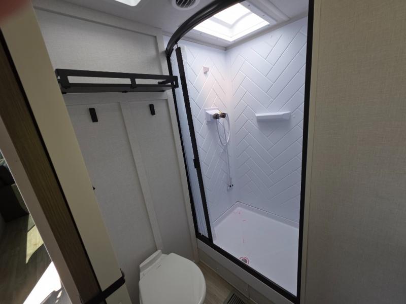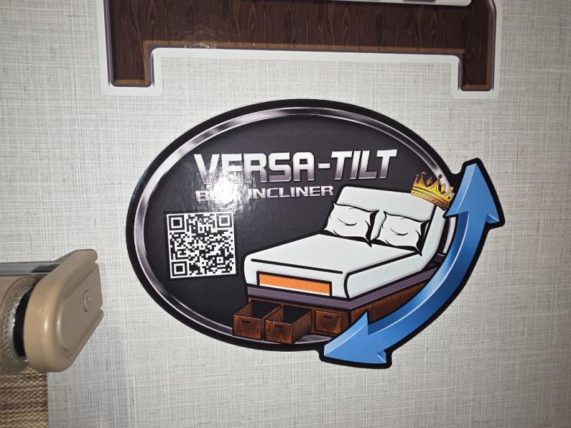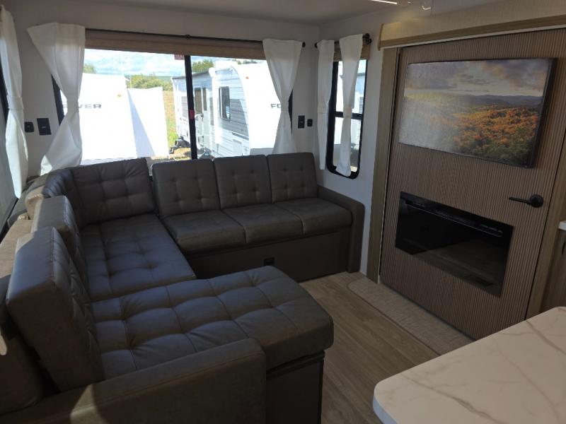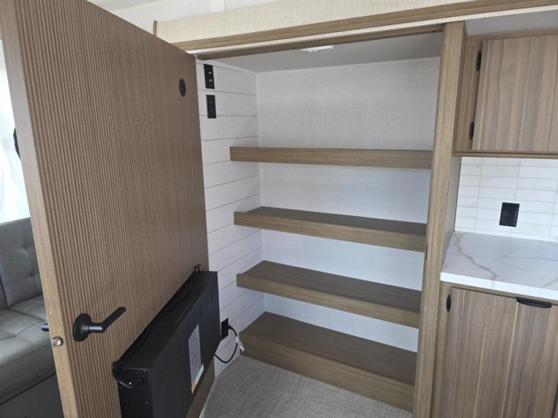 The large slide out in this travel trailer will give your crew more space to relax on the L-shaped sectional sofa, cook and dine at the kitchen island, and grab snacks from the hidden storage behind the hinged entertainment center! The full bath will let you clean up daily without having to use the camp's facilities, and the front private bedroom includes a custom king bed with Versa Tilt so you can read in bed at night. There is also a wardrobe and overhead cabinet plus a closet with washer and dryer prep if you choose to add these appliances.
