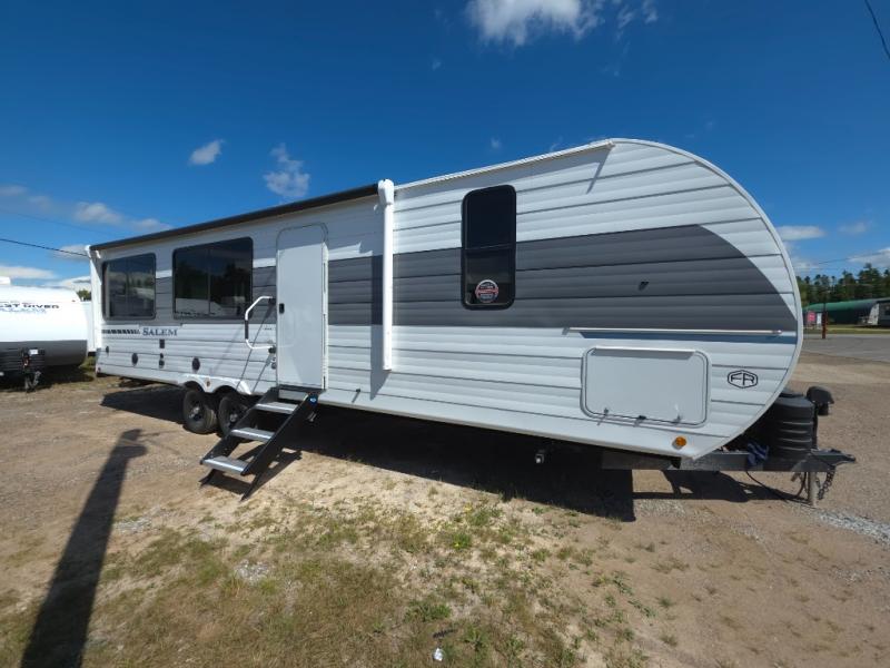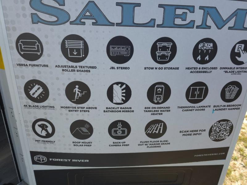 The Salem travel trailers are packed with hassle-free camping amenities and there are a variety of floorplans to choose from. The heated and enclosed Accessibelly will help protect against the elements and debris during transport, and the exterior retro/metal redesign is sure to be eye-catching! There are stylish roller shades inside, along with updated backsplash, elegant curtain rods and curtains, plus many more interior comforts! Choose a Salem travel trailer today for quality and value!