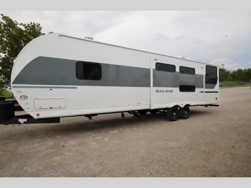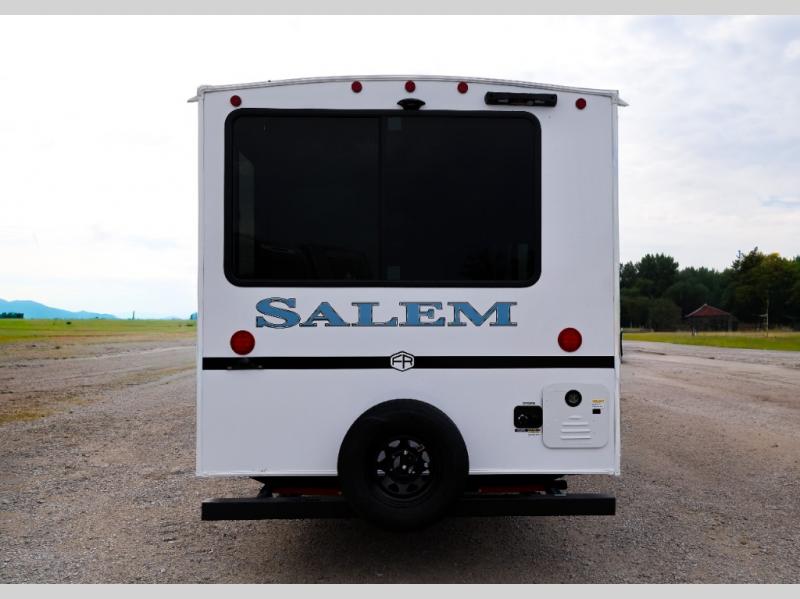 The Salem travel trailers are packed with hassle-free camping amenities and there are a variety of floorplans to choose from. The heated and enclosed Accessibelly will help protect against the elements and debris during transport, and the exterior retro/metal redesign is sure to be eye-catching! There are stylish roller shades inside, along with updated backsplash, elegant curtain rods and curtains, plus many more interior comforts! Choose a Salem travel trailer today for quality and value!