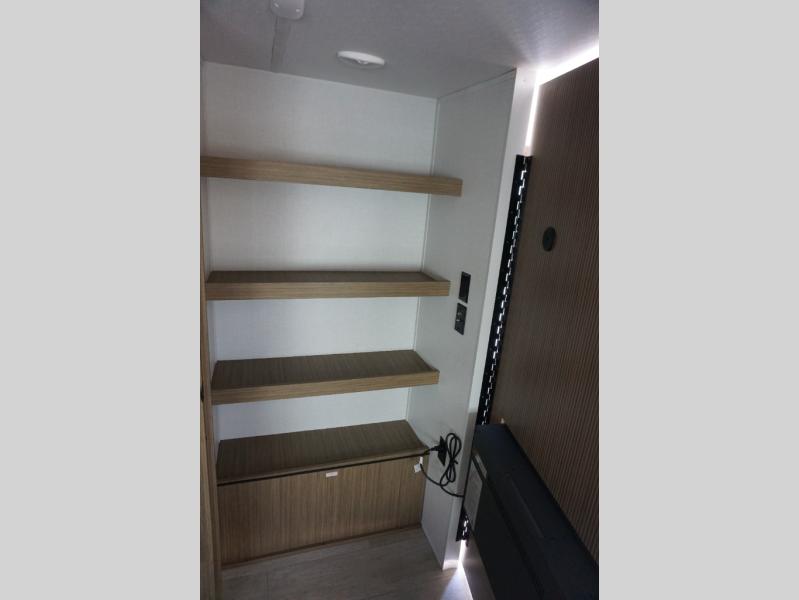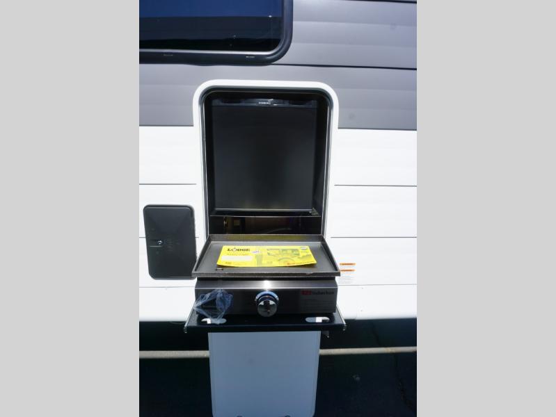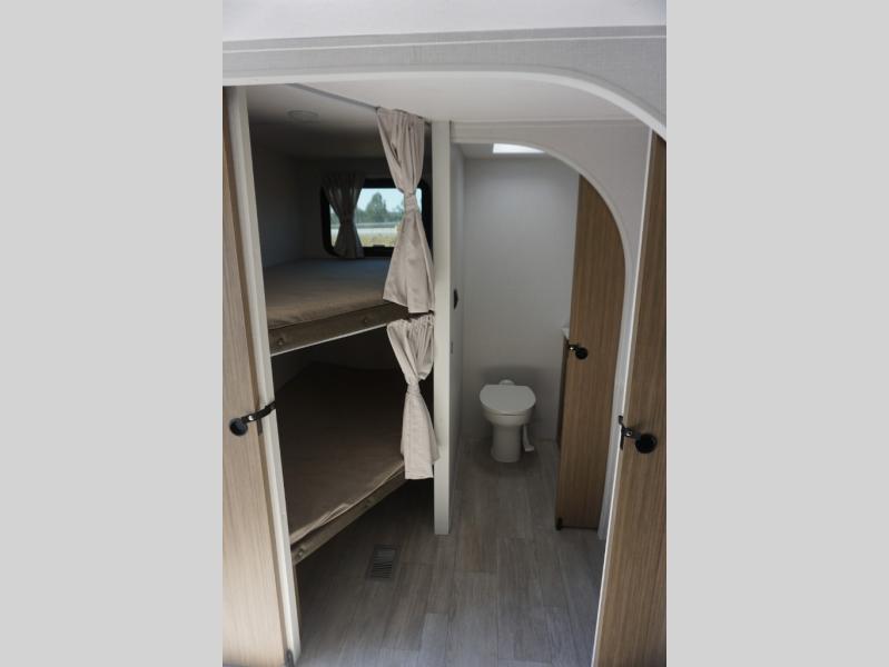 When you're ready to upgrade your RV to a unit with more sleeping space and comfort, choose this Salem travel trailer, and you'll never look back. After setting up camp, put out the large slide and prepare lunch indoors or outside at the outdoor kitchen, and the 20' power awning will shade you from the sun. The kids will find all their snacks in the hidden pantry behind the entertainment center, and their drinks in the oversized fridge. This model features a rear private bunkhouse with a set of double-size bunks, a desk and a half bath. You will also love the front private bedroom that includes a custom king with Versa Tilt bed and dual bedside closets with nightstands below.