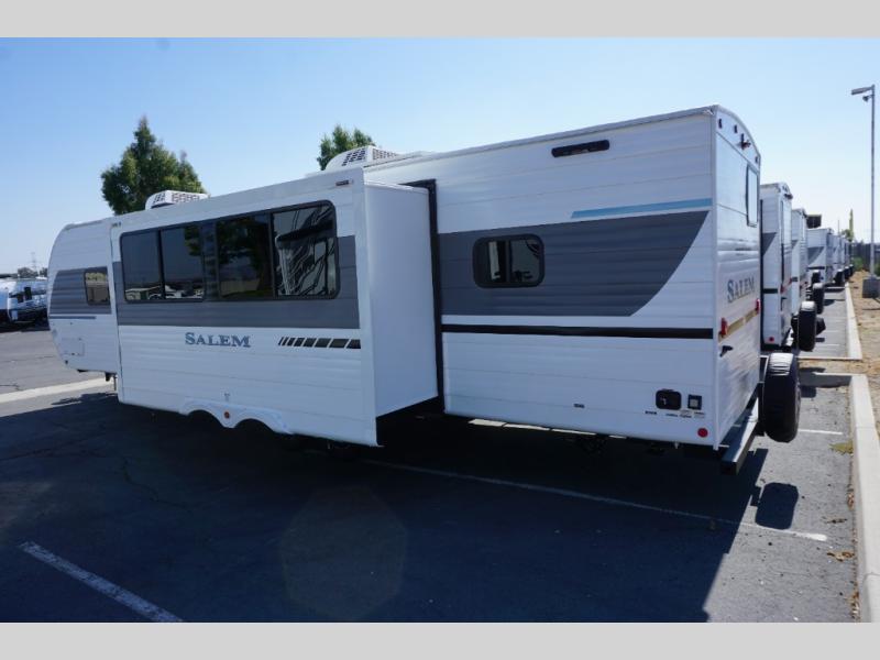 The Salem travel trailers are packed with hassle-free camping amenities! There are a variety of floorplans to choose from between three different regions. The heated and enclosed Accessibelly will help protect against the elements and debris during transport, and the exterior retro/metal redesign is sure to be eye-catching! There are stylish roller shades inside, along with updated backsplash, elegant curtain rods and curtains, plus many more interior comforts! Choose a Salem travel trailer today for quality and value!